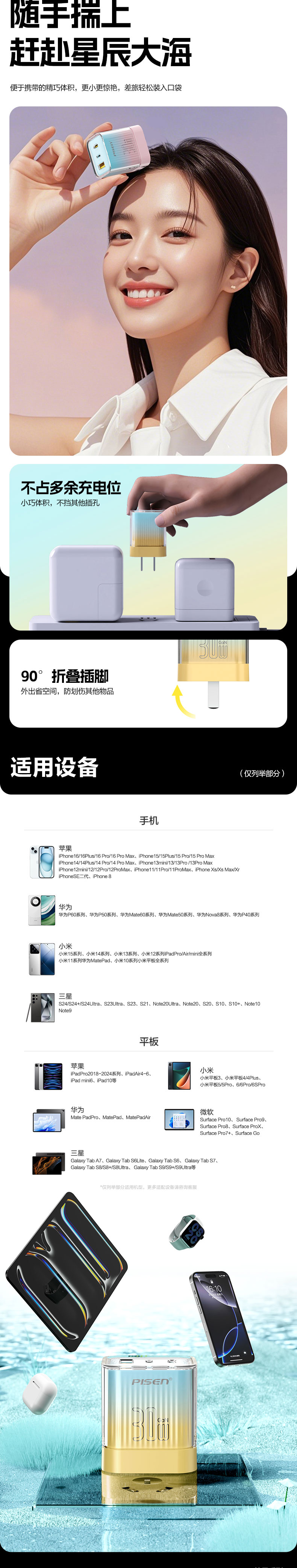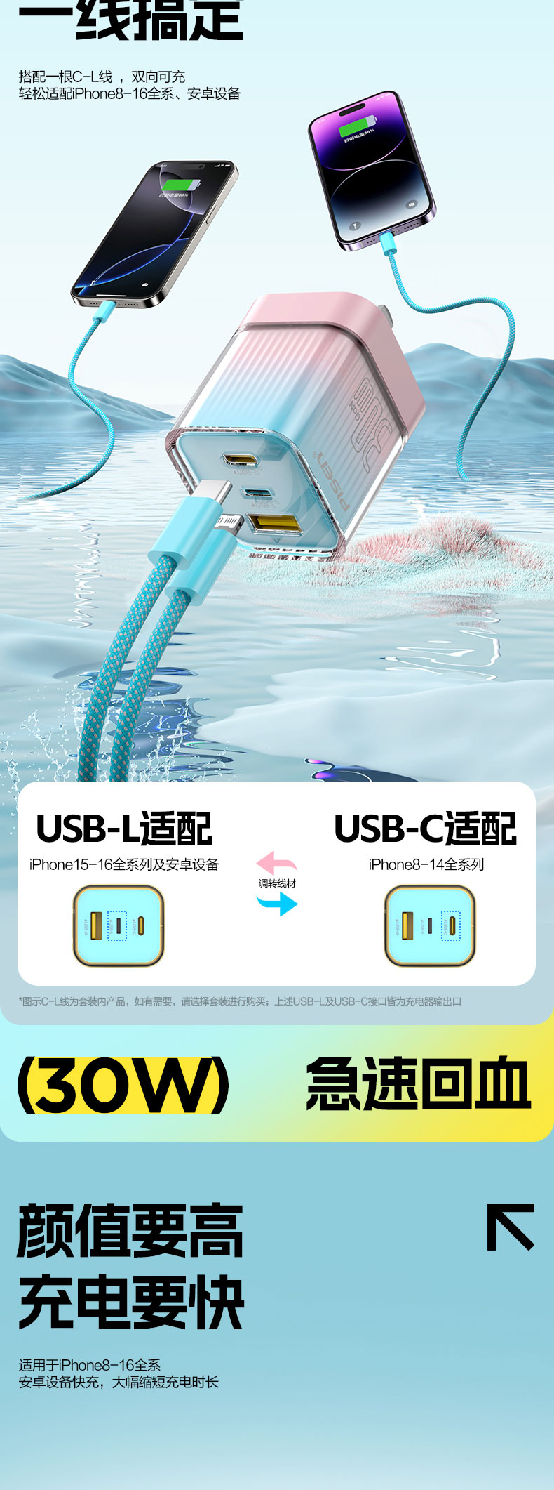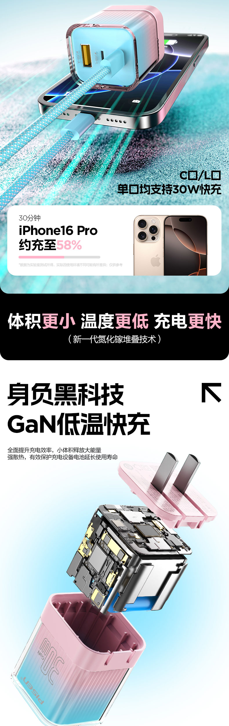 品胜 小方块充电器套装氮化镓 支持PD30W苹果PD快充 苹果15/16快充头