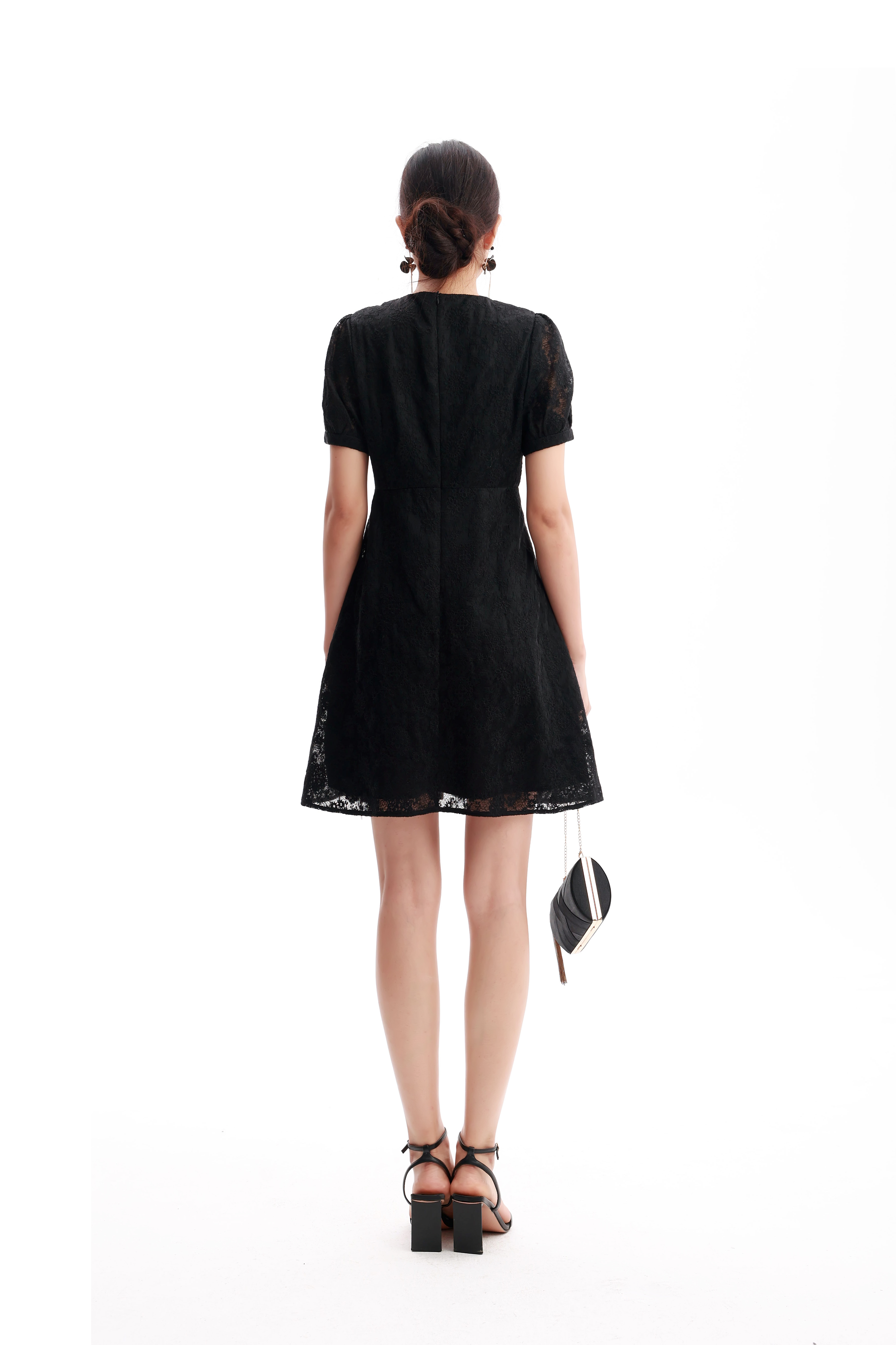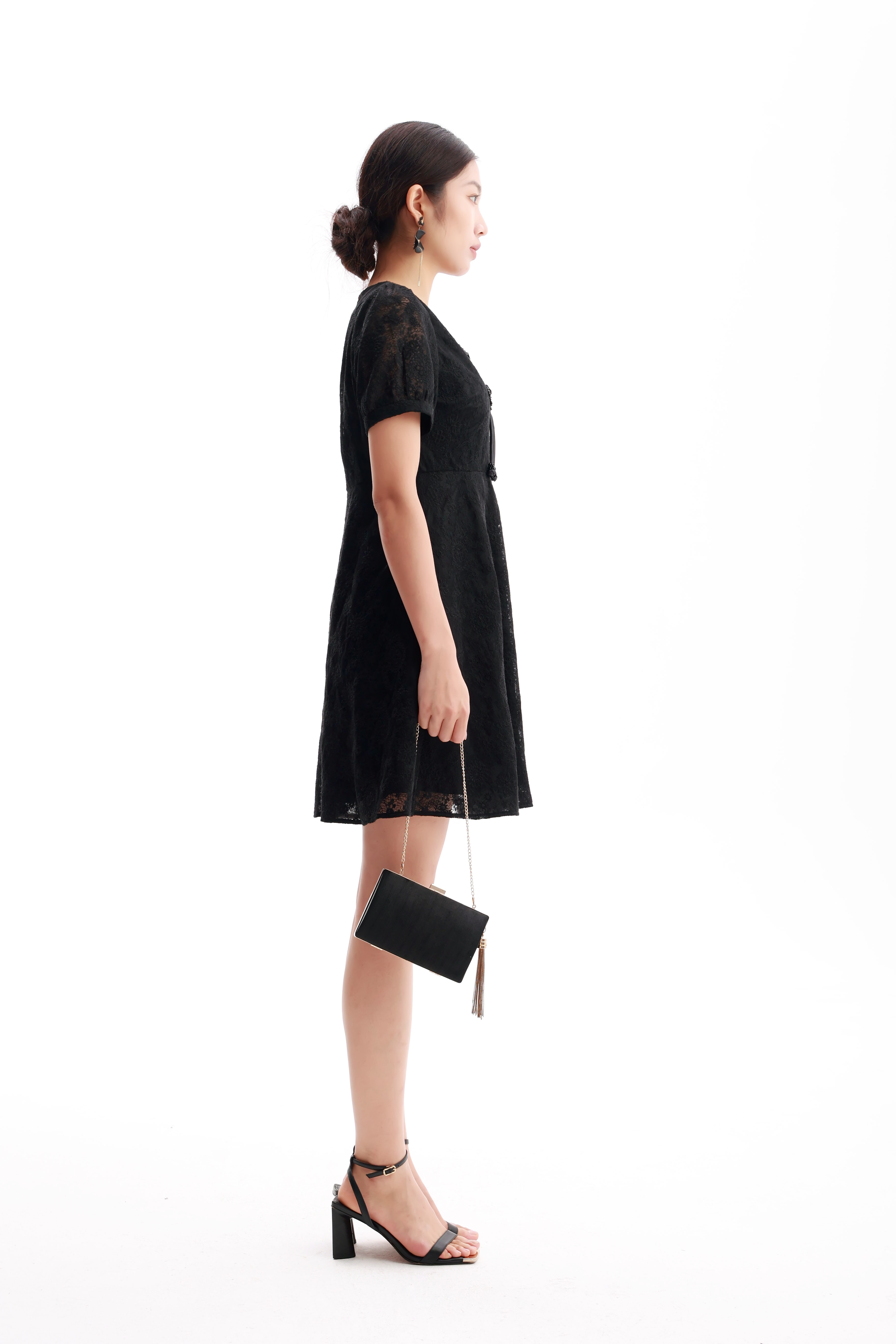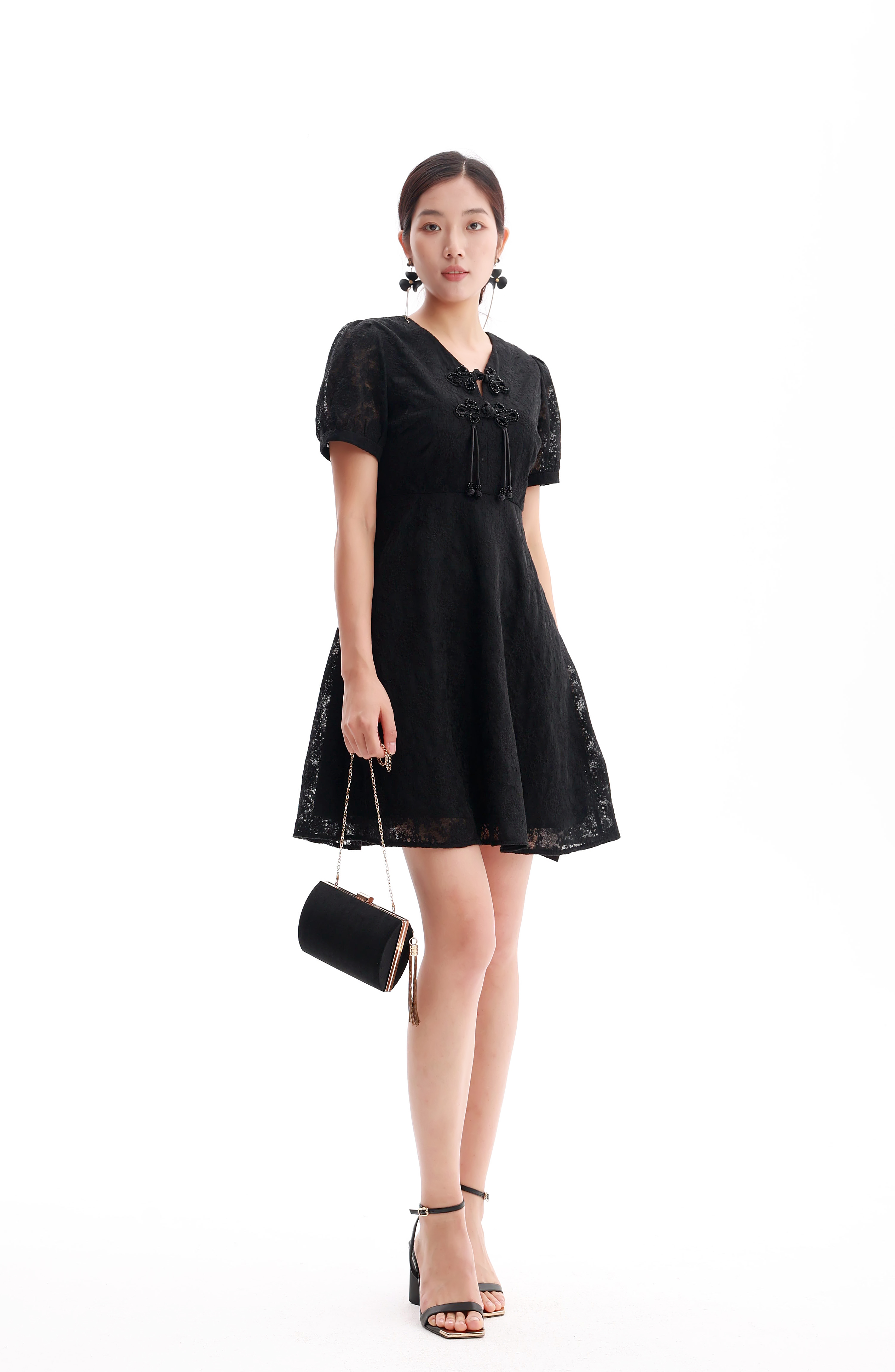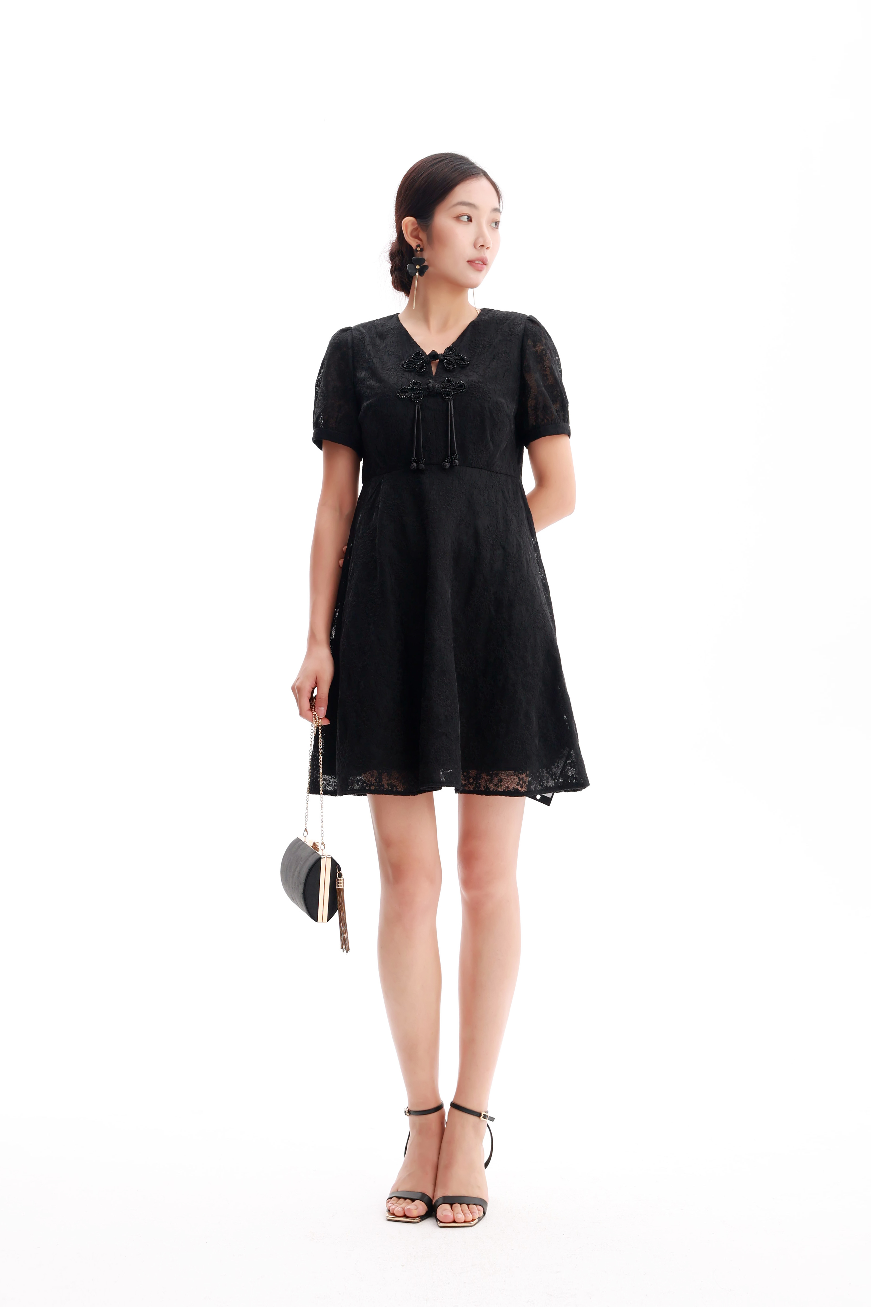 HJ2S38_漆黑色_连衣裙_春夏_复古蕾丝提花 V 领盘扣高腰显瘦通勤气质连衣裙_高级女装_BERNIEELEN 伯妮斯茵