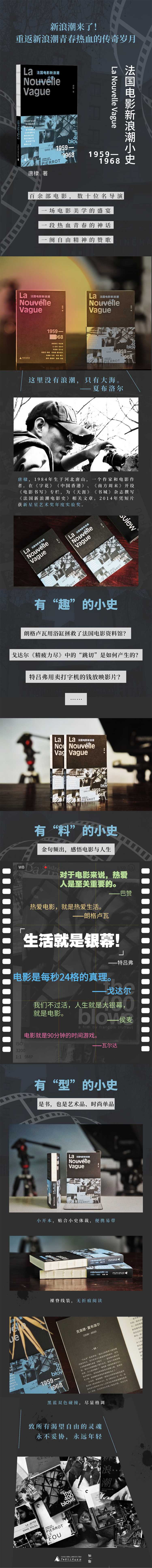 ???本书是一部关于法国电影新浪潮的文化随笔,以通俗易懂的语言描写了1959年至1968年法国影响深远的电影新浪潮运动。二十世纪五六十年代,一群年轻的影评人拿起摄影机,向僵化的传统电影宣战,提倡;作者策略,呼吁用电影记录真实的生命体验。由此,掀起了一场颠覆银幕的新浪潮运动。作者以蒙太奇般的笔触为读者剪辑出新浪潮光辉的历史影像,如特吕弗《四百击》对规则禁锢的突围,戈达尔《精疲力尽》中;跳切的实验手法,瓦尔达《天涯沦落女》中对自由的决绝追求这本;小史不仅在讲;电影史,更在讲一种关于自由、创新、永不妥协的新浪潮精神。