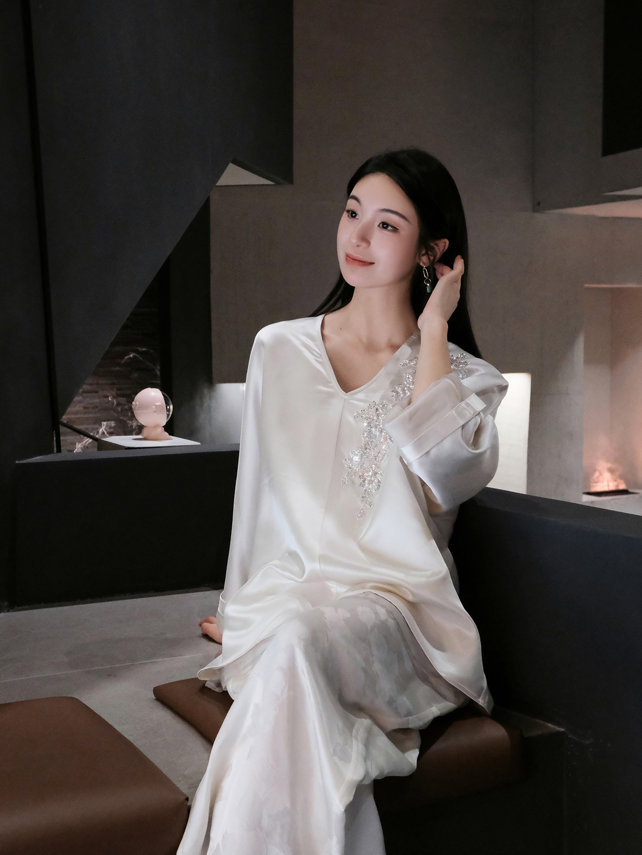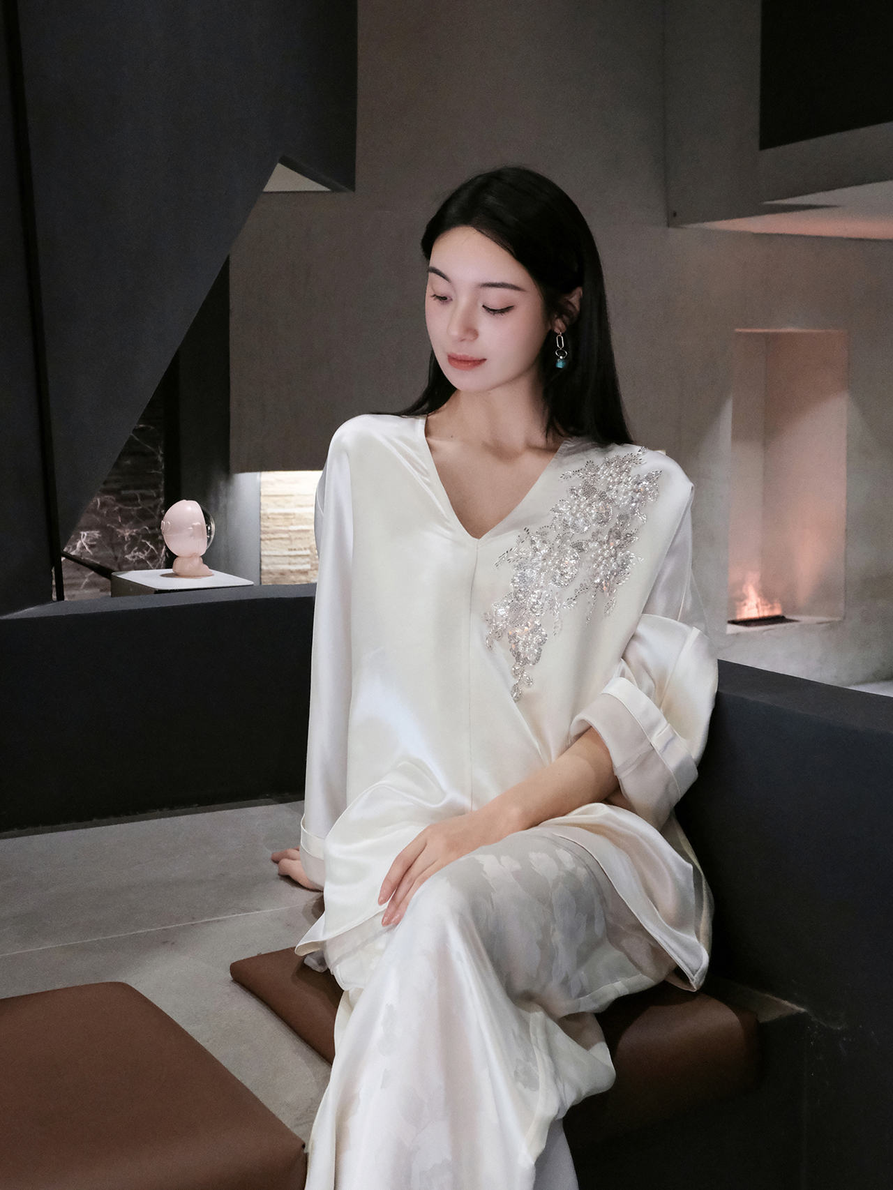 盛唐牡丹 | 法式串珠丝毛V领上衣-白色