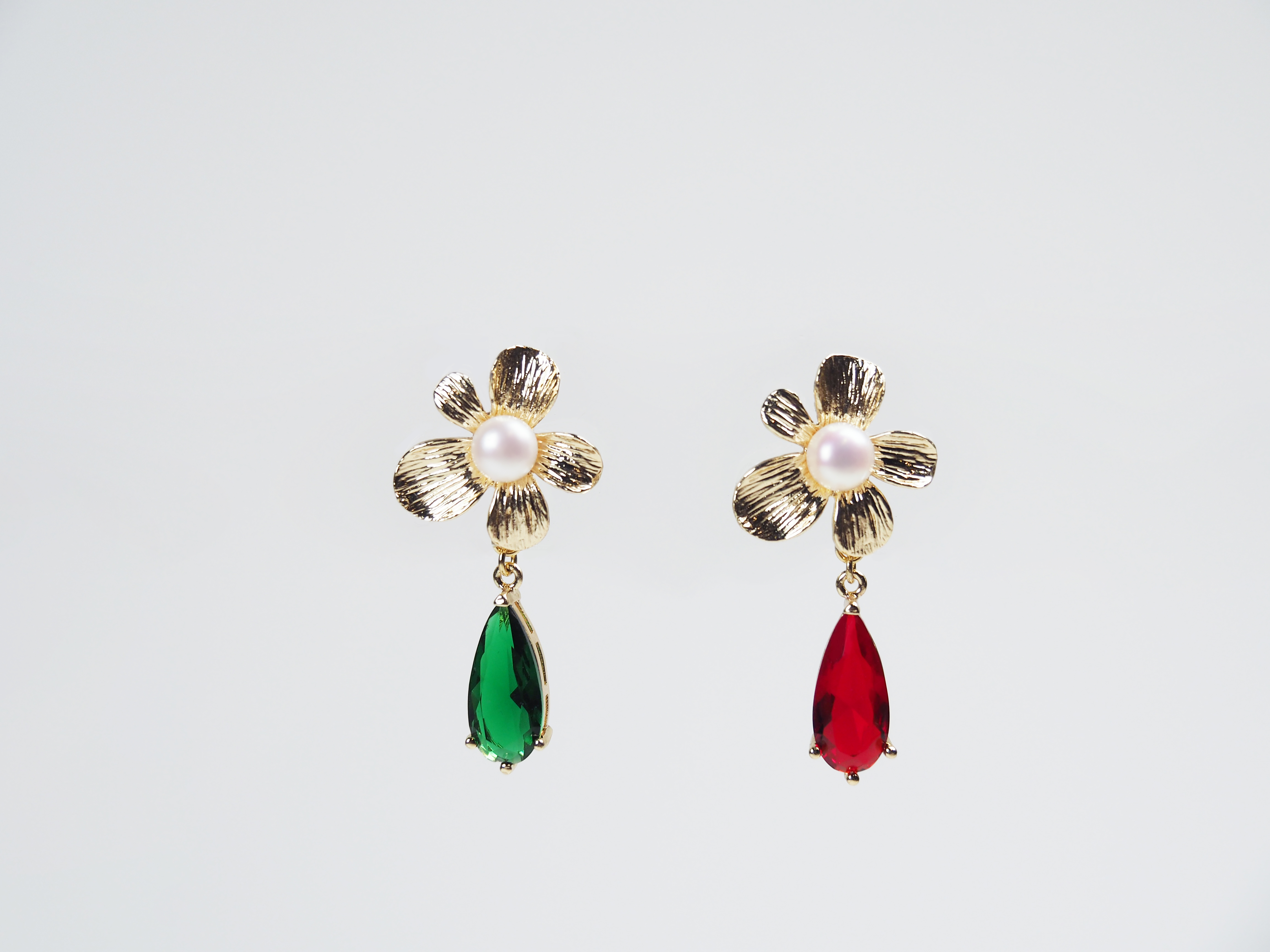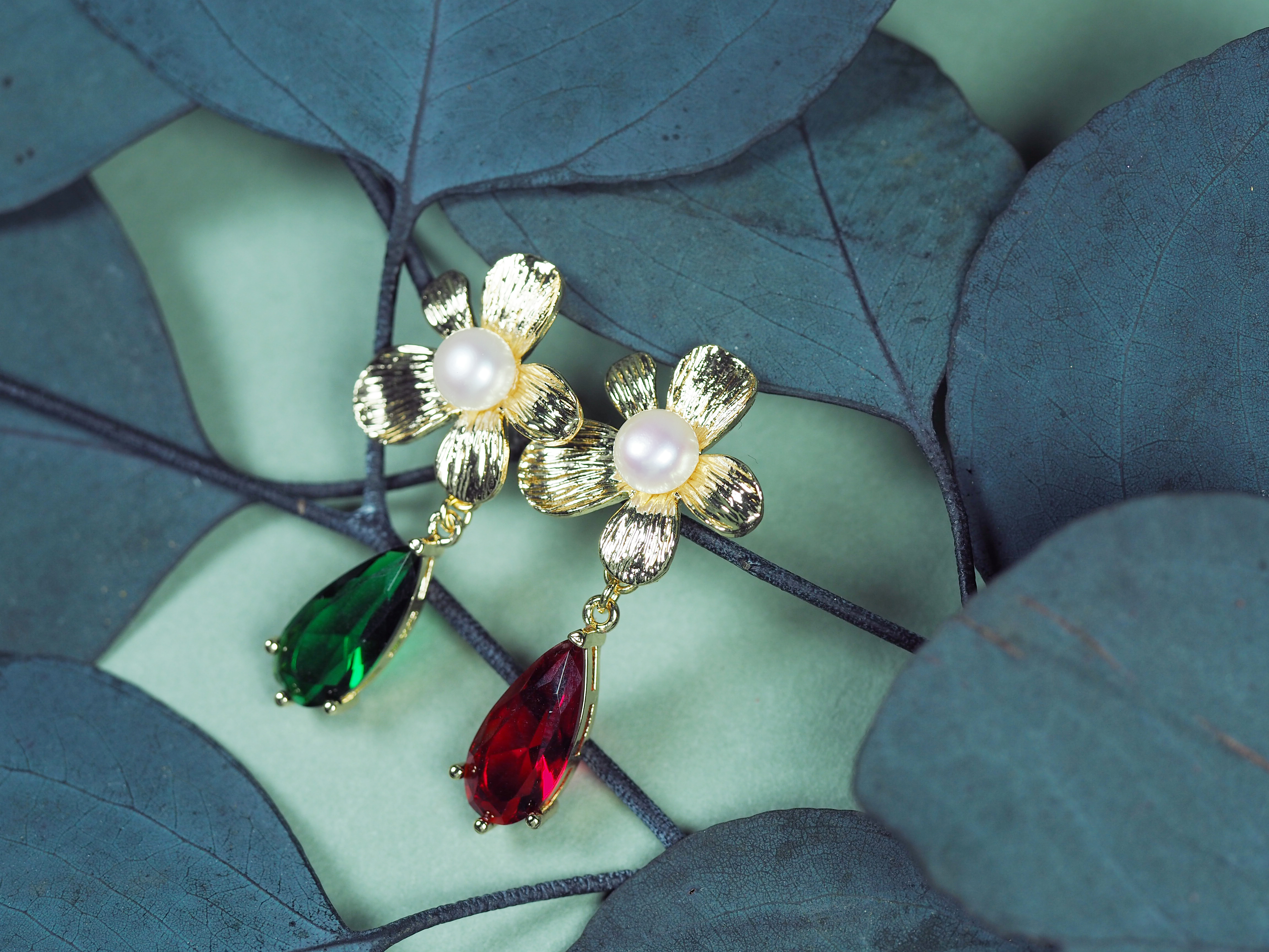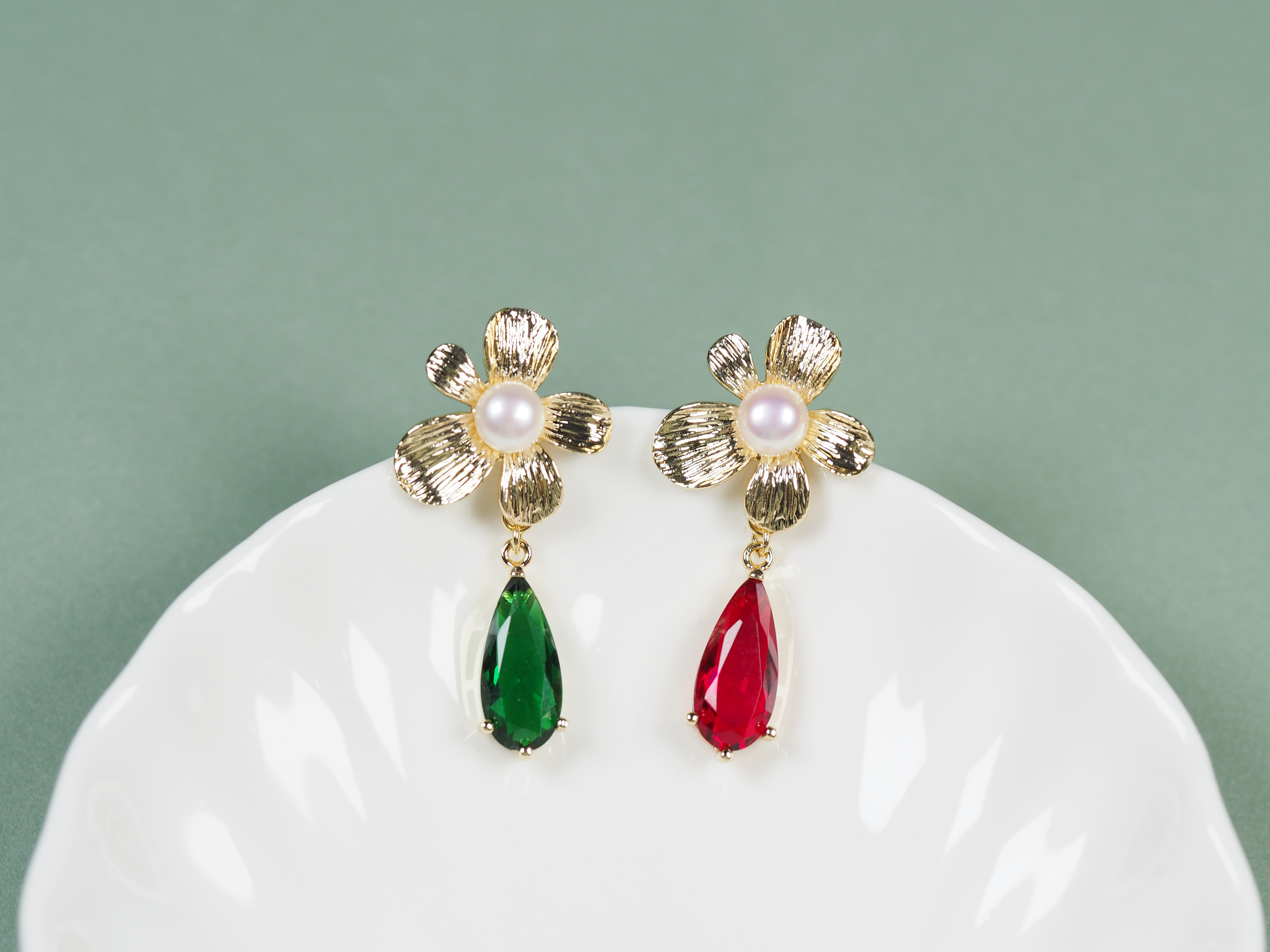 珍珠耳钉 金色五瓣花镶白珠坠红绿水滴