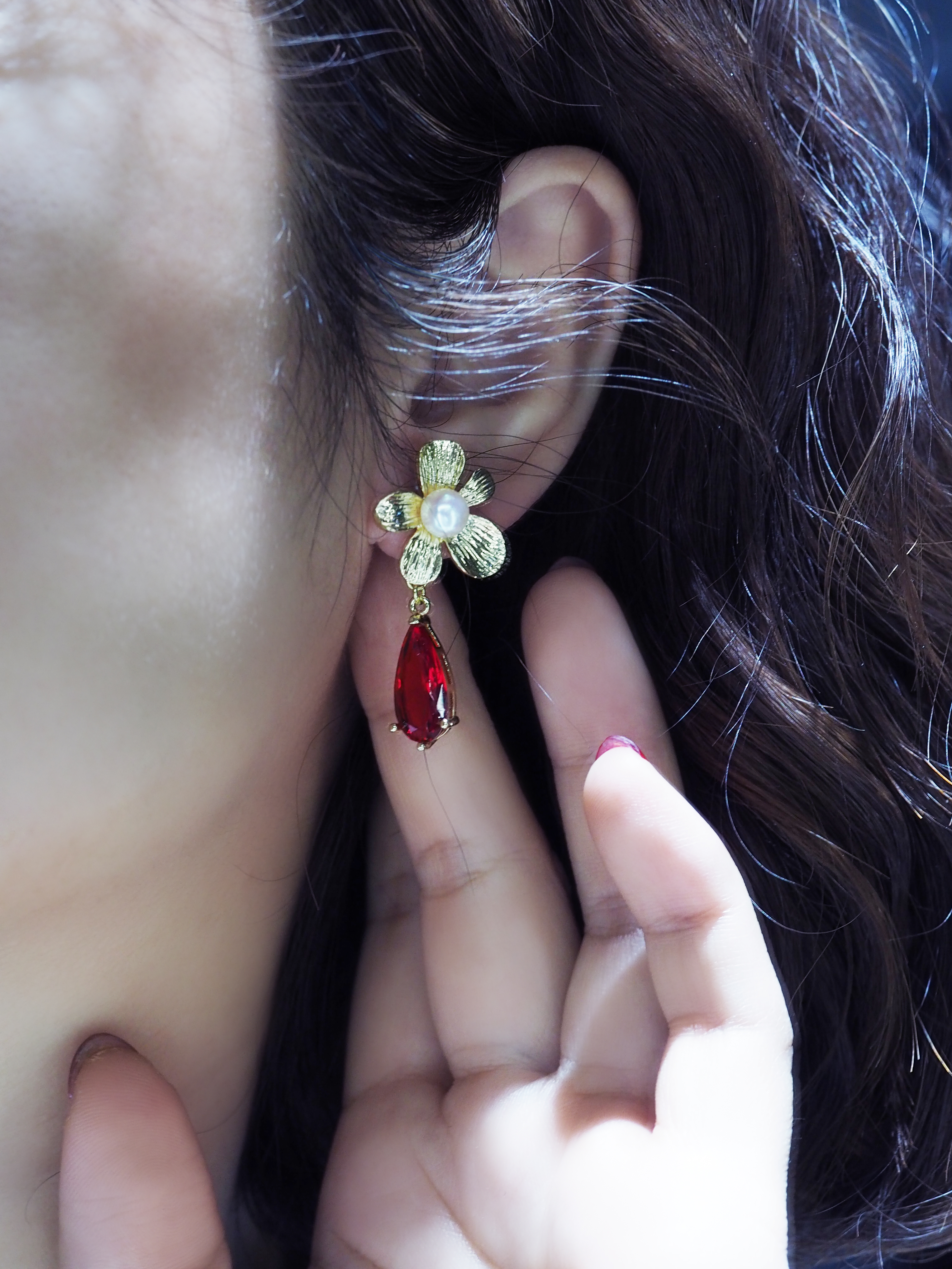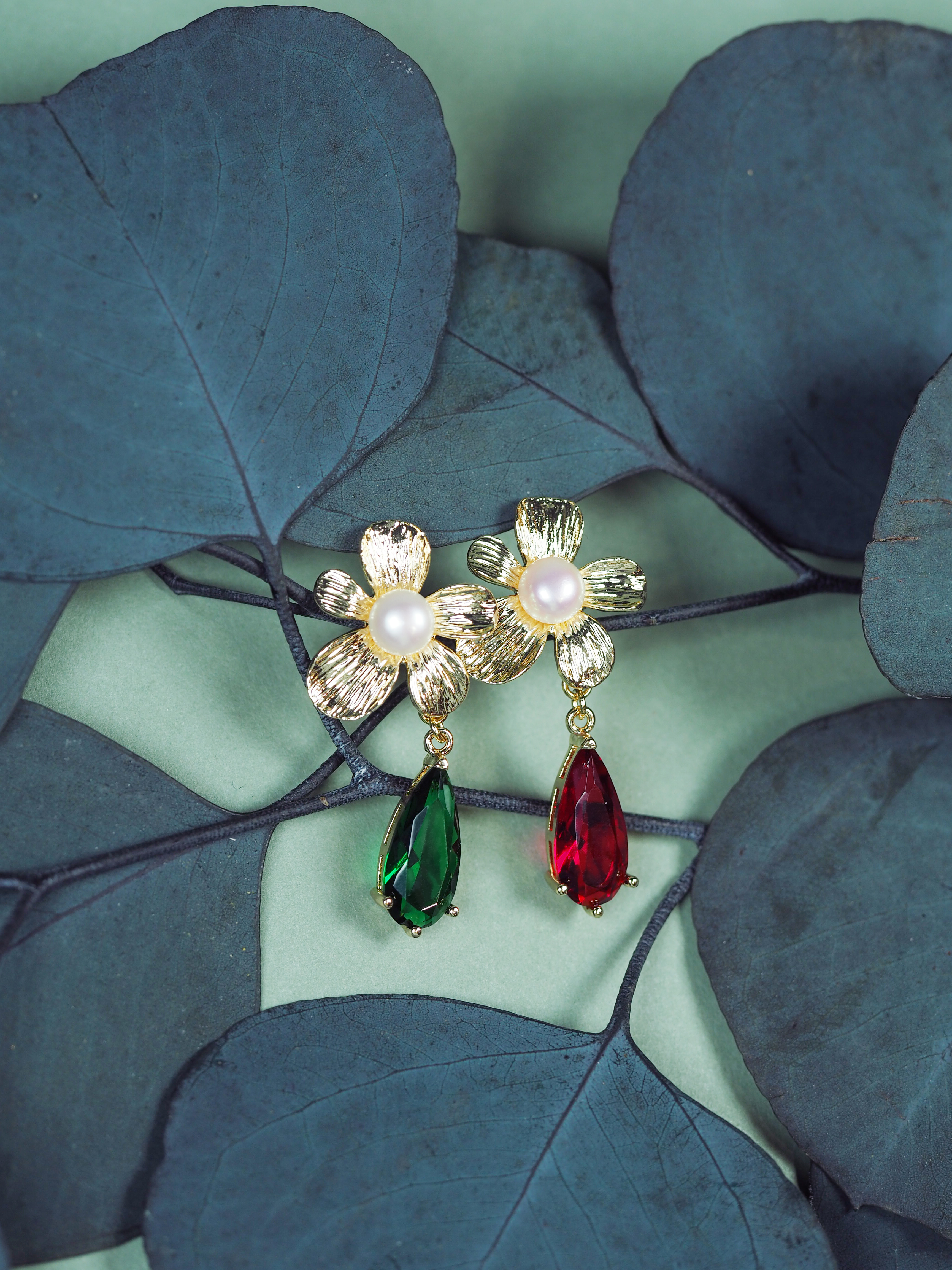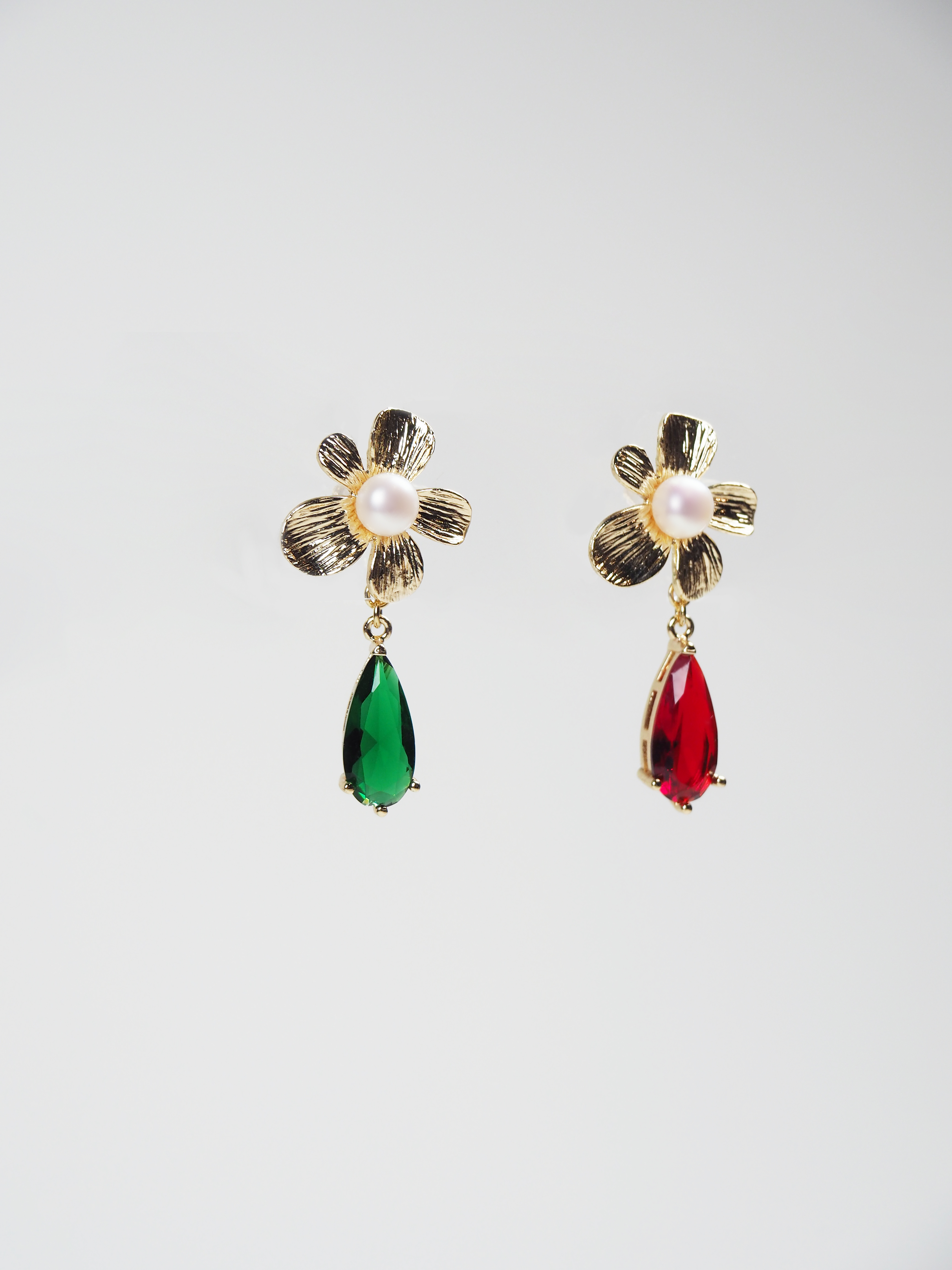 珍珠耳钉 金色五瓣花镶白珠坠红绿水滴