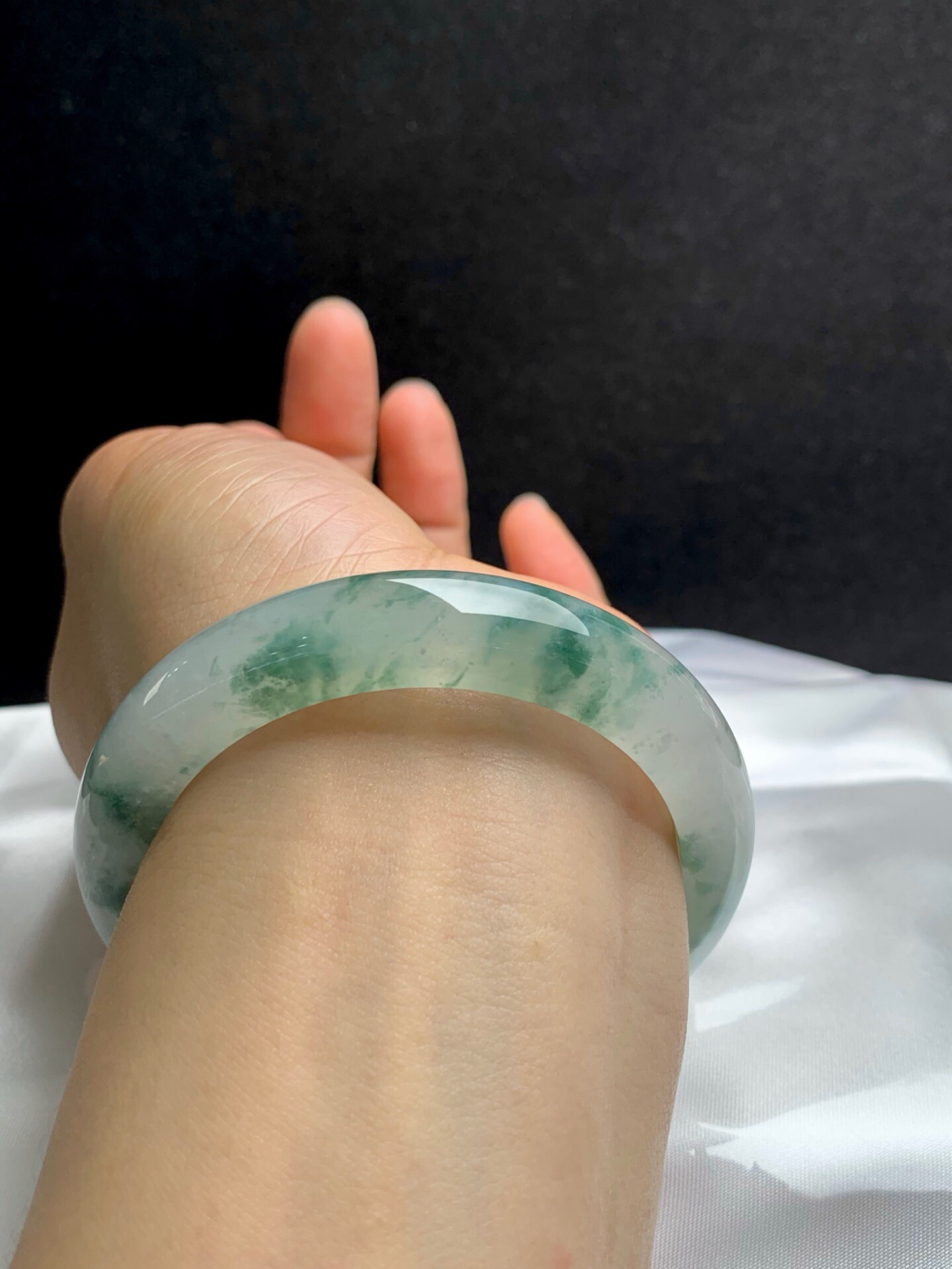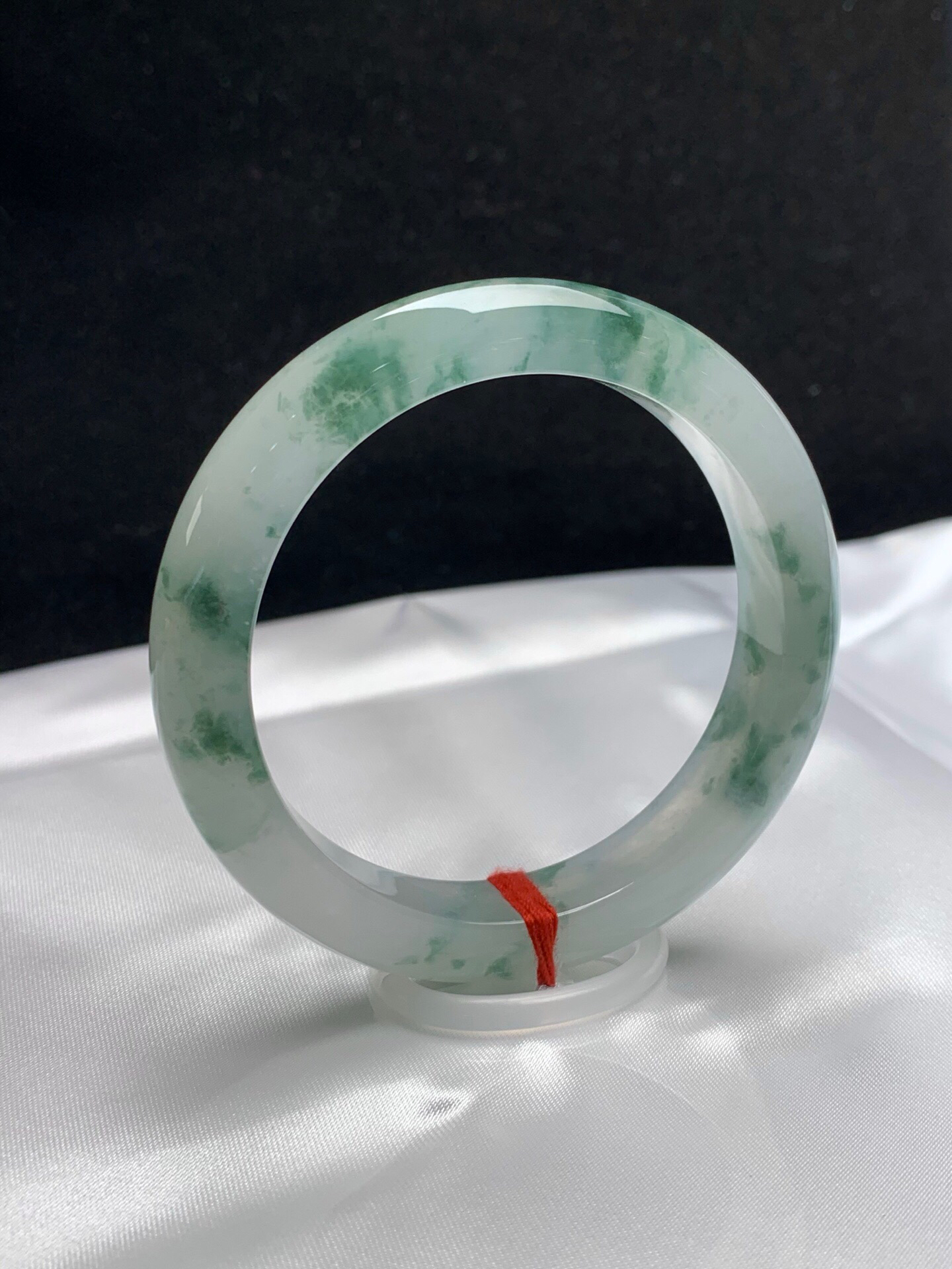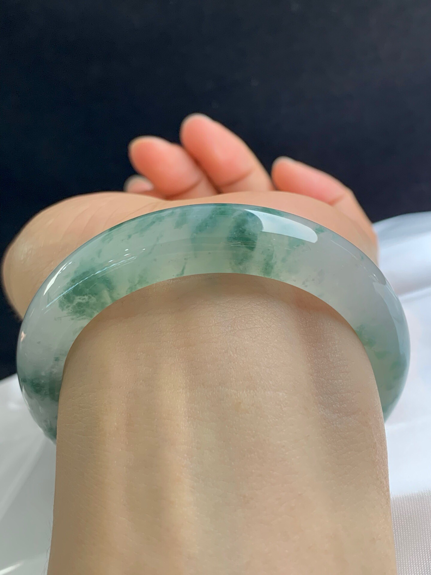 620258,55.3圈口,冰飘花正圈平安镯,老种,冰透起光,白底飘蓝花,条形秀气,完美无裂,尺寸:55.3-11.6-8.6,超值价💰87500 #优石客珠宝#香玉荟萃
