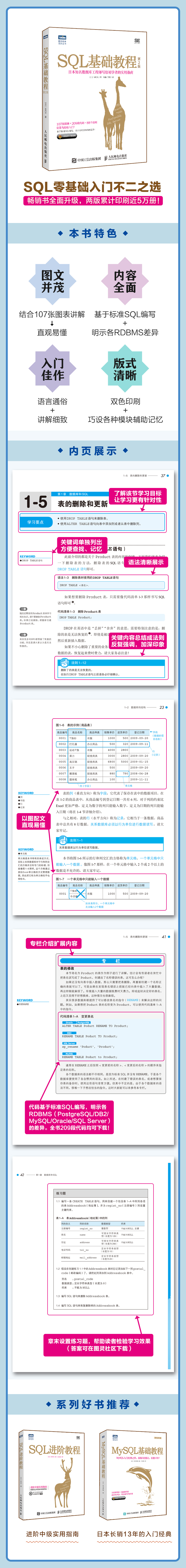 本书是畅销书《SQL基础教程》第2版,介绍了关系数据库以及用来操作关系数据库的SQL语言的使用方法。书中通过丰富的图示、大量示例程序和详实的操作步骤说明,让读者循序渐进地掌握SQL的基础知识和使用技巧,切实提高编程能力。每章结尾设置有练习题,帮助读者检验对各章内容的理解程度。另外,本书还将重要知识点总结为“法则”,方便读者随时查阅。第2版除了将示例程序更新为对应新版本的DB的SQL之外,还新增了一章,介绍如何从应用程序执行SQL。