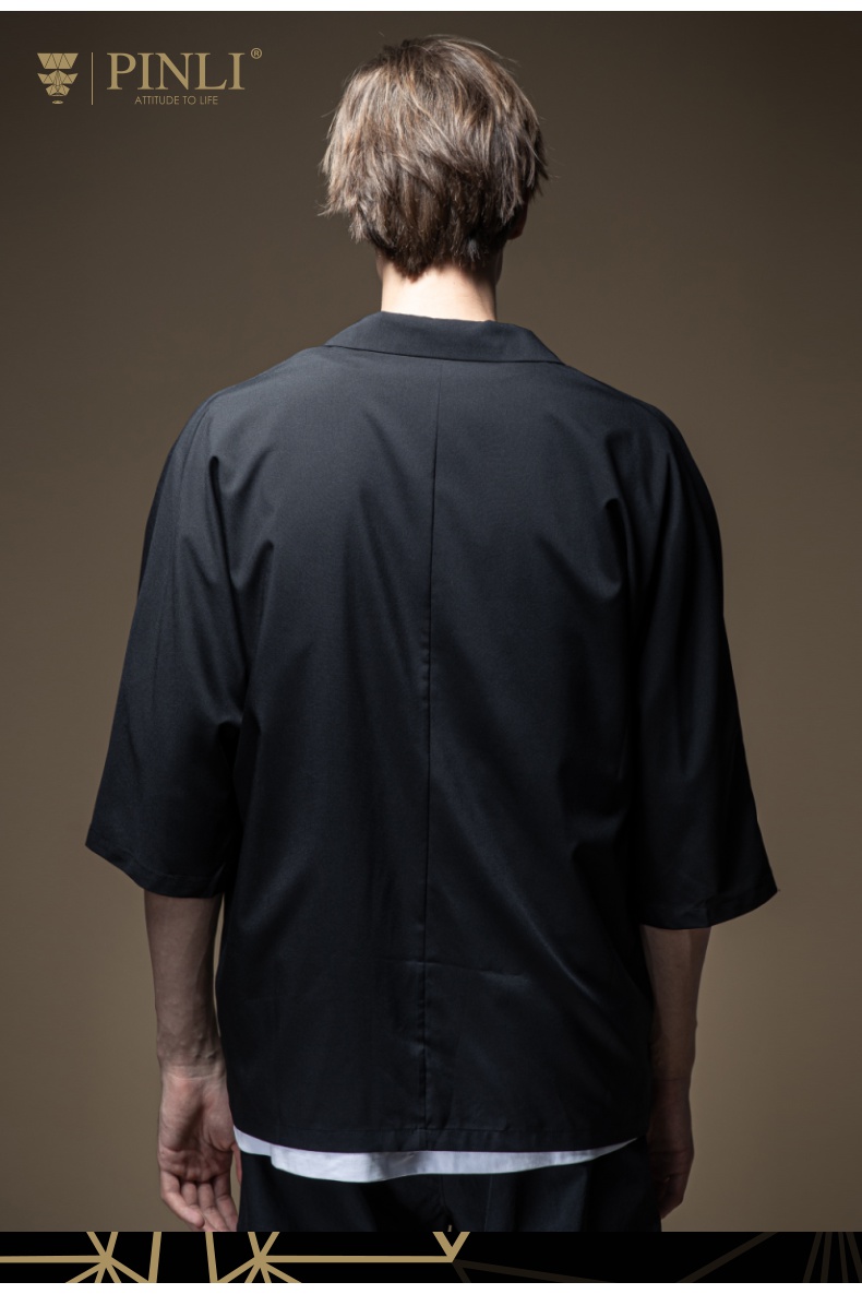 PINLI品立春季新款宽松五分袖衬衣提花蝙蝠袖潮牌男中袖衬衫B253113002