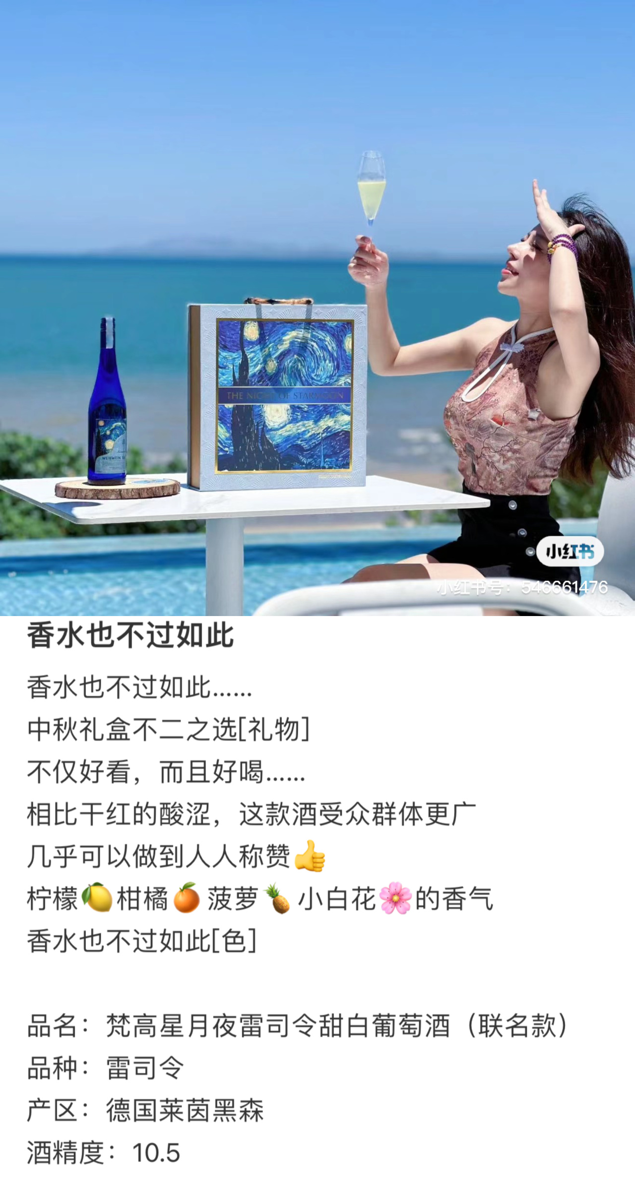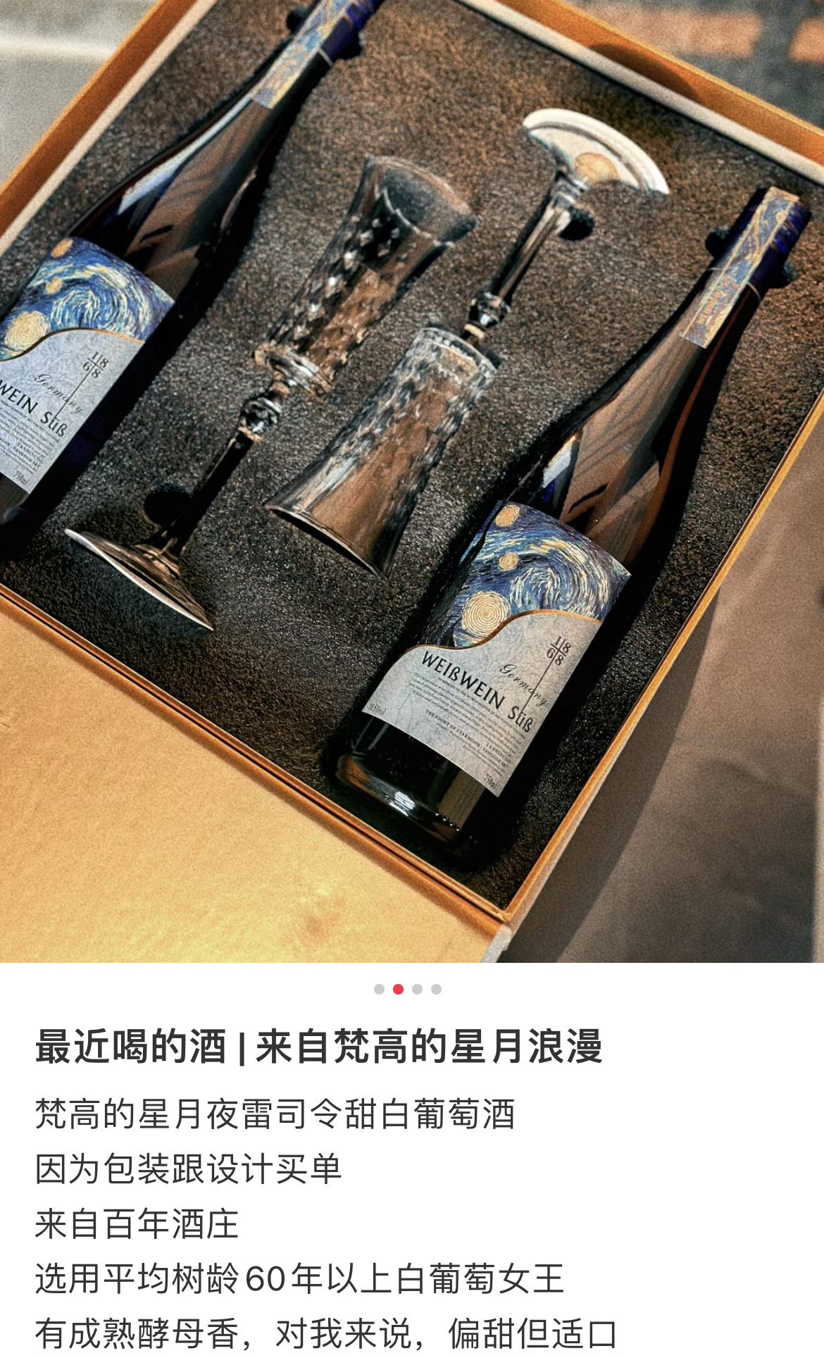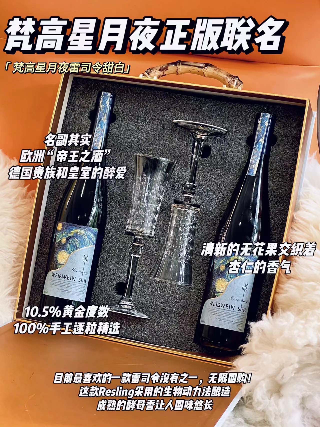 之前上了些很性价比的干红干白,小小支,都蛮受欢迎的,有老粉问有没香槟?有呀!梵高星夜的联名雷司令,微微甜,度数也不高,很适合女孩子哦,还有送杯子的礼盒装,价格也是很不错!
