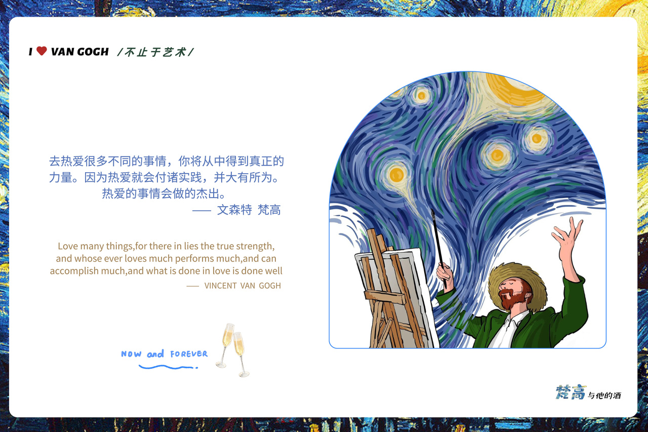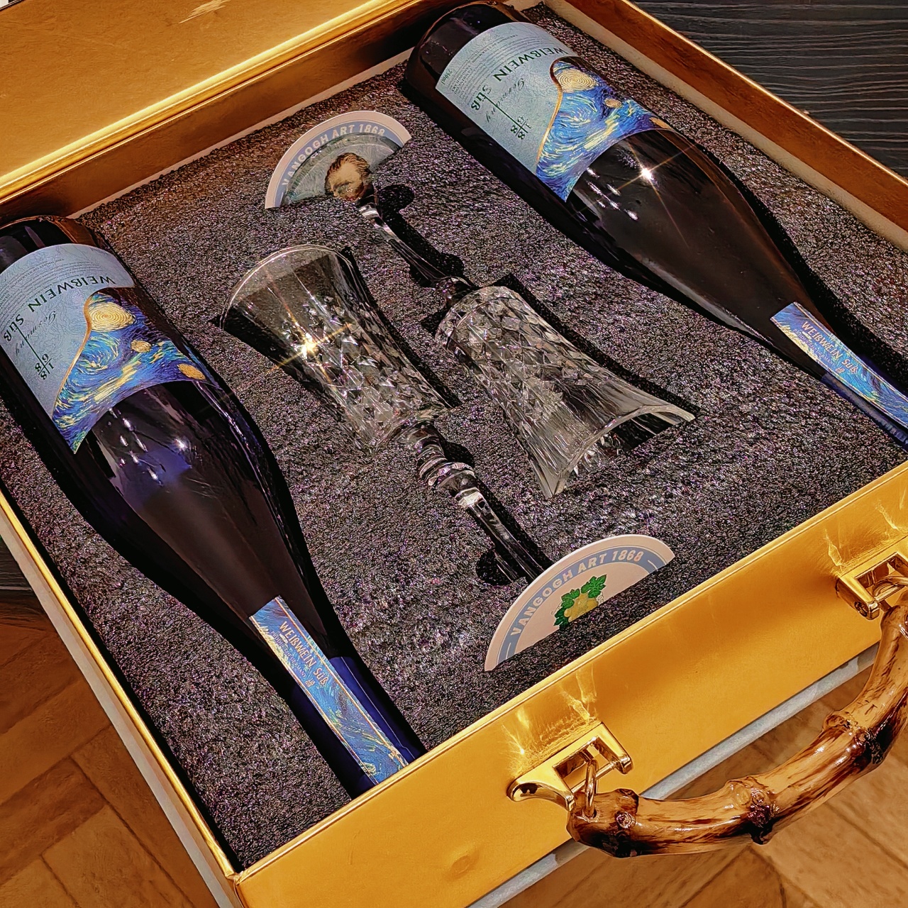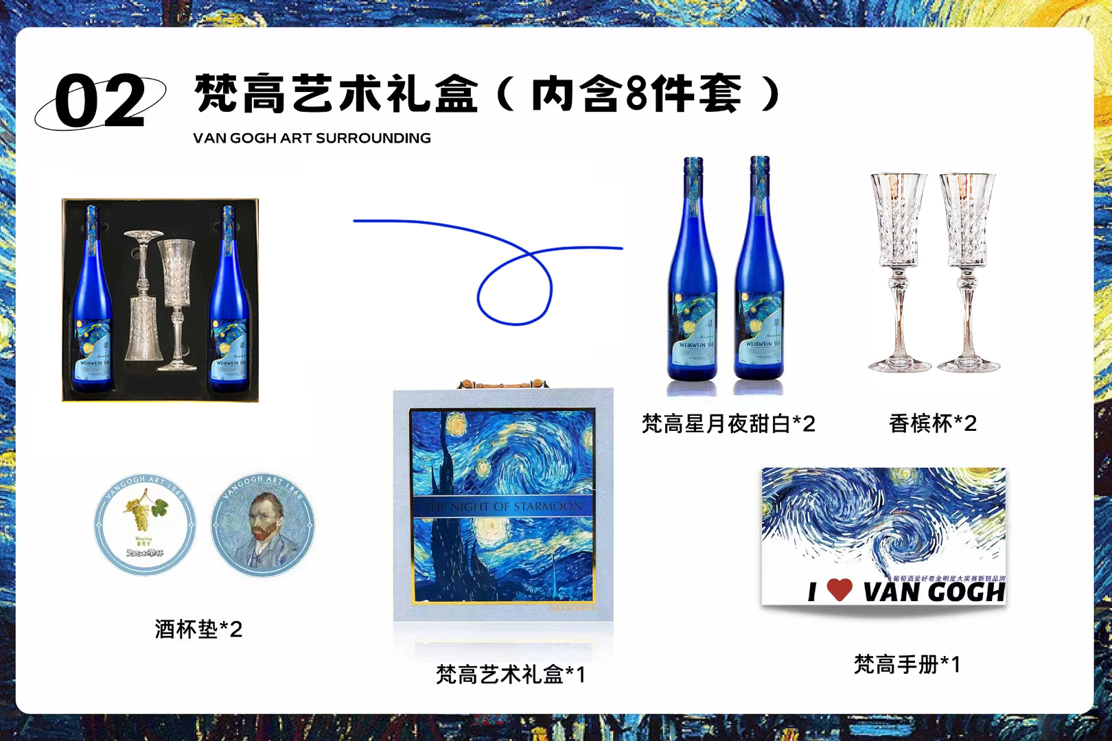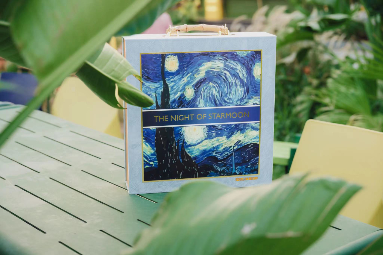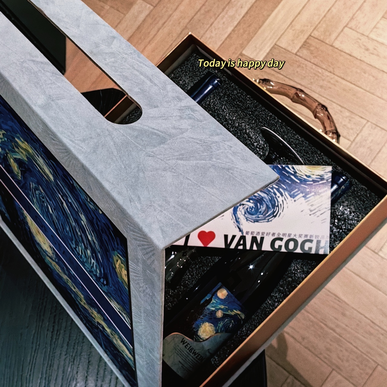 酒好喝,与梵高星夜的联名礼盒更让人爱到不行,公文包的外形配上竹节式手柄,正中间是梵高著名画作"星夜",格调拉满!礼盒中还配了两只好看雅致的香槟杯,再配上艺术感的梵高杯垫,无论是自己收藏还是送朋友都太合适了!