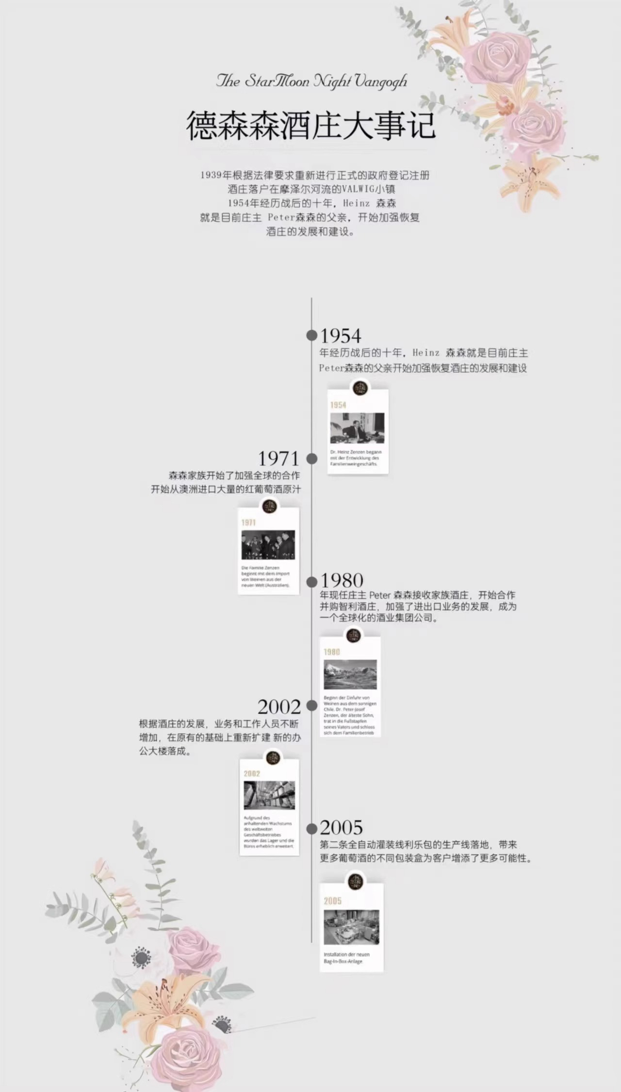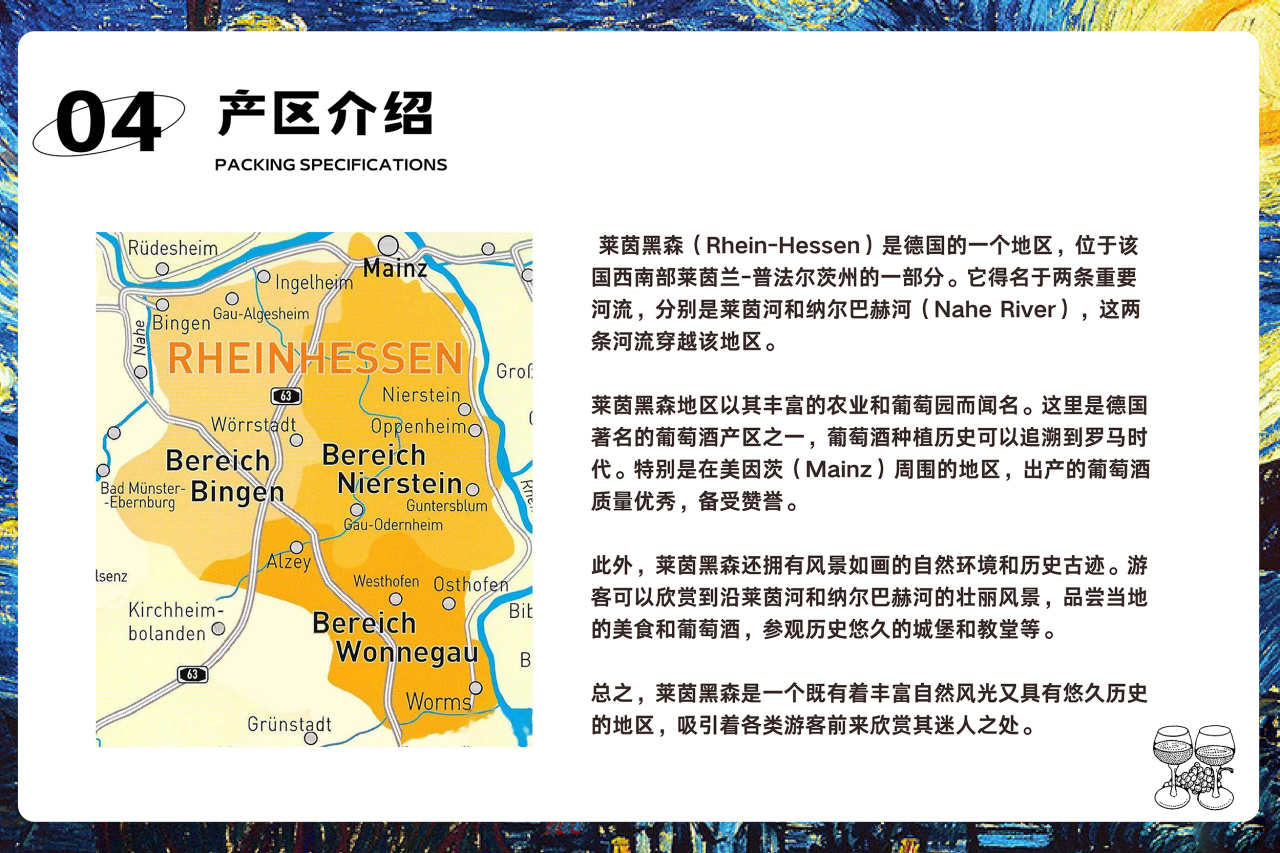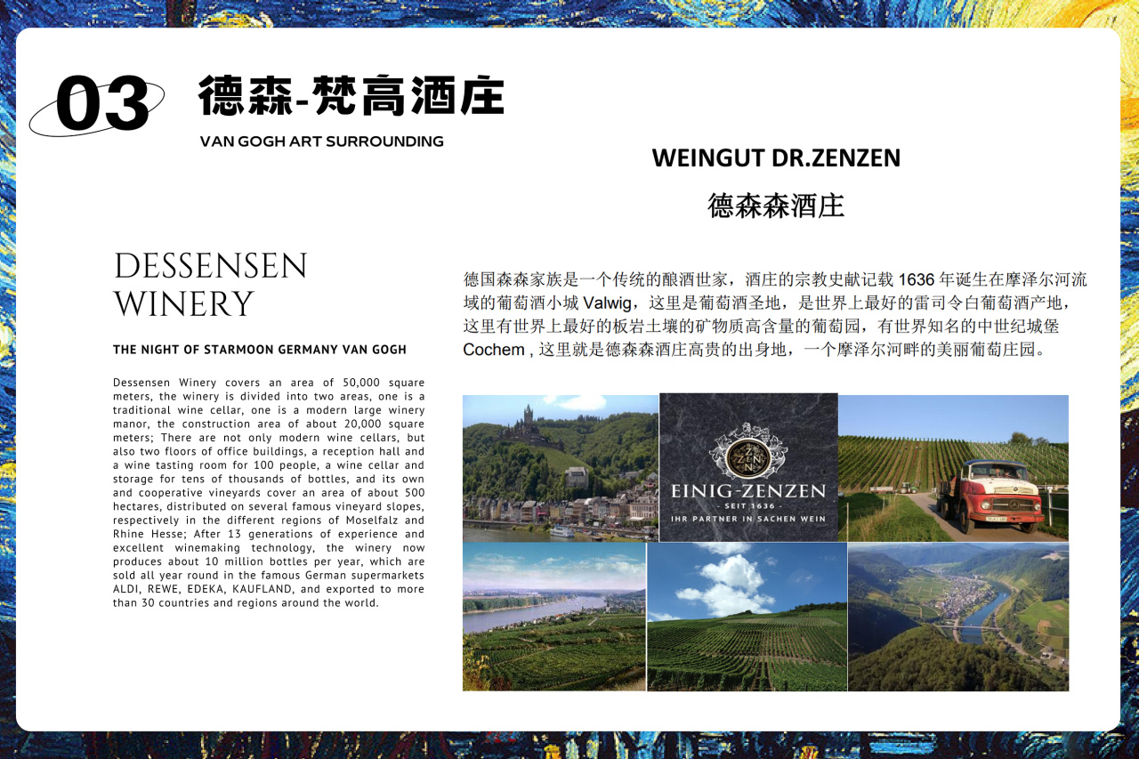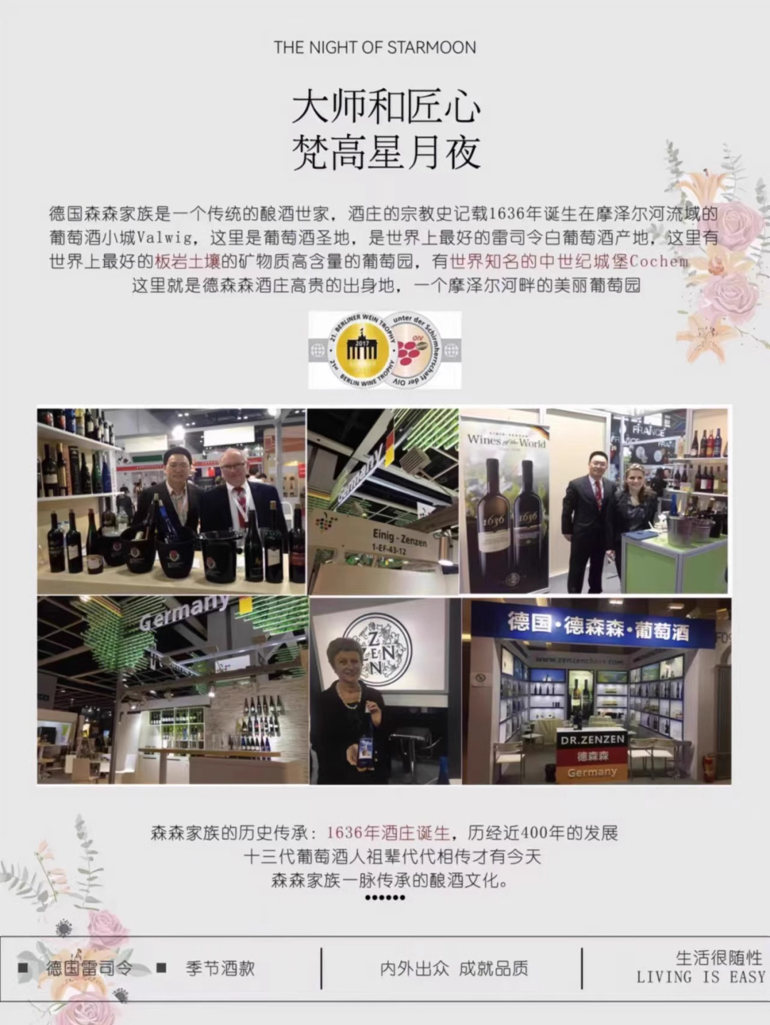 在19世纪末,欧洲王室都很钟爱喝雷司令,在莱茵河和摩泽尔河流域,有些甚至比拉菲、拉图价格来得还高些,时至今日,英国依然将雷司令作为王室用酒。而全球约65%的雷司令产自德国,13个法定葡萄酒产区中,又属摩泽尔更是名气出众,梵高星夜雷司令就源自诞生在摩泽尔河流域的葡萄酒小城Valwig的德森林家族,是超150年的古老酒庄。因其手工去梗的葡萄在特殊天然酵母发酵下,经过低温48小时的浸泡,使这里的酒汁香气浓郁,清爽又富含矿物质,10.5%的黄金度数,清新的酸度和甜度达到很好的平衡,又不失大橡木桶带来的圆润。