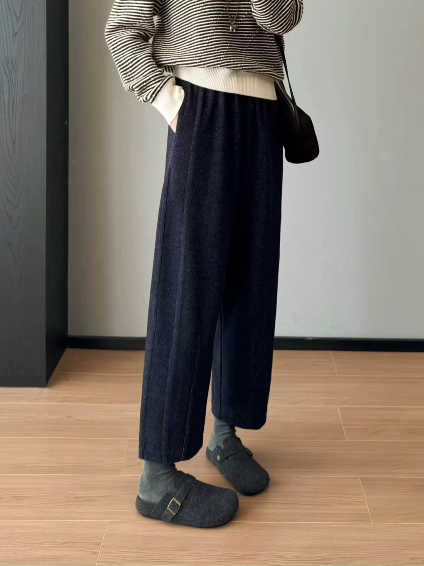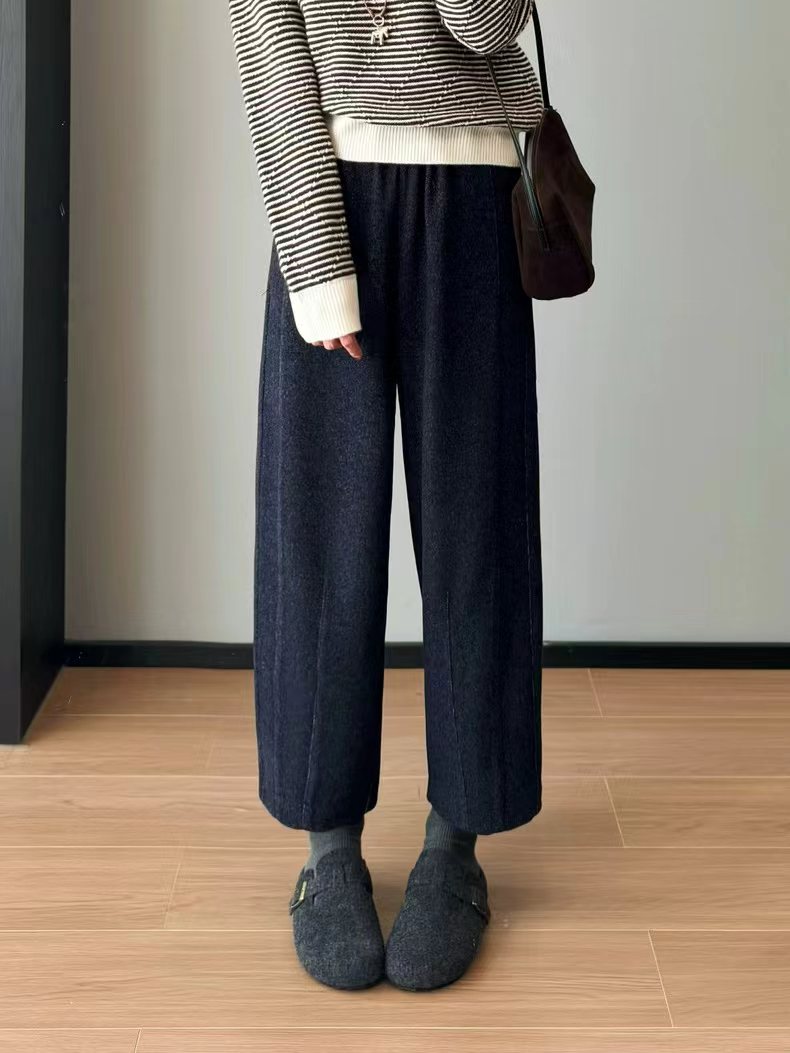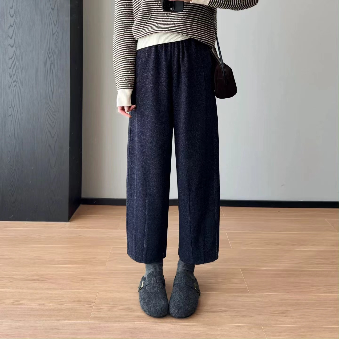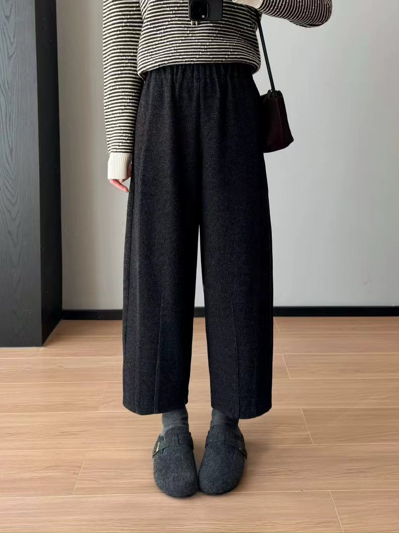 花纱柏林裤!冬季保暖加厚磨毛松紧高腰山本羊毛毛呢马丘裤一条由内而外,从版型到材质都让人无可挑剔的一款裤子!马丘裤与羊毛的结合,保暖又时髦,版型挺括不拖沓!定制面料!版型质感都巨好~裤型巨洋气~上身挺括显瘦~属于难得遇到的好面料!足足等了一个月终于出货了~!大工厂出货!质量真的太好了!既有通勤该有的率性干练,也有适合日常生活该有的舒适灵活上身非常舒适,修饰身材,包容大多数人的腿型,率性洒脱随性舒适还带点复古的调调,舒适有型两不误。版型 非常 遮肉显瘦的萝卜裤版型,有一点慵懒的休闲风范,垂坠有型不容易松垮,对于各种身材都很友好,全松紧腰头,给呼吸和活动都带来了舒适的穿着感受,裤腿由上而下逐渐收拢将胯部多余的肉肉都遮盖起来,利落有型,裤腿足够宽松,整体线条流畅,面料舒适有质感,面料软糯厚实、手感柔软舒适保暖性好,零压力,零束缚~