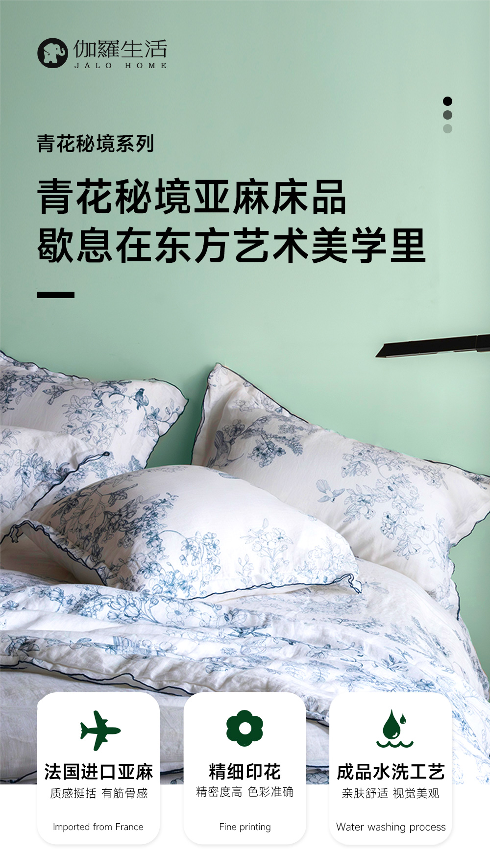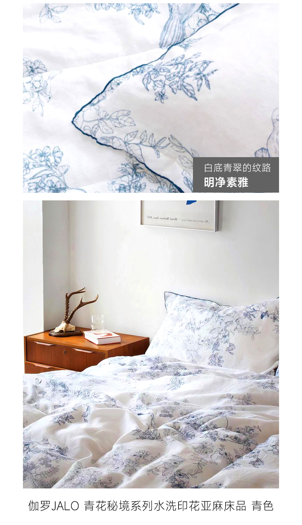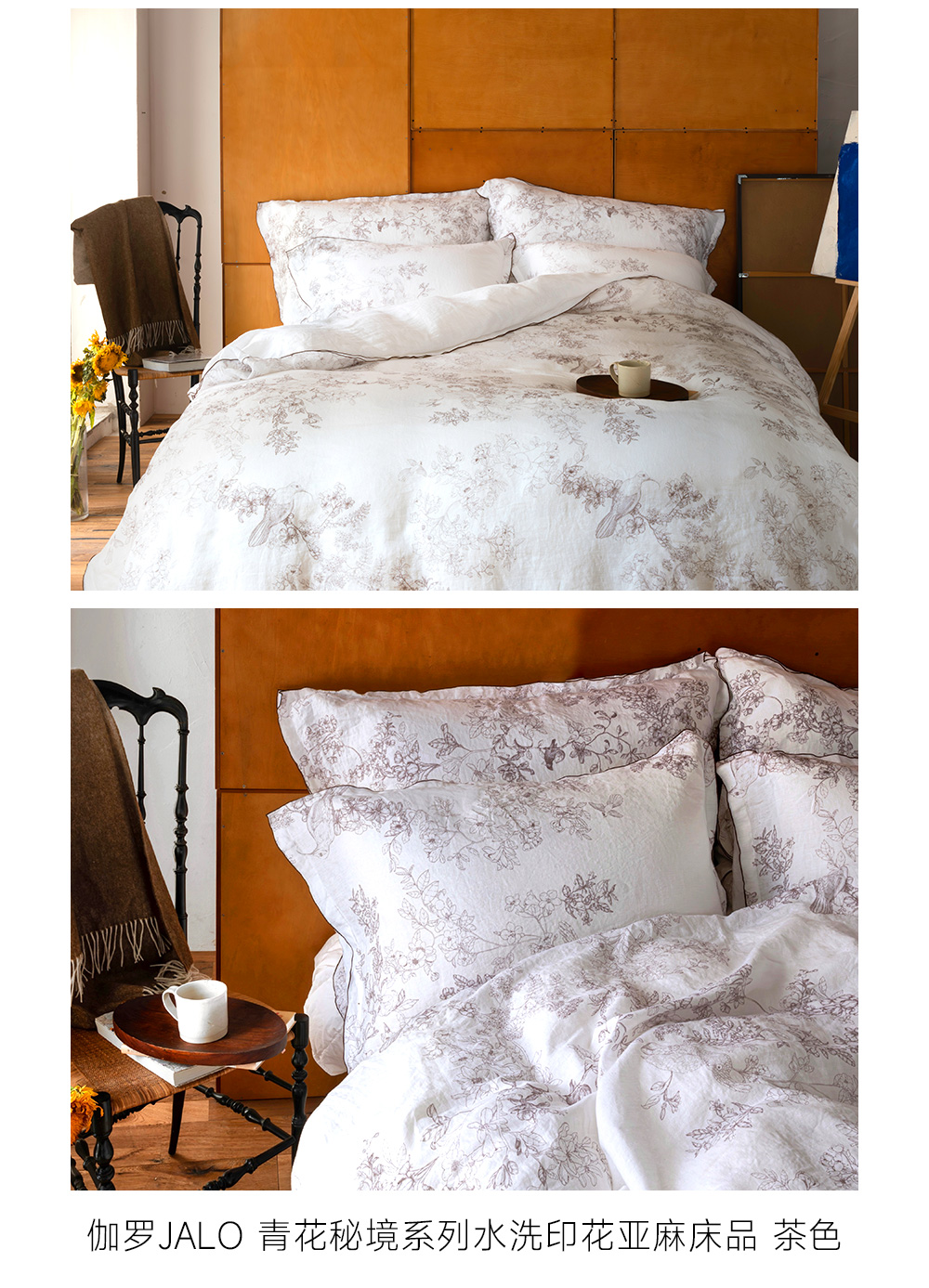 伽罗 JALO 青色茶色青花秘境系列水洗印花亚麻床品