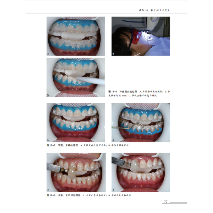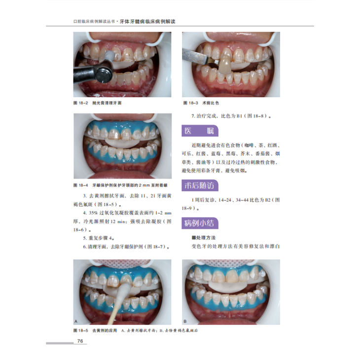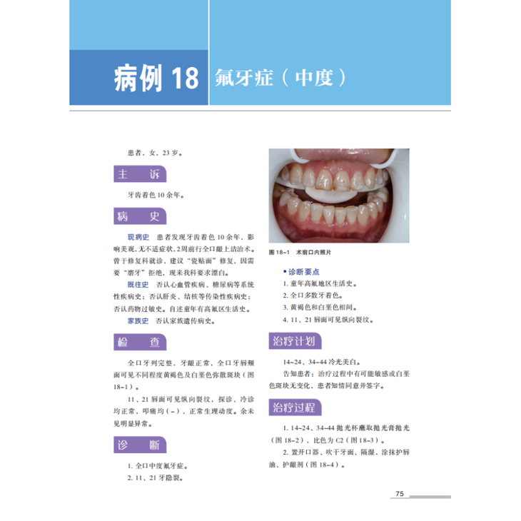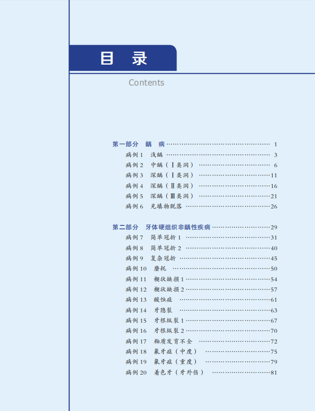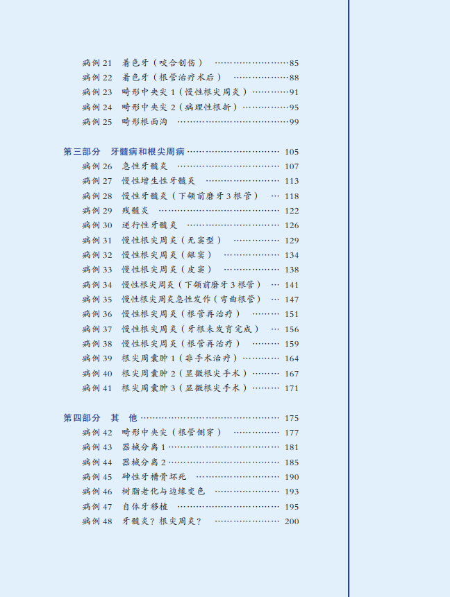 全书共分为 4 章:龋病,牙体硬组织非龋性疾病,牙髓病和根尖周病,其他。48 例病例不仅通过文字详细介绍了患者的基本信息、主诉、病史、检查、诊断、治疗计划、治疗过程及病例小结,而且展示了术前、术中、术后及复查的临床照片、所用器械及材料照片、X 线片、CBCT 截图等,尝试为读者营造一种身临其境的阅读体验。全书主要聚焦于以下几个问题。首先,病历的规范化书写。其次,临床技术标准化操作和质量控制,例如光敏复合树脂直接粘接牙体修复技术规范化操作、根管治疗技术规范和质量控制、根管治疗术难度分析等。第三,牙体牙髓病临床治疗领域内涉及的新技术、新设备、新器械、新材料、新理念的应用与讲解。近十余年,无论国际前沿还是国内发展,牙体牙髓病的临床治疗均发生了巨大的变化,书中对这些新技术的临床应用及研究进展均进行了详细介绍。最后,每个病例独有的诊断、诊断要点、鉴别诊断、操作技巧与细节均有详细的描述。