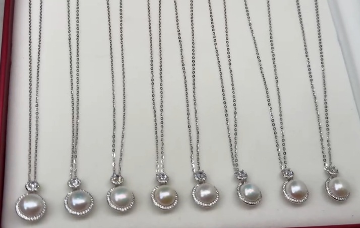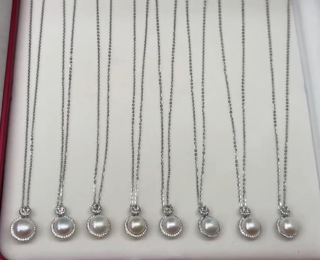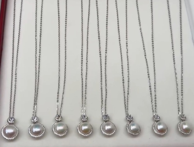 正面尽量挑珠光好瑕疵少的,大珠子的养殖成本比较贵,淡水扁圆珍珠9-10mm点位,通体银链子+配件+珍珠总批发价格一套;