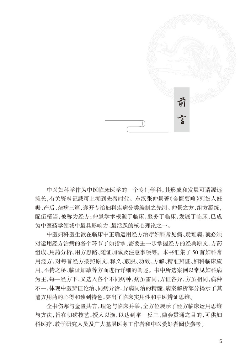 本书依据经典理论对妇科常用经方的原文、释义、组成、功用、主治、方解、临床应用、精准辨证、应用技巧及医案进行介绍,为经方在妇科临床中的应用提供了依据。书中所列50首经方,皆恰切病机,法度严谨,用药精当,疗效显著,极具实用价值。书中列举了大量的病案,医案所论病证,包括经、带、胎、产、杂等方面,举一反三,从而为读者提供更好的临床帮助。本书融理、法、方、药与实践为一体,可供中医、中西医结合的妇科临床工作者及医学院校学生参考使用。