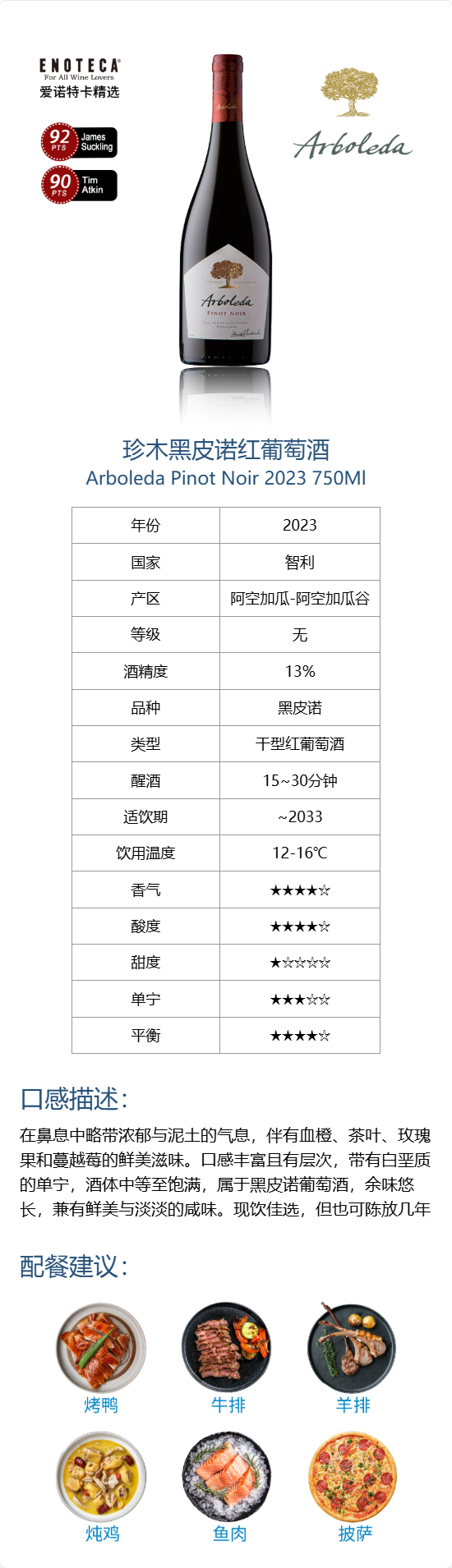 珍木黑皮诺红葡萄酒 2023 ARBOLEDA PINOT NOIR 750ml