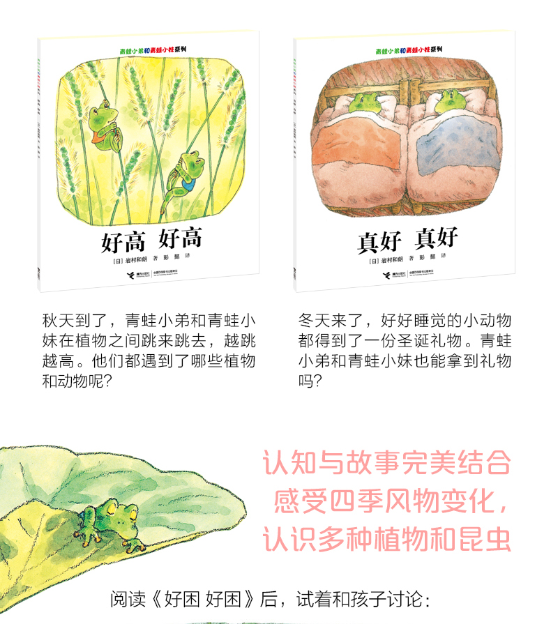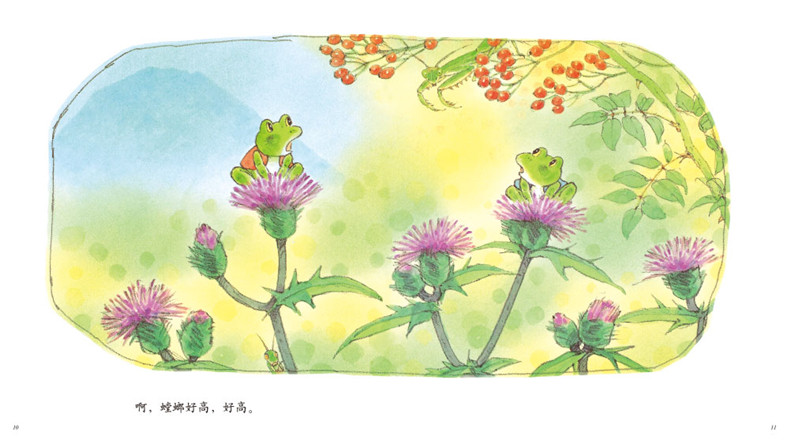 《好高 好高》秋天的山谷里,青蛙兄妹在植物之间冒险,他俩跳来跳去,看到了螳螂、瓢虫、蝴蝶、蜜蜂、蜻蜓、青蛙小弟和青蛙小妹越跳越高,越跳越开心,最后他俩跳上了在空中飞舞的树叶,和树叶一起开始了下一个冒险。