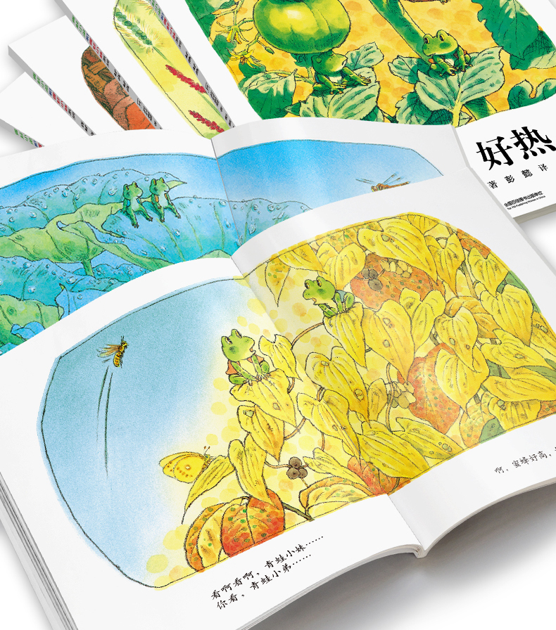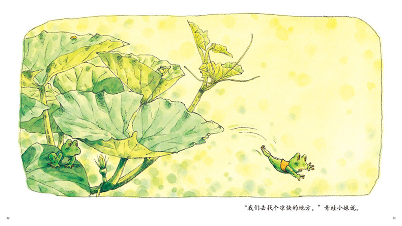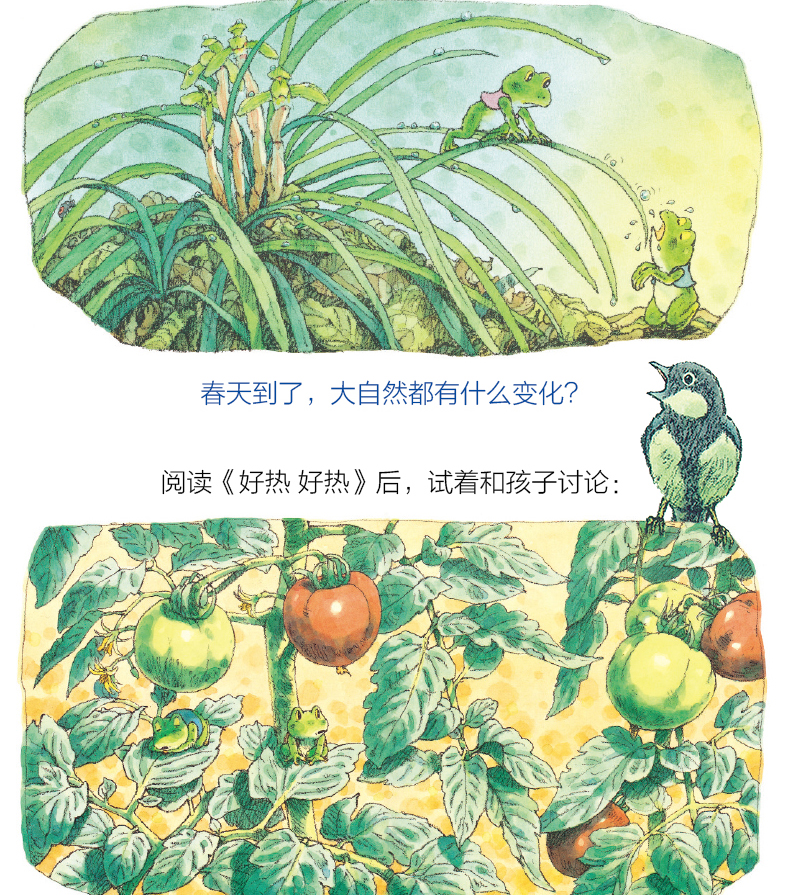 《好热 好热》夏天到了,西红柿田里,青蛙小弟和青蛙小妹热坏了!于是他们去寻找阴凉的地方,他俩一蹦一跳,来到黄瓜田、南瓜田和玉米田,到处都是那么热,这时天空中轰隆隆直响,下雨了,芋头、玉米、黄瓜、南瓜和西红柿也淋了个透,整个大地都变得好凉快。