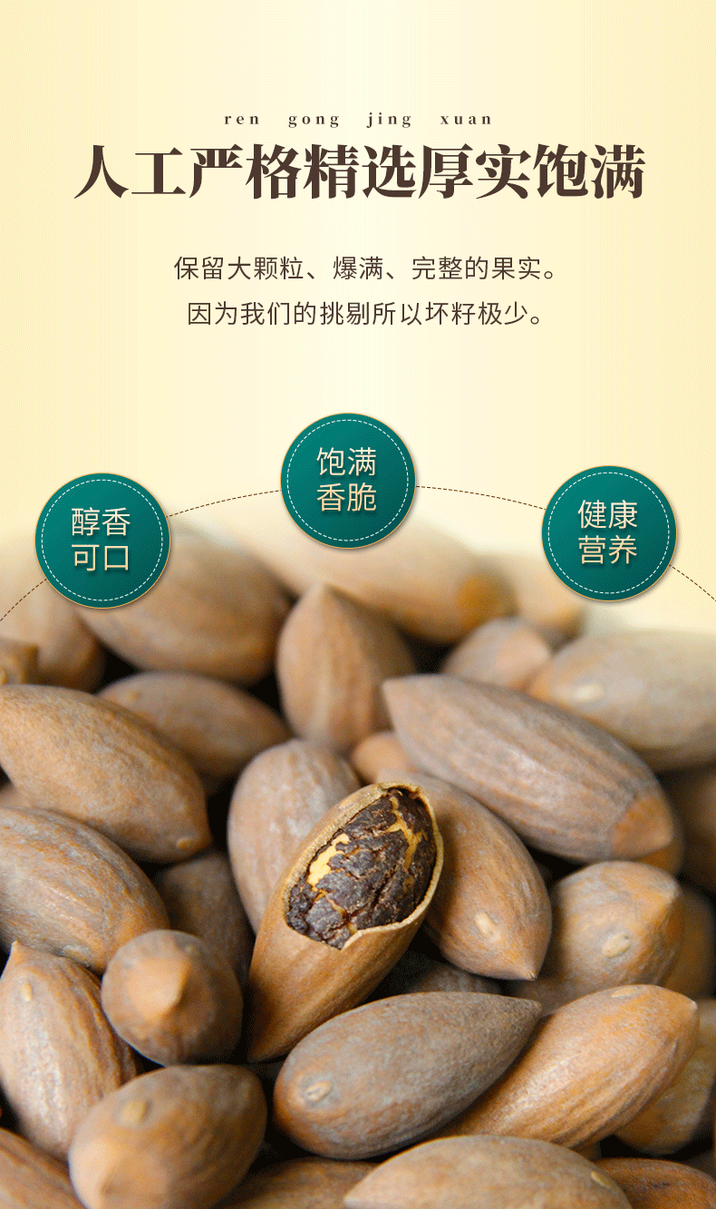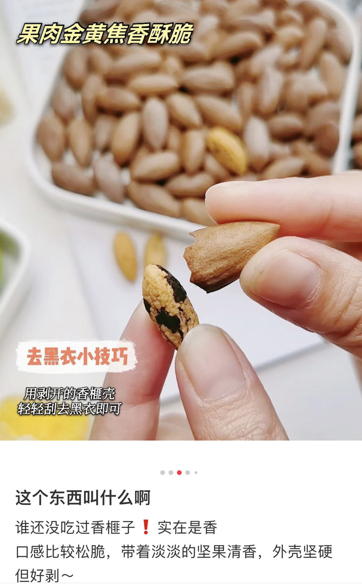 农谚有云:“桃三,杏四,梨五年,想吃核桃得九年。”而香榧的生长周期更长,约15年左右才能挂果,因此产量很有限。我选的是级别较高的香榧,基本都采自百年果树,正规工厂制作,品质稳定,适合自吃,也有礼盒装可以送人,但,不算zui好的,zui好的那一点点,量太少了,基本上农家都自留自炒,送送亲朋好友,或卖给周边熟人,就,没了!要求高的可以到枫桥当地去寻味,日常吃吃这款也就足够,性价比也很不错!