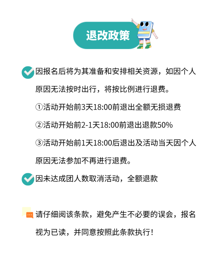 -活动开始前1天18:00后及活动当天不到场参加活动的视为主动放弃参与本次活动,活动费用不退还。
