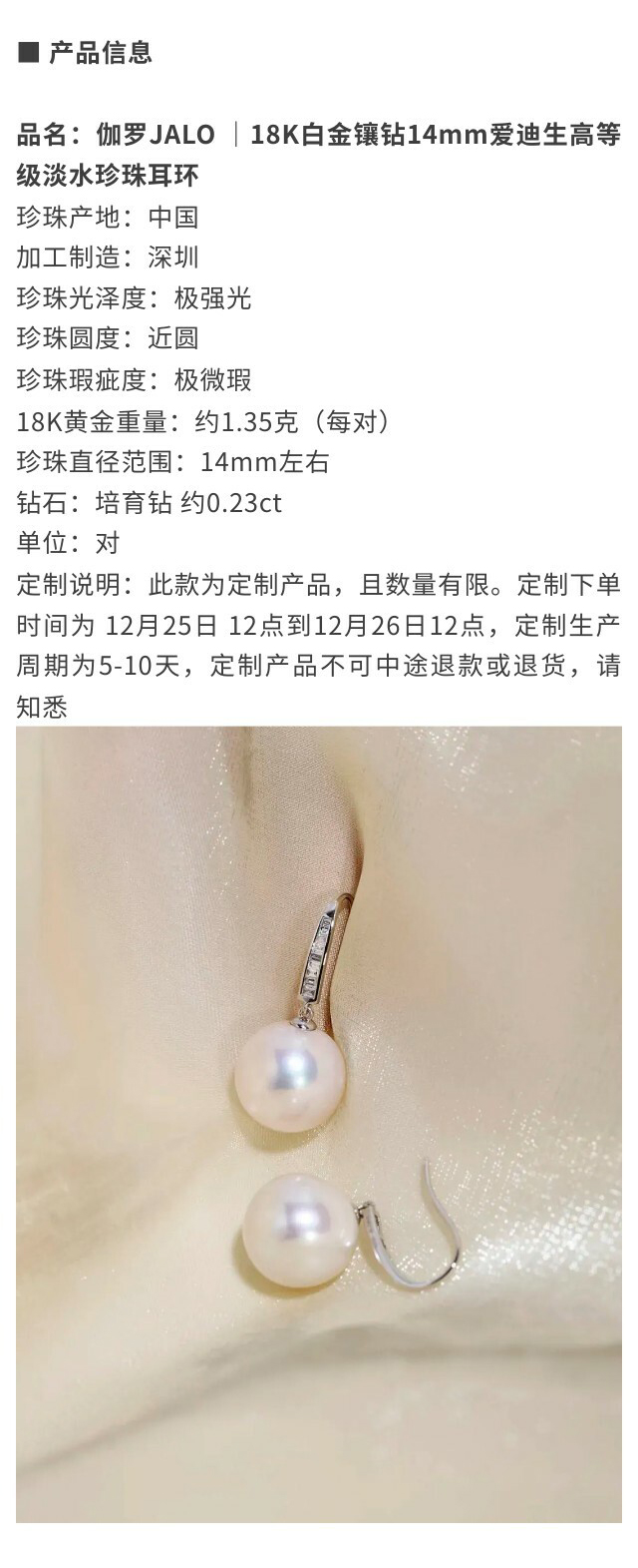 伽罗 JALO 18K白金镶钻14mm爱迪生高等级淡水珍珠耳环-定制链接-15天左右发货