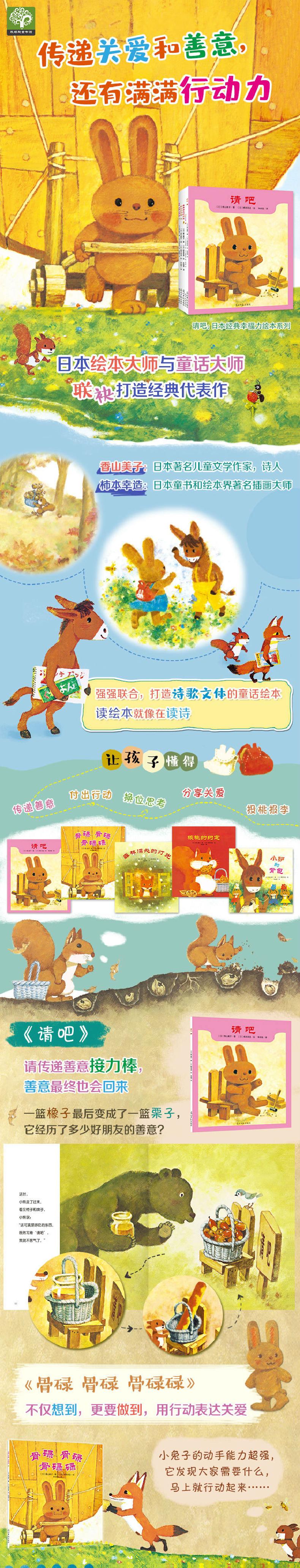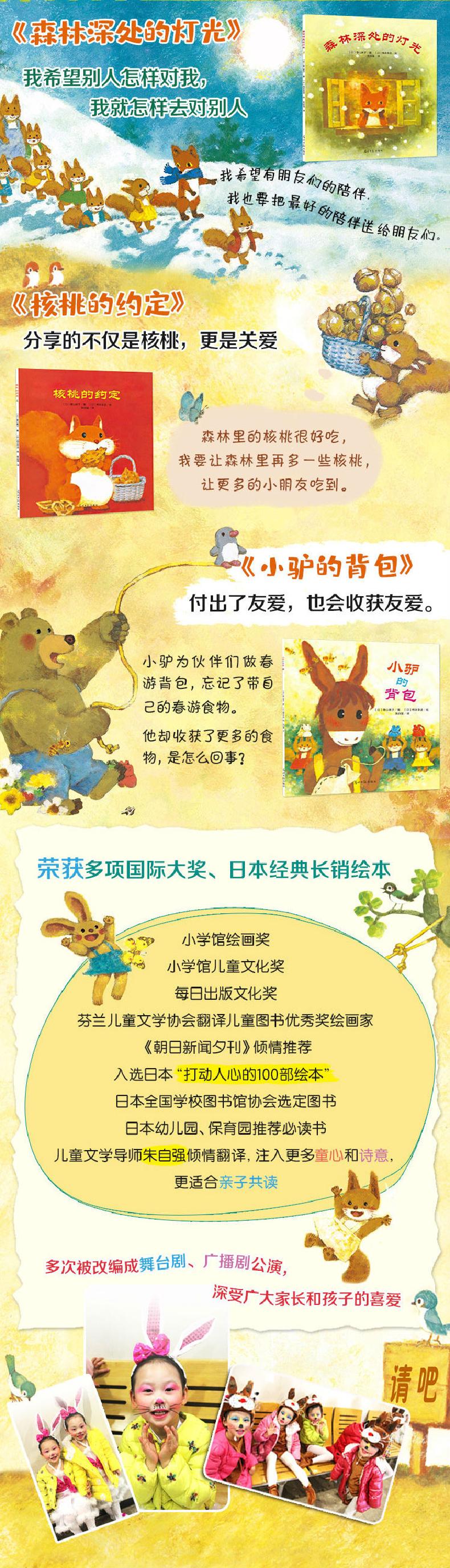 将宝宝温柔的搂在怀里,给他/她读读这套有诗意的温暖绘本,让孩子爱上“分享”,学会“爱”,在孩子的心田播下一颗爱的种子,做一个幸福的播种人,用爱为孩子们搭建通向世界的桥梁。幸福的人,自然也能成为幸福的传播者。只有会分享的孩子,才能激发出更多幸福的能量,才会让这个世界继续幸福弥漫……