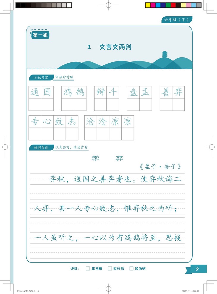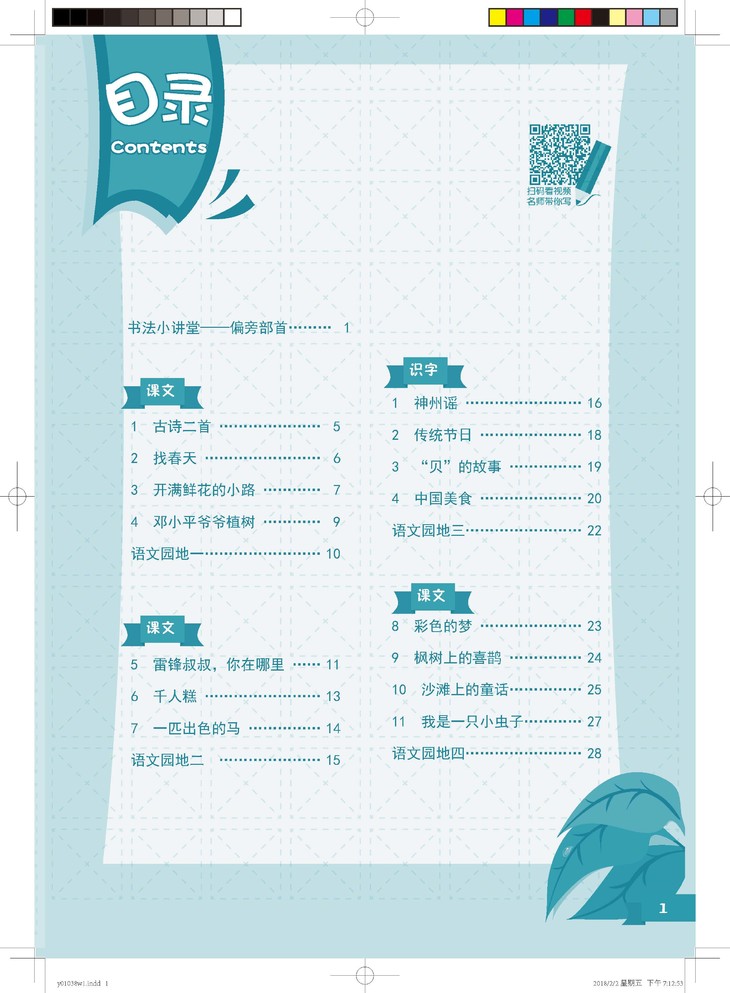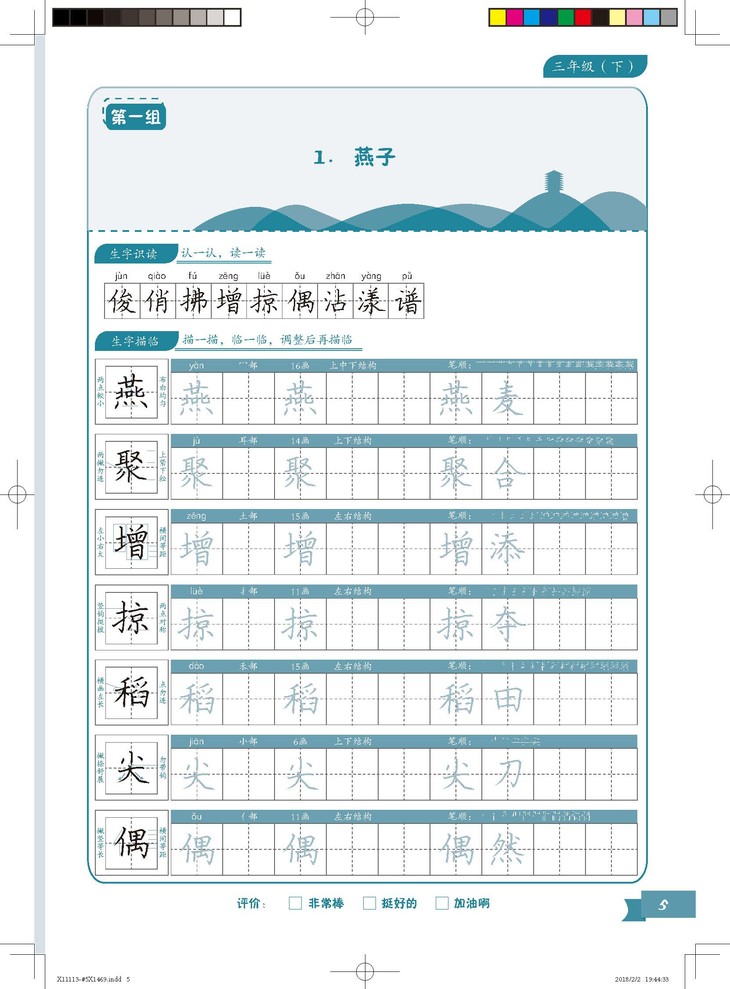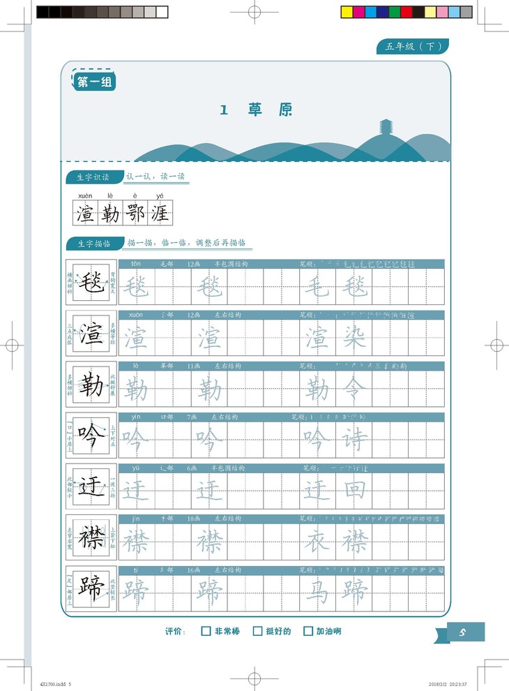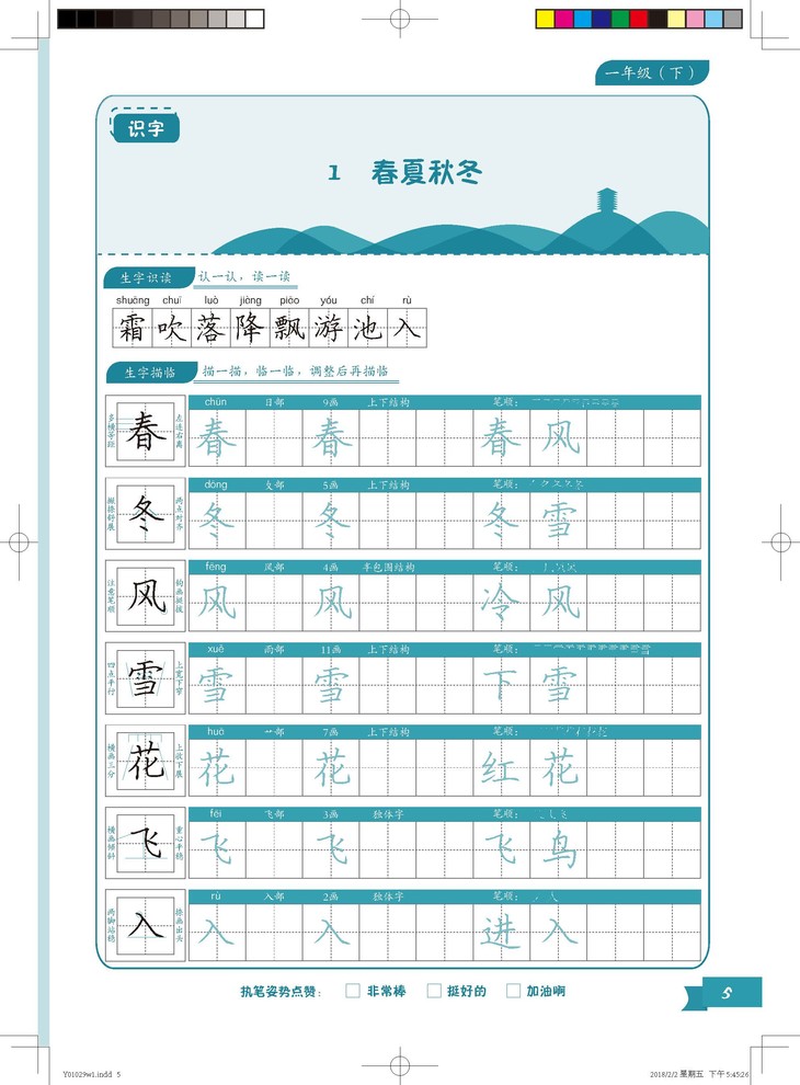 本练习册根据人教版统编教材《语文》同步生字学习编写,通过“生字识读”“生字描临”“日积月累”“古诗描摹”“展示台”等栏目,让同学们能够很好地预习、练习、复习生字,掌握生字的识、读、写,了解偏旁部首、笔画、笔顺及相关词组。