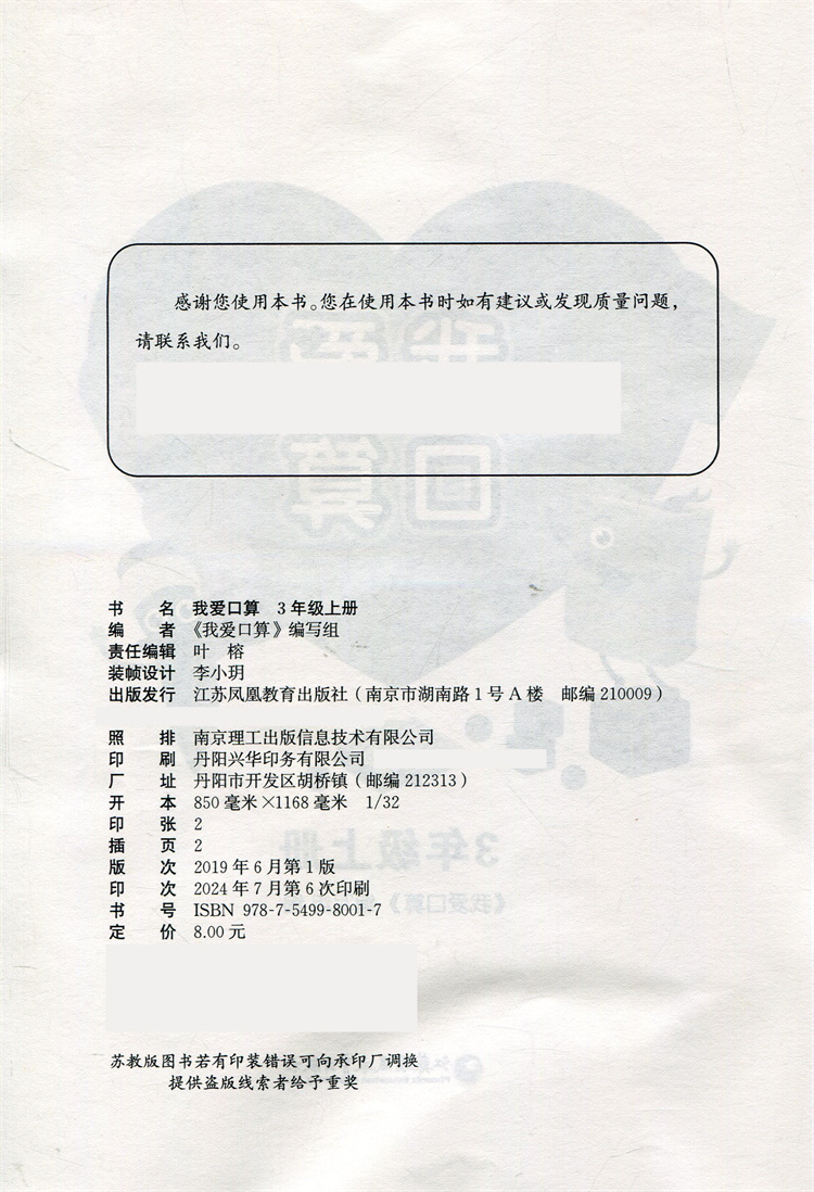 2024年秋 我爱口算 三年级上册3上 无答案 小学生计算口算能手训练练习册 江苏凤凰教育出版社