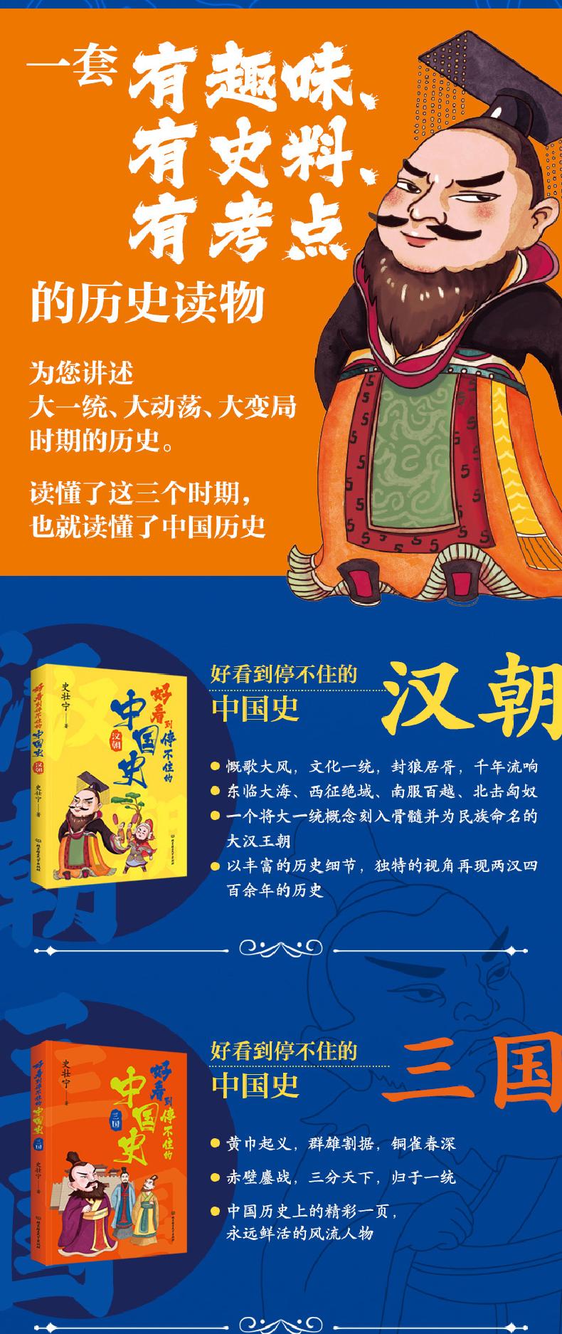 这是一套面向普通读者的历史读物,全套书共4册,分别为讲述了汉朝、三国、两晋时期的历史,这三个历史时期分别代表了中国历史上的大一统、大动荡、大变局时期的历史,读懂了这三个时期,也就读懂了中国历史上治乱更替演进的规律。成人看,有趣味,有深度;孩子看,有笑点,有考点。