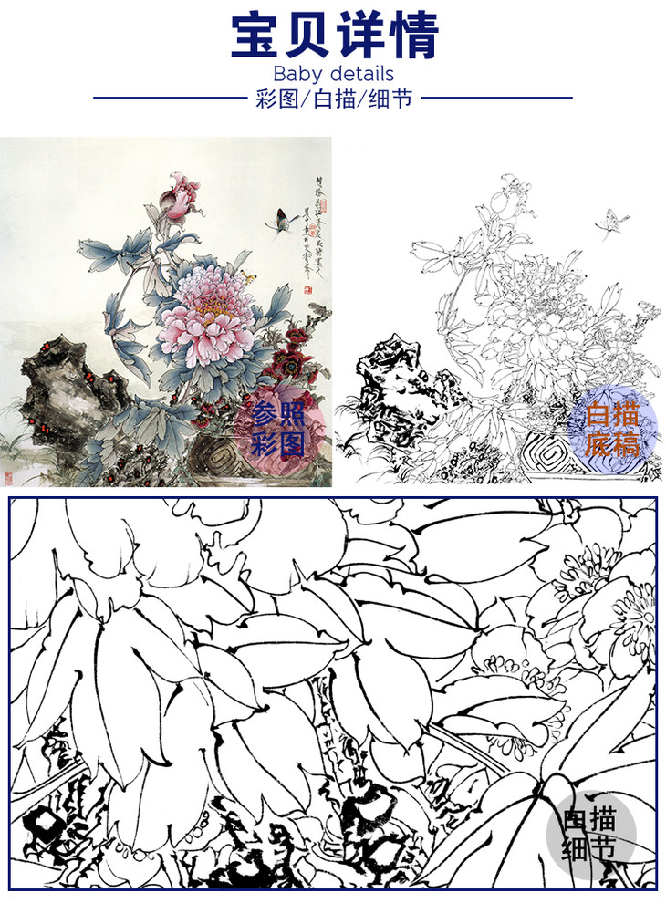 工笔花鸟白描底稿-王道中牡丹《赵粉》斗方小品册页-多种白描尺寸可选-QS13