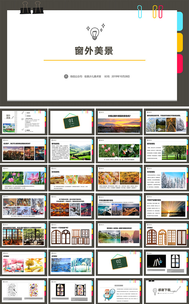 通过欣赏图片和结合生活场景,了解窗外美丽的风景,感受生活中随着季节的变换景色也随着变化。注意画面的疏密和大小的对比,形成构图上的美感,同时学习色彩搭配练习,感受不同的色彩搭配营造的氛围不同。
