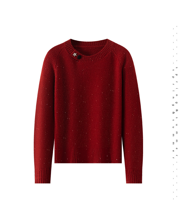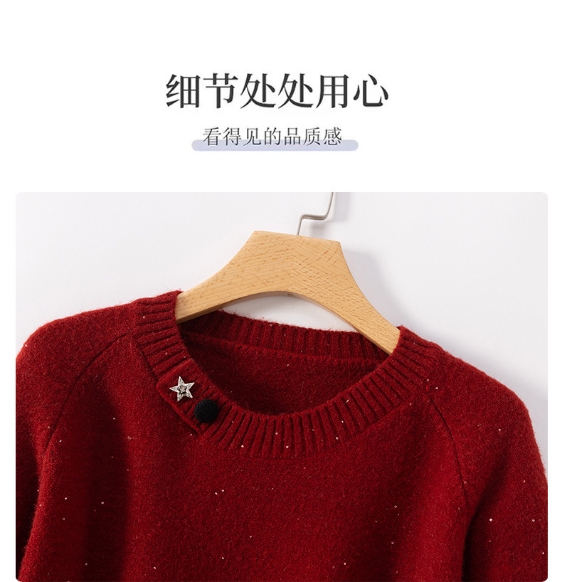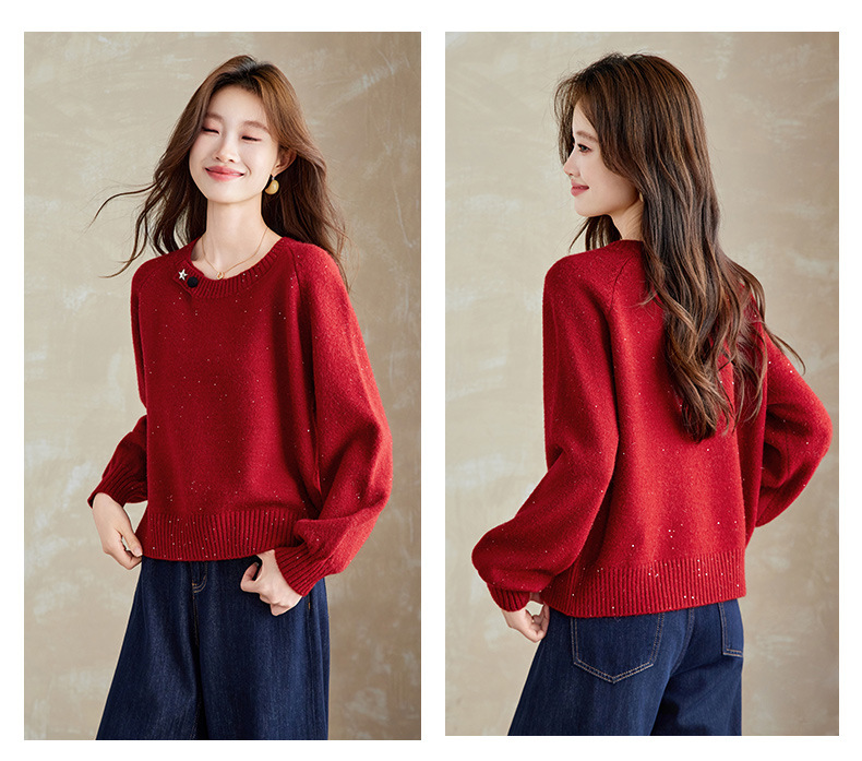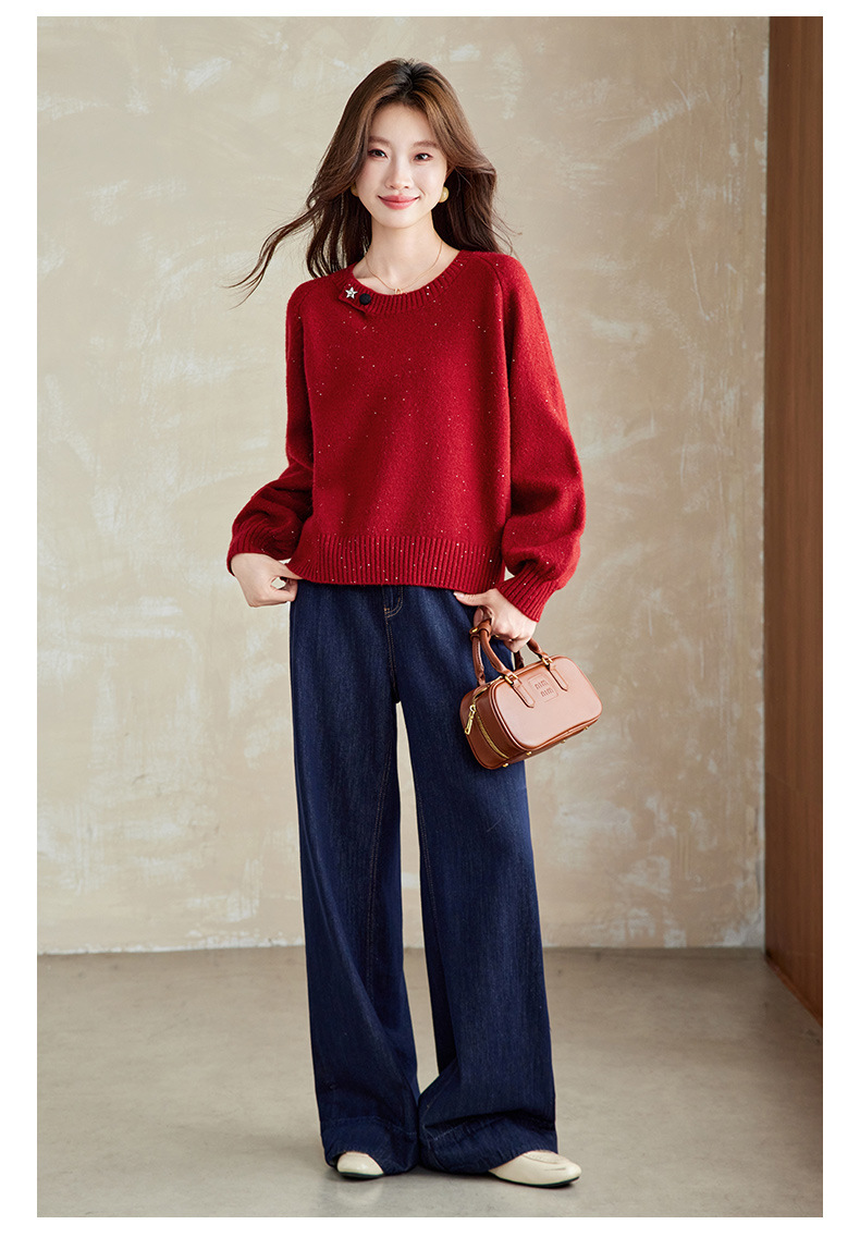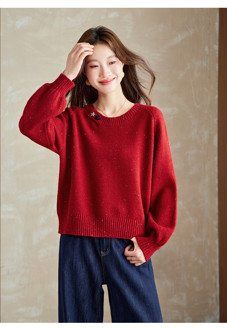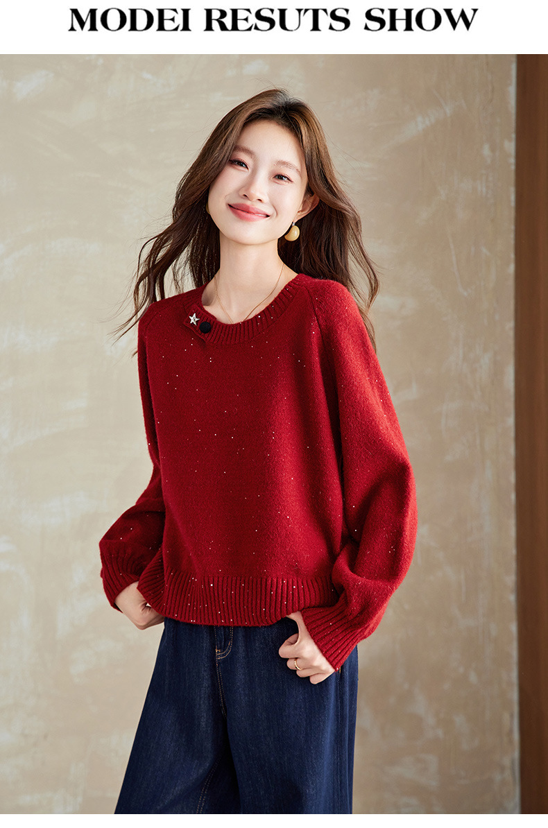 CC慵懒风圆领毛衣女套头秋冬宽松红色针织衫设计感小个子气质打底衫