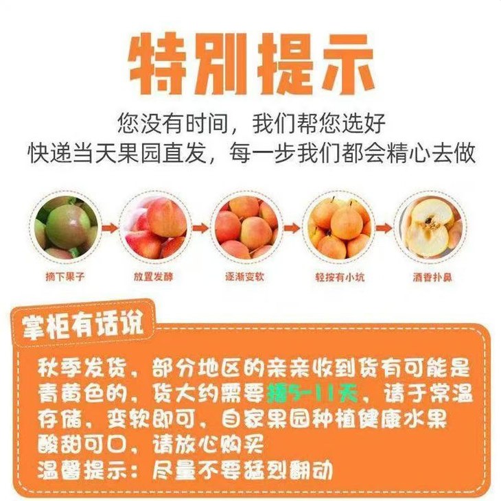 品名:正宗鞍山南果梨 规格1:5斤中果家庭装(净重4.5斤;单果71~90g;约30枚左右;以重量为准) 规格2:5斤大果家庭装(净重4.5斤;单果91~130g;约20~24枚;以重量为准) 规格3:4.5斤大果礼盒装(净重4.5斤;单果91~130g;约20/24枚);拍几份发几个包裹,不一定能同时到达,请耐心等待 发货地/产地:辽宁 包装方式:纸箱@礼盒装 物流信息:默认中通快递,不支持指定快递 发货区域:新疆、西藏、宁夏、青海、云南、海南不发; 物流详情:周六、周日及节假日除外,正常48小时内发货,到货时间约为2~5天,请耐心等待 售后说明:收到货后有质量问题,在24小时内都可以拍照(坏果+快递单面箱子一起拍)上传,申请按坏果比例理赔或联系客服,生鲜性质特殊,不支持7天无理由退换货;因地址错误,手机号联系不上,拒收等造成的损失无法售后,请理解; |