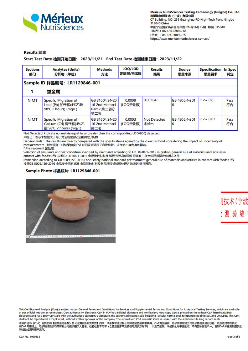 砂锅做了重金属迁移检测,铅迁移量为0.00304 mg/L,远远小于国家限量要求0.8 mg/L,镉迁移量为未检出。