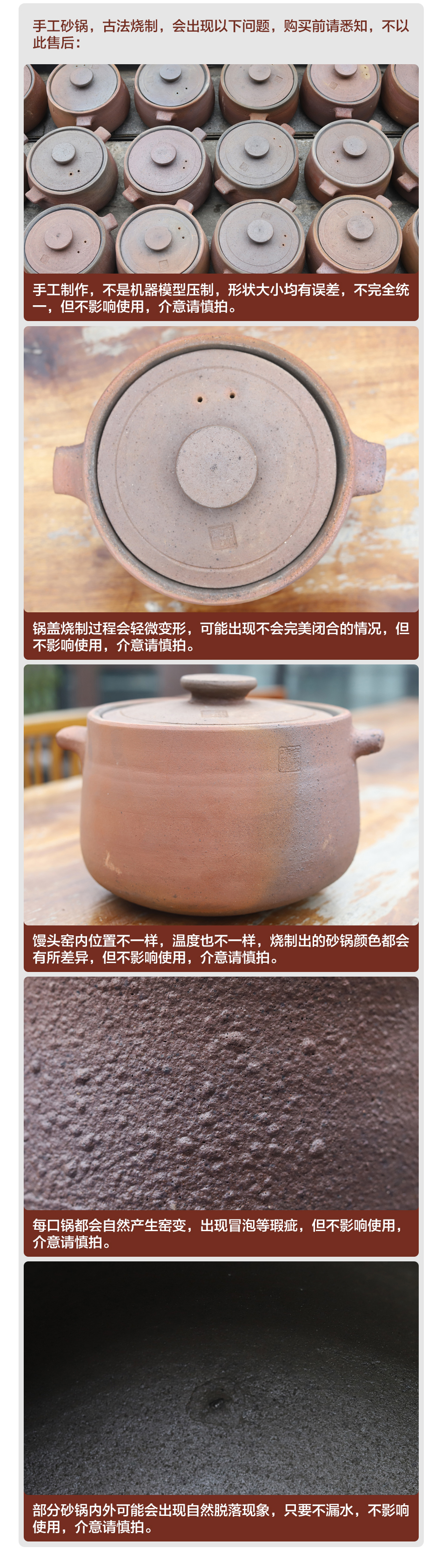 1、此款砂锅,为萦经老师傅手工制作,馒头窑明火烧制10小时,无论如何都会有或多火烧的窑变,而且非机器制作,非电烧制,所以瑕疵与优点都非常明显,介意勿拍。