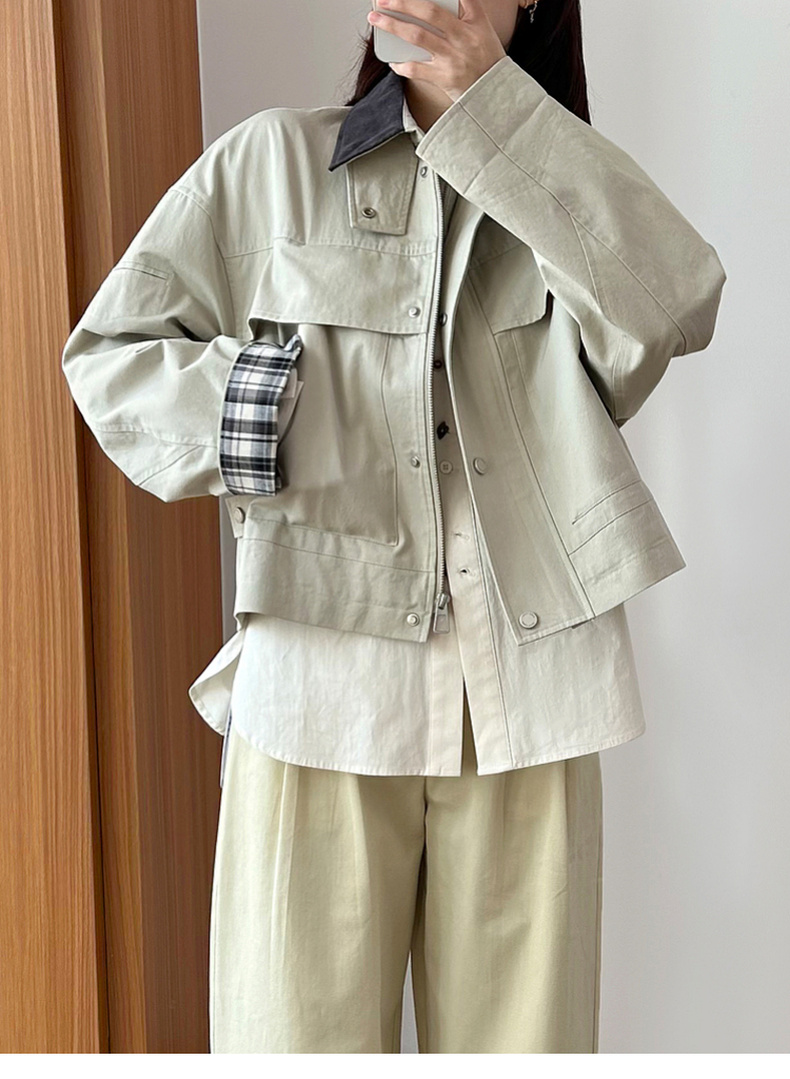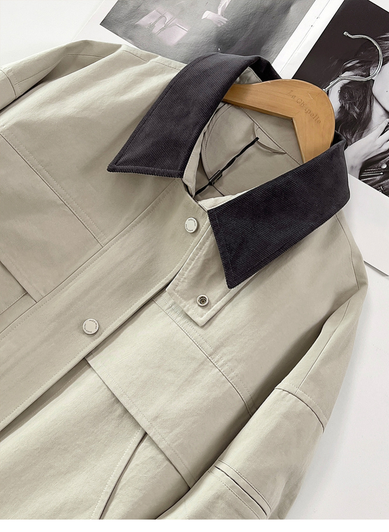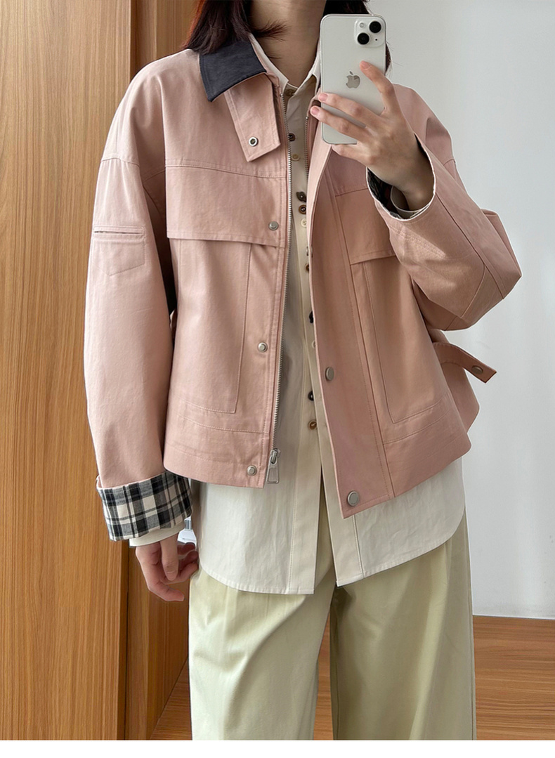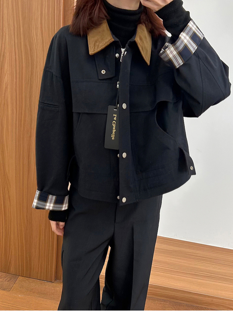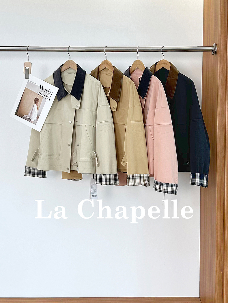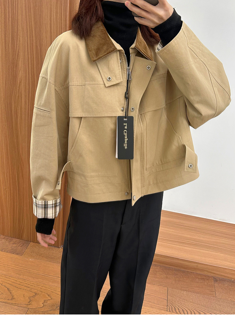 专柜实拍【巴恩工装风】拉夏贝尔/La Chapelle轻奢设计师款!撞色翻领拼接宽松百搭小个子短外套