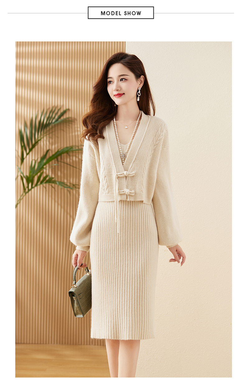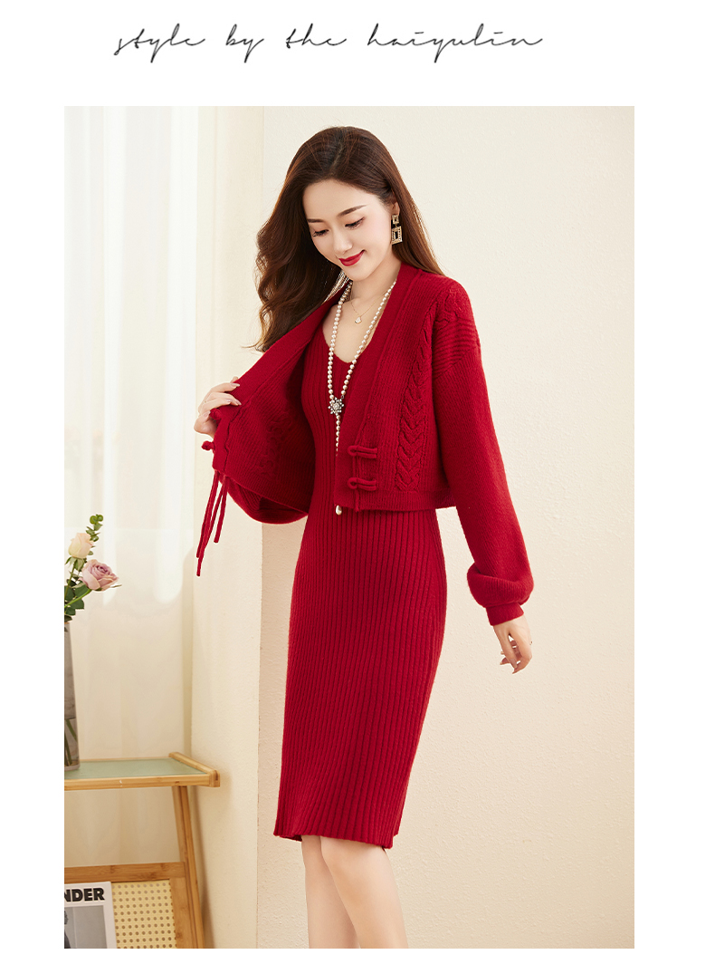秋冬季新款,洋气时尚花苞袖新中式双盘扣两件套连衣裙HR-YBER333