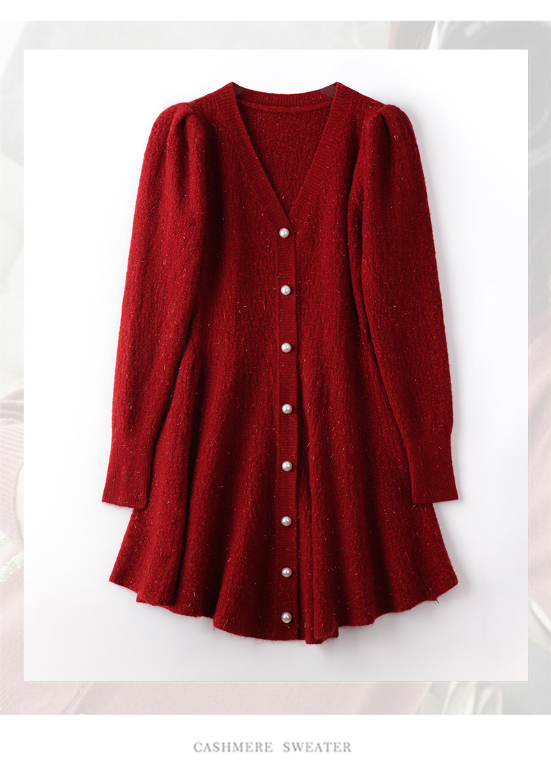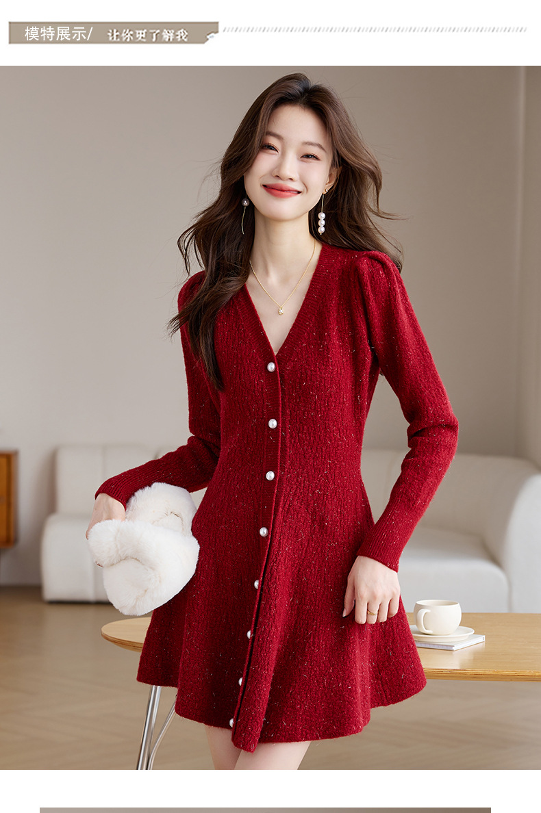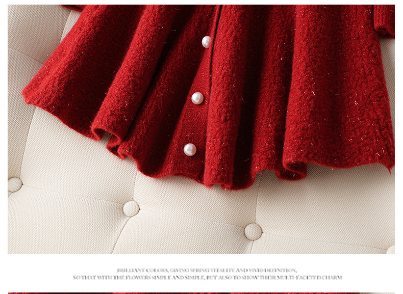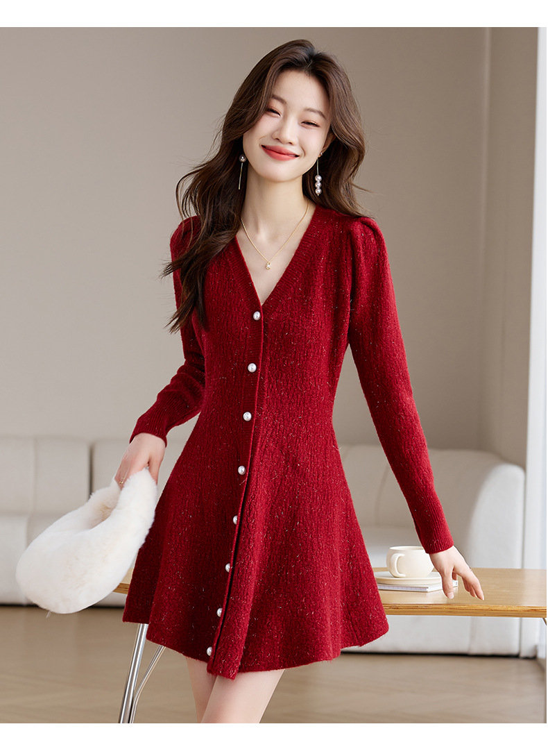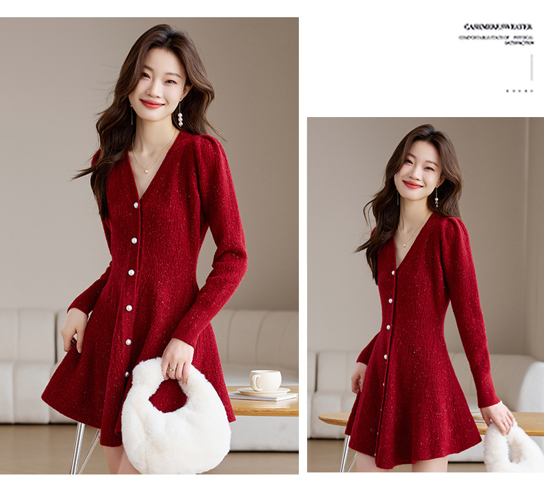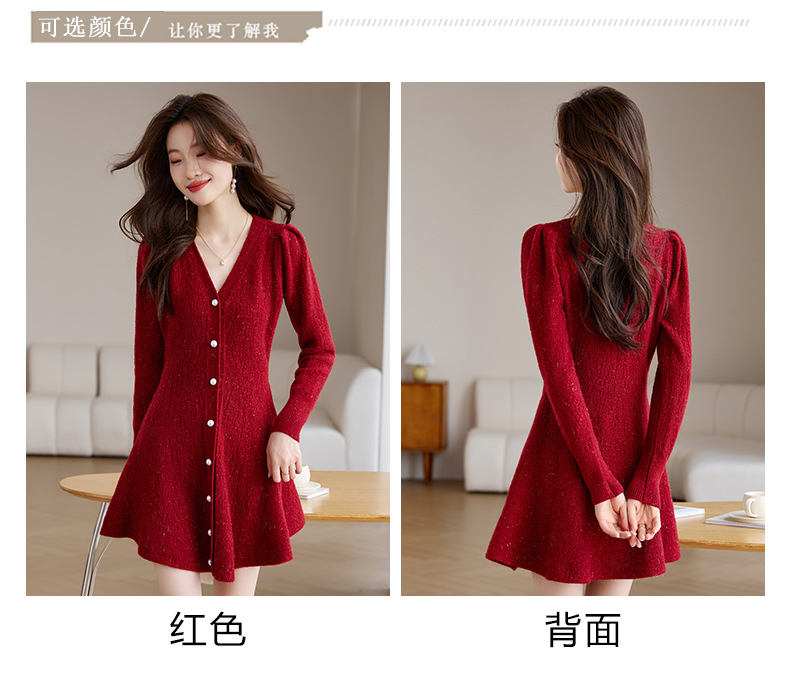 本命年红色金丝公主针织裙收腰单排扣毛衣裙JC398