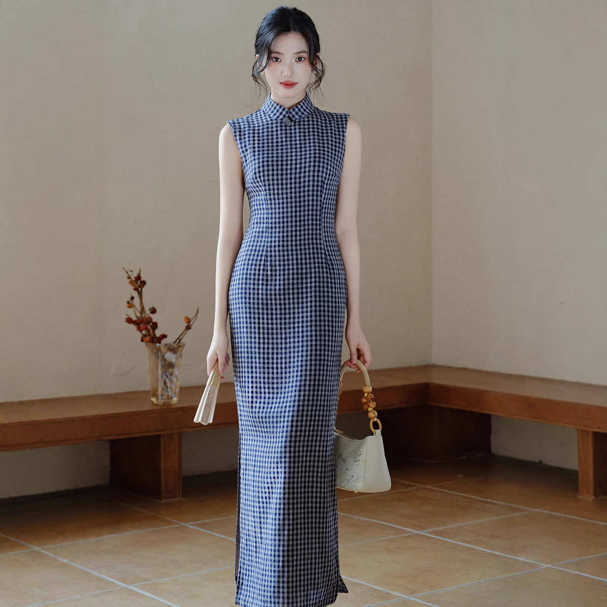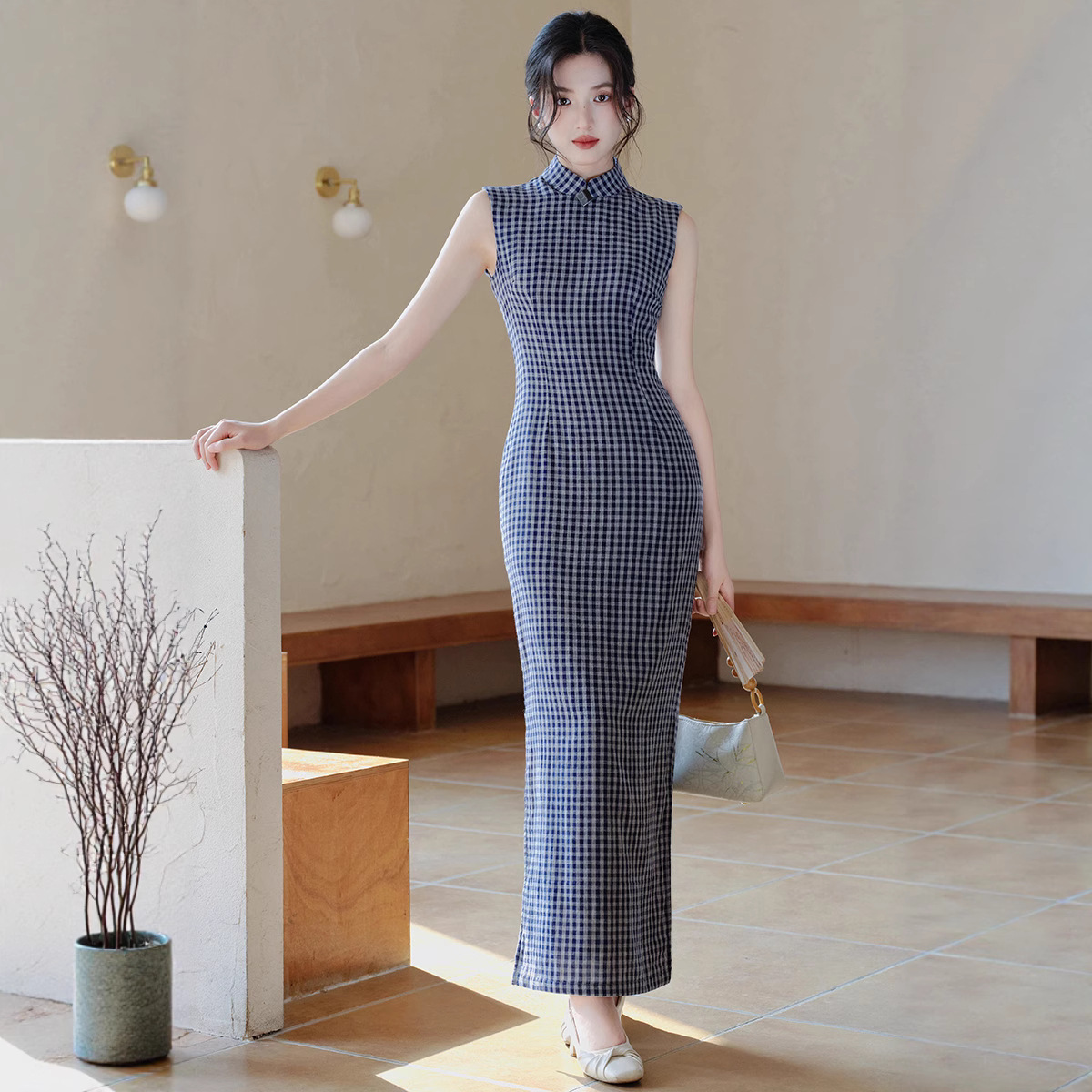 民国大小姐无袖旗袍改良年轻款日常可穿夏季复古素雅格子连衣裙女