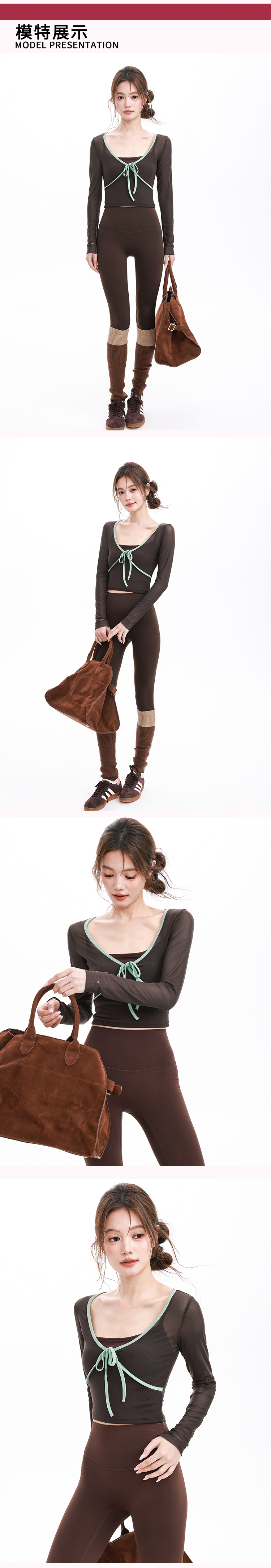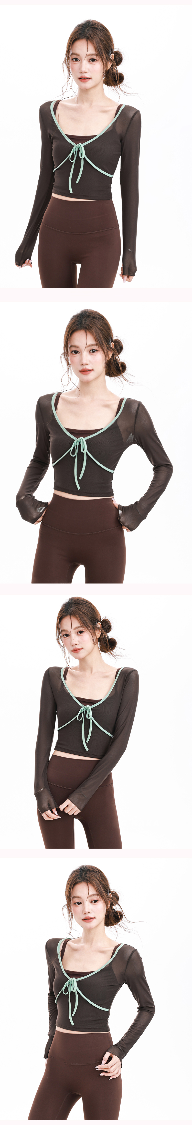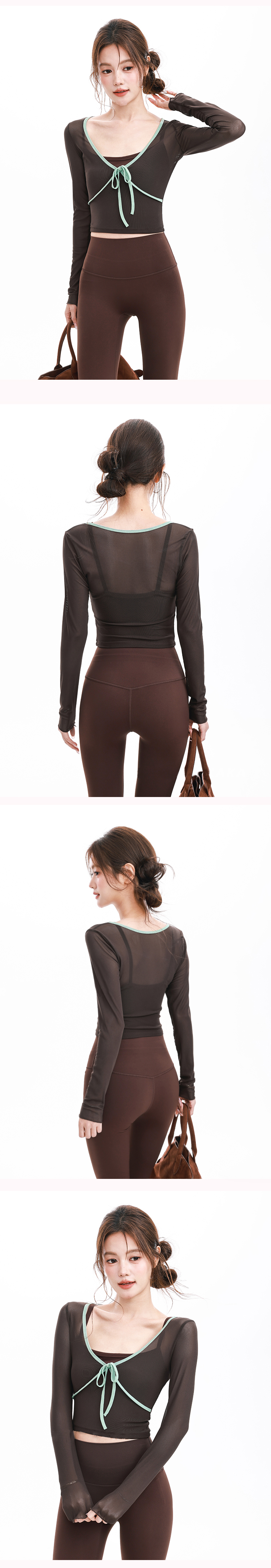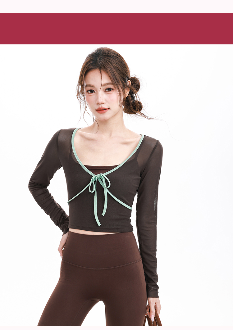 跃牌【禅语梵心】假两件撞色蝴蝶结网纱运动T恤女长袖带胸垫瑜珈服上衣CX5723