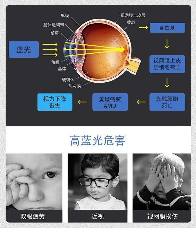 长时间在不良光线下用眼,会造成双眼疲劳,像近视、视网膜损伤这类问题,都是蓝光惹的祸!