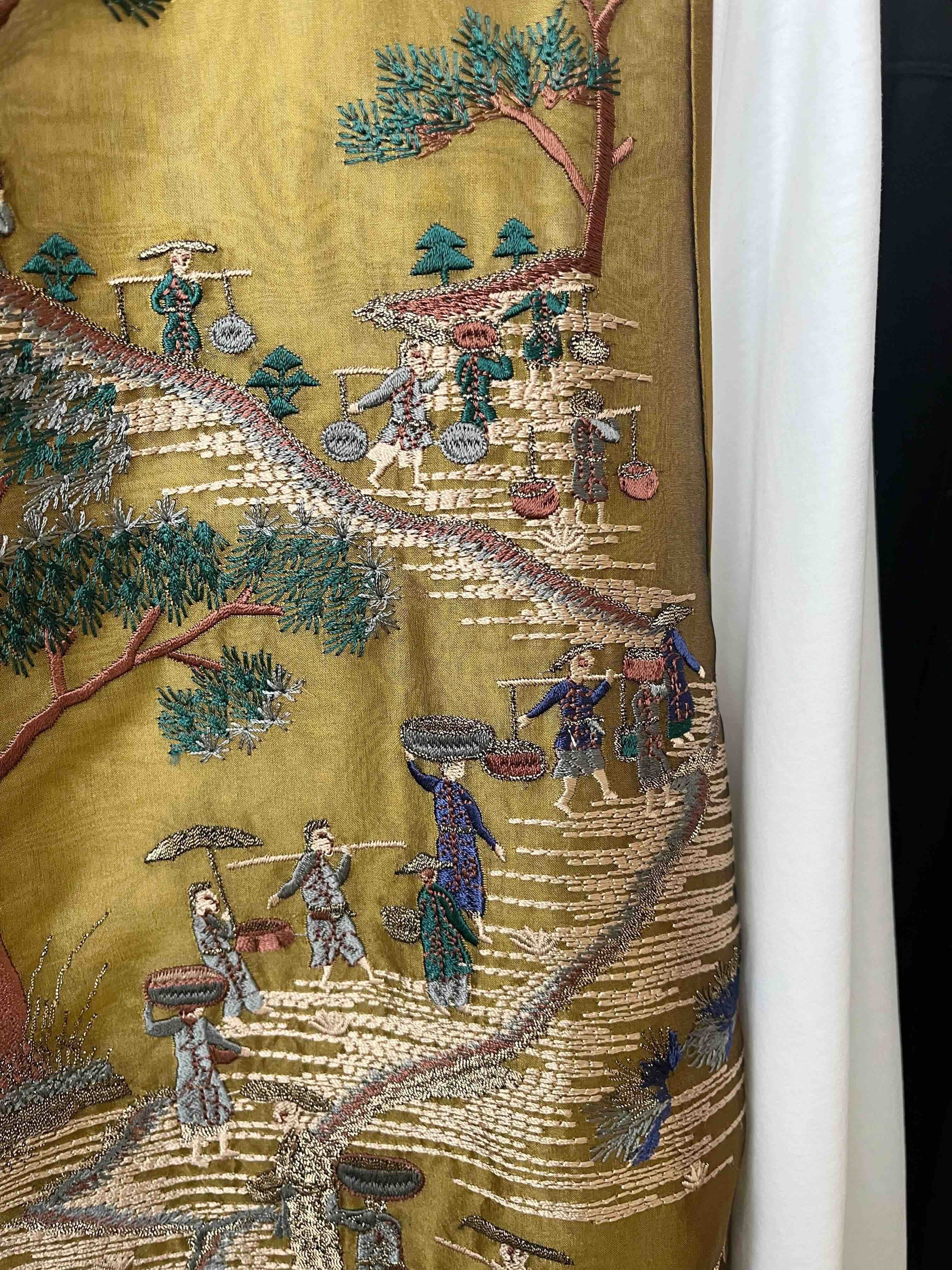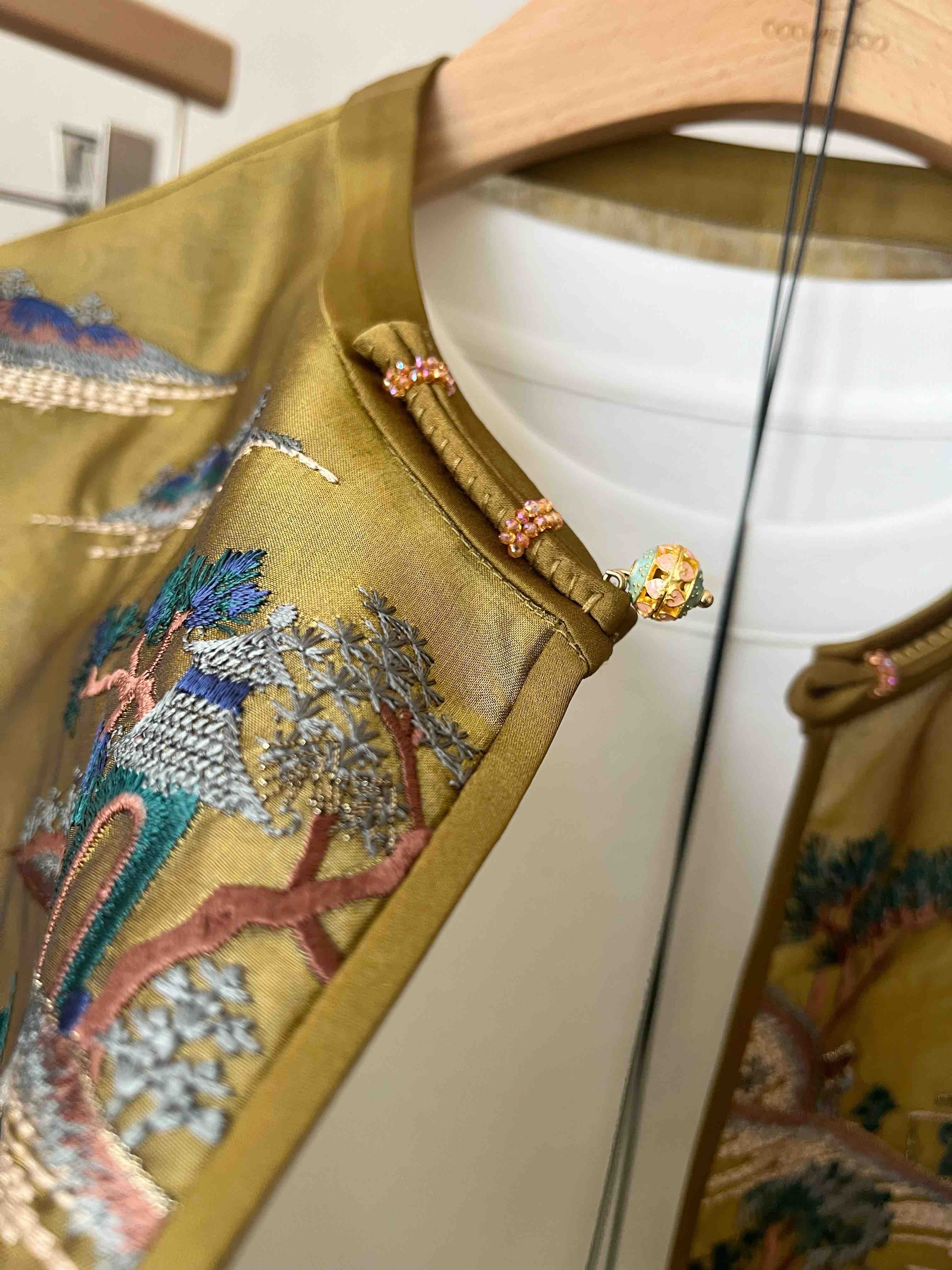 “穿它出门,像把一幅宋画披在身上——黄是宫墙秋阳暖,绣是檐角燕尾斜,风过处,皆是东方含蓄的美。”
