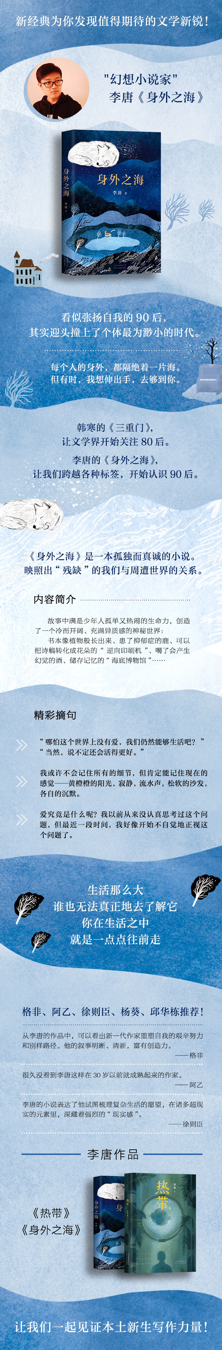 90后一代崛起的文学新声音——“紫金·人民文学之星”小说奖得主李唐备受期待的长篇力作《身外之海》,探究“残缺”的我们与周遭世界的关系。“每个人都有各自的困惑、苦恼和伤痛,每个人都有不同程度的‘残缺’,都有无人理解的孤独。而我们生活在一起,本质上就是抱团取暖。我们可能无法真正地理解彼此,但在某个时刻,我们都可能成为彼此活下去的勇气与力量。”