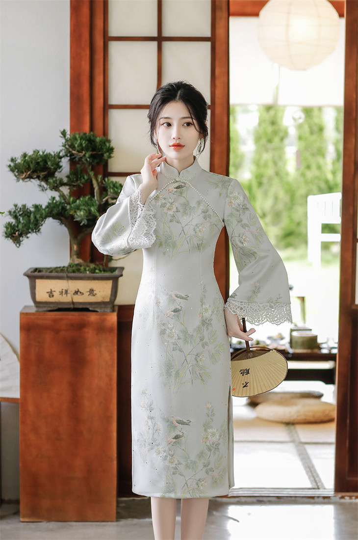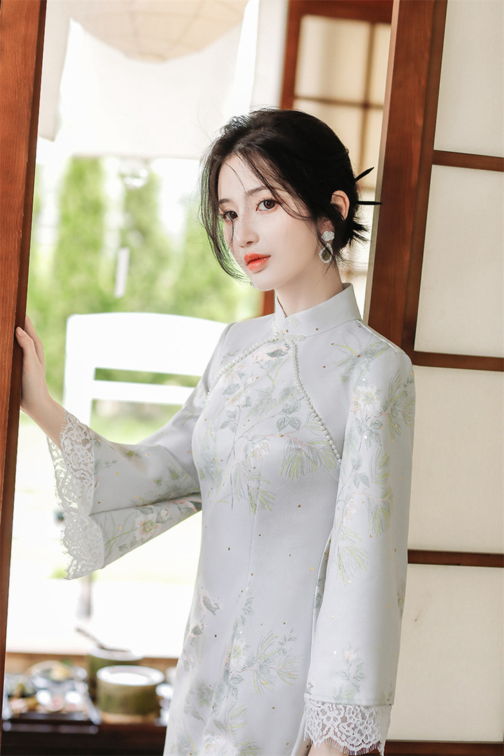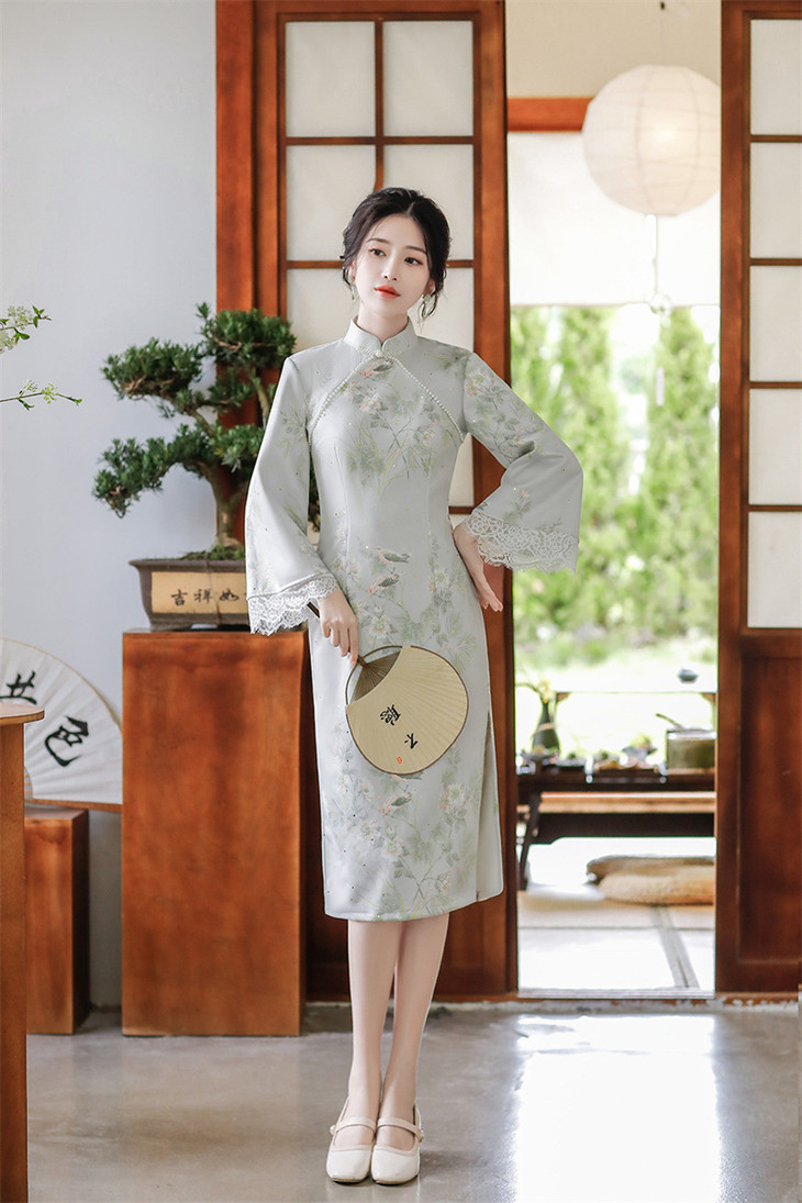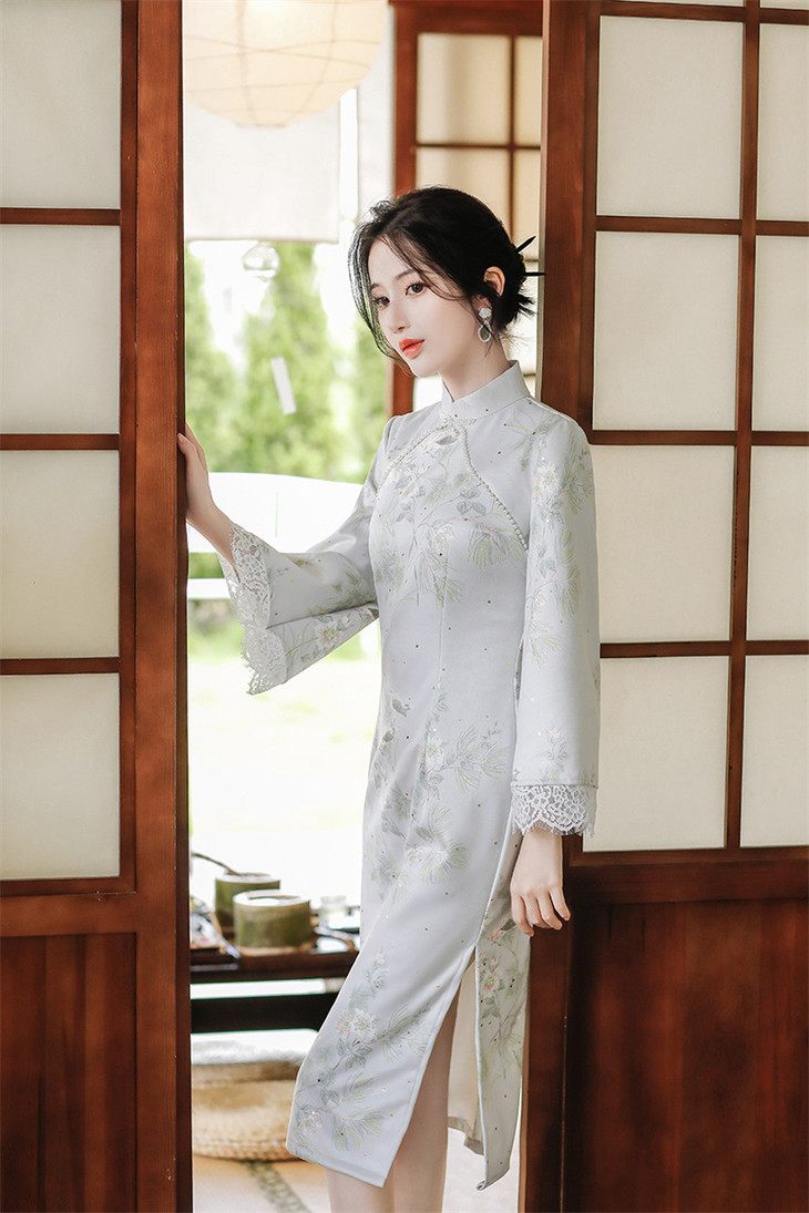 麂皮绒倒大袖中长款旗袍2022秋季新款时尚改良年轻少女长袖旗袍裙AQX-35
