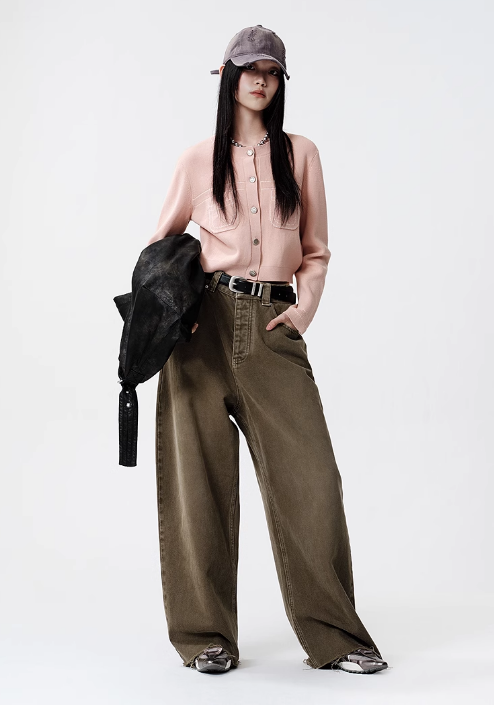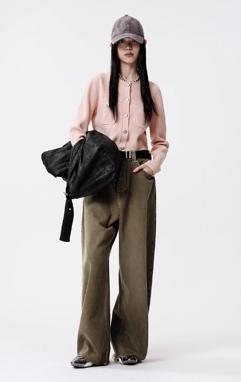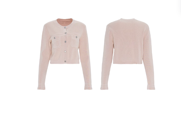 D63新品粉色圆领休闲宽松短款长袖针织开衫外套