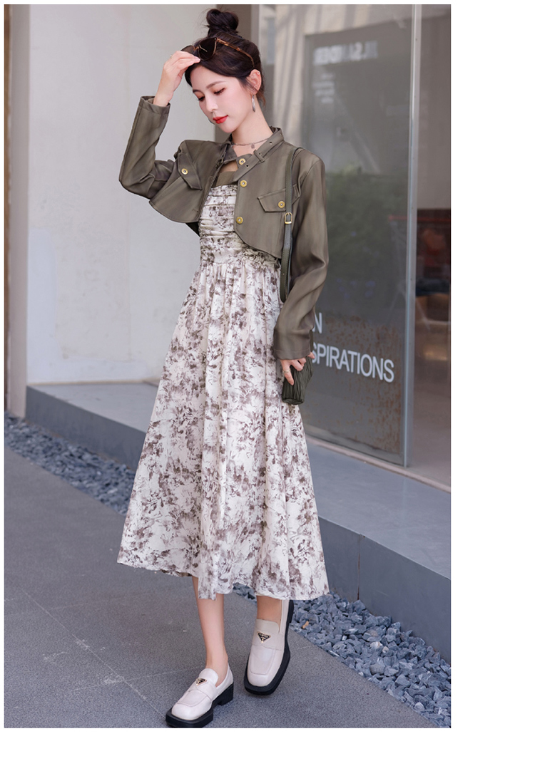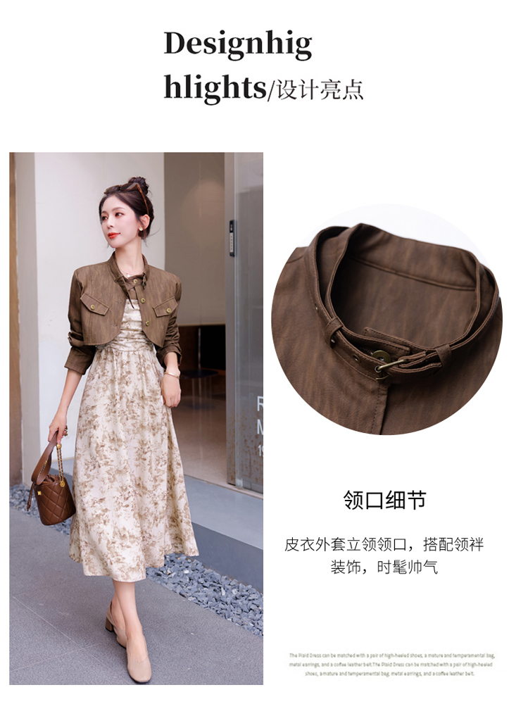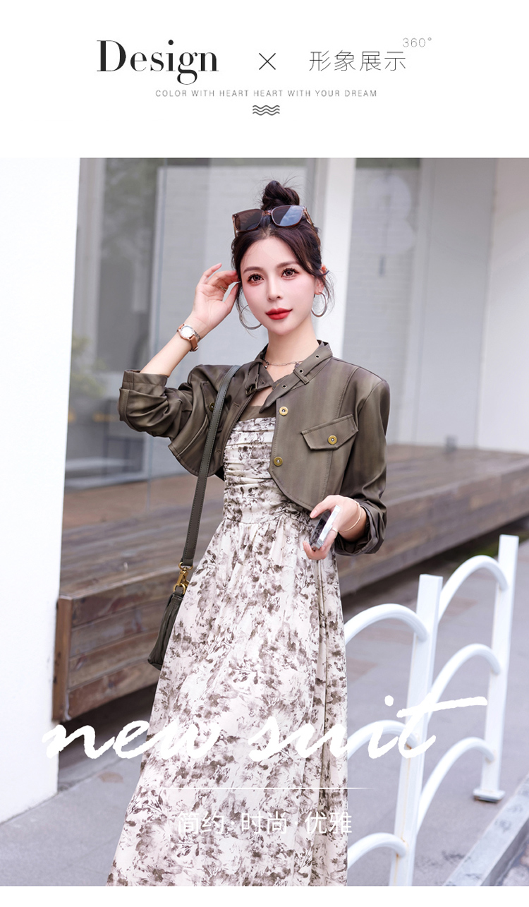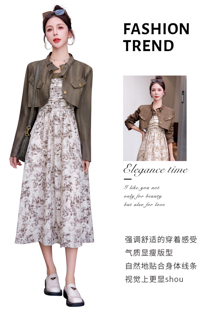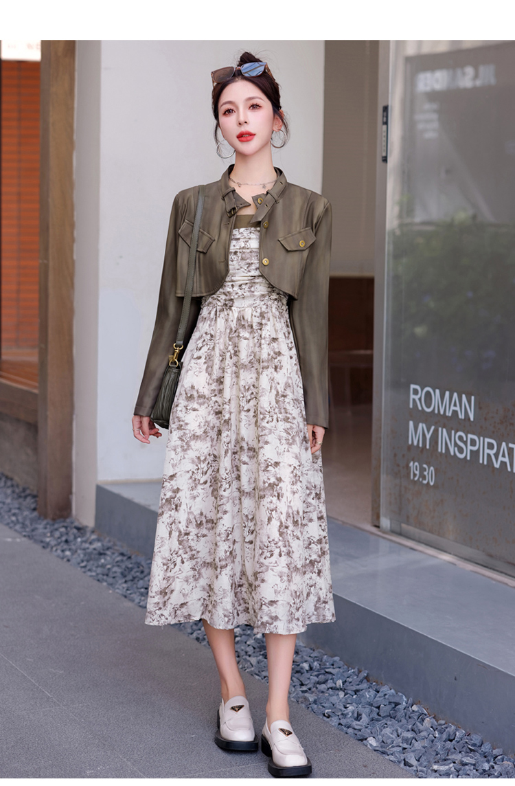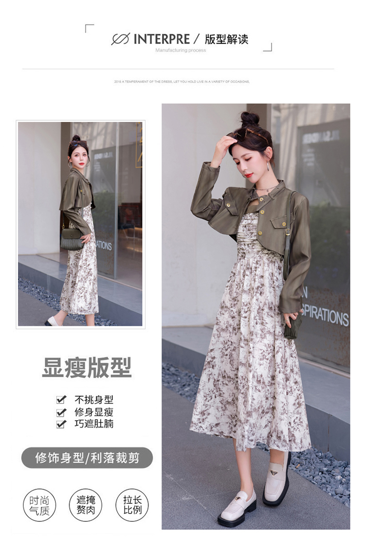 秋季新款,百搭皮衣外套+水墨画吊带连衣裙两件套HR-YJLY8011