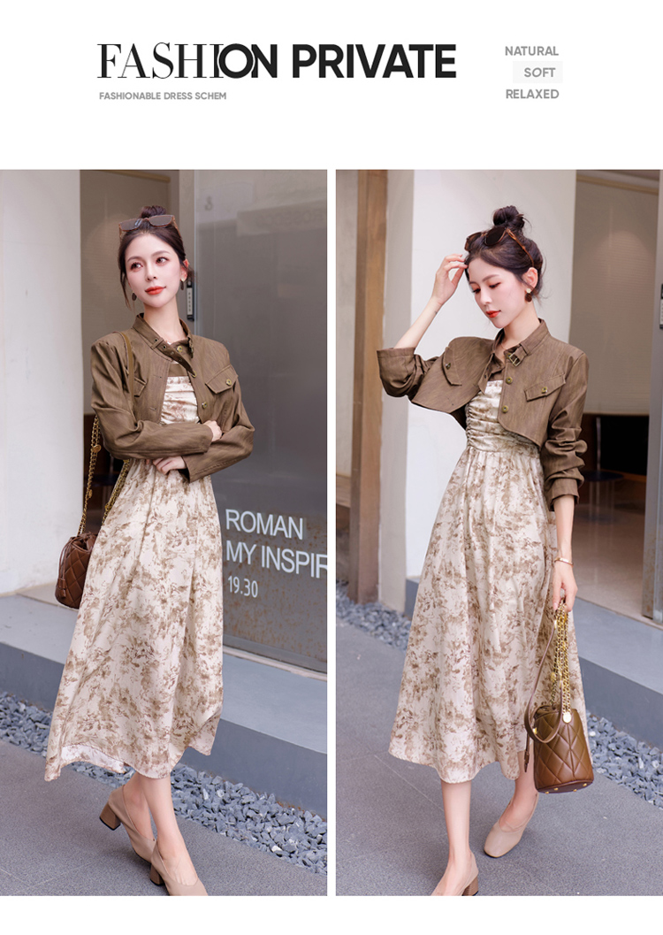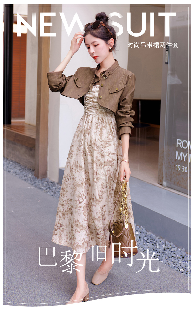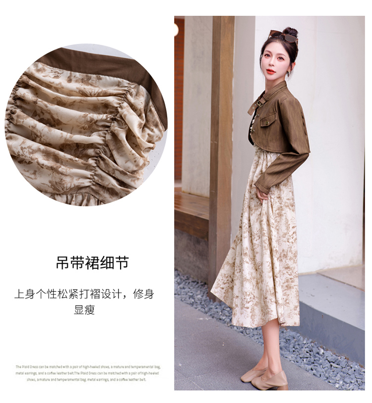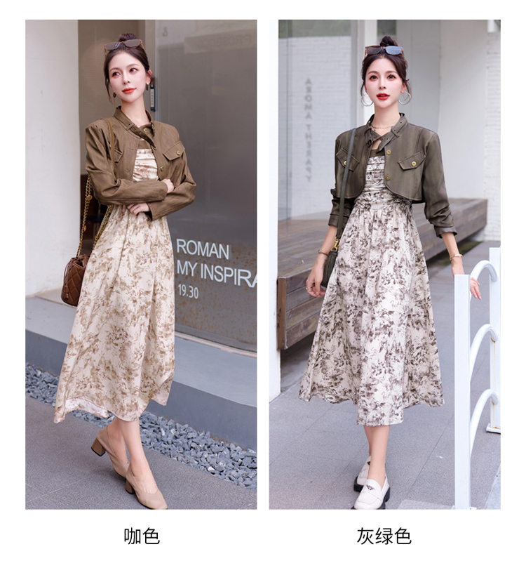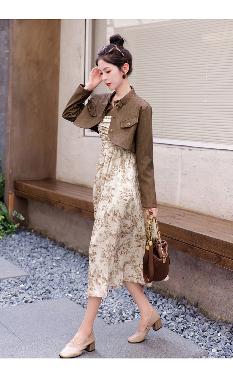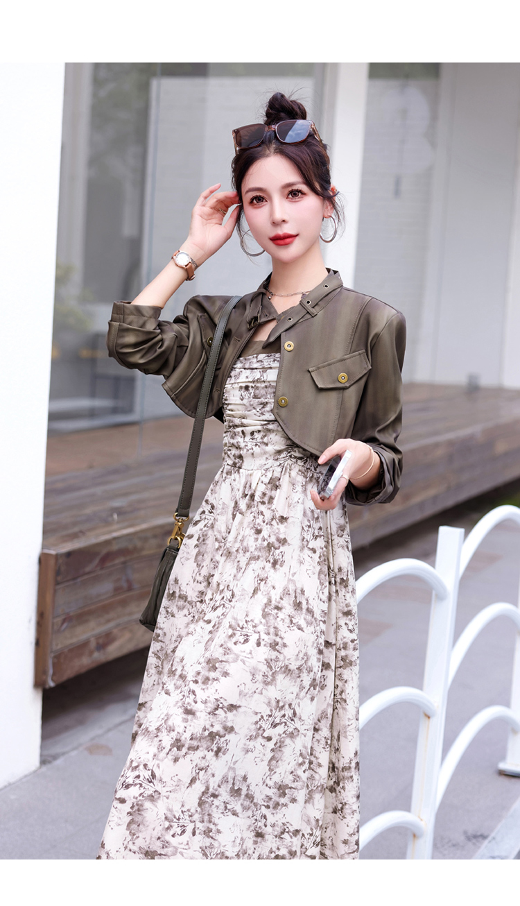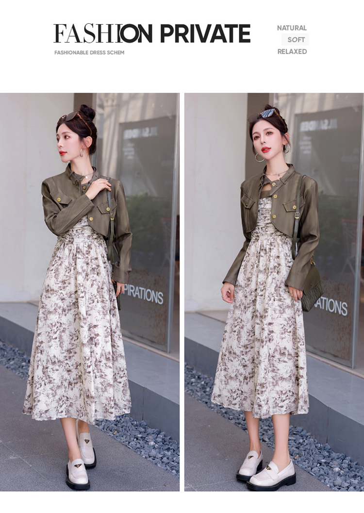 秋季新款,百搭皮衣外套+水墨画吊带连衣裙两件套HR-YJLY8011