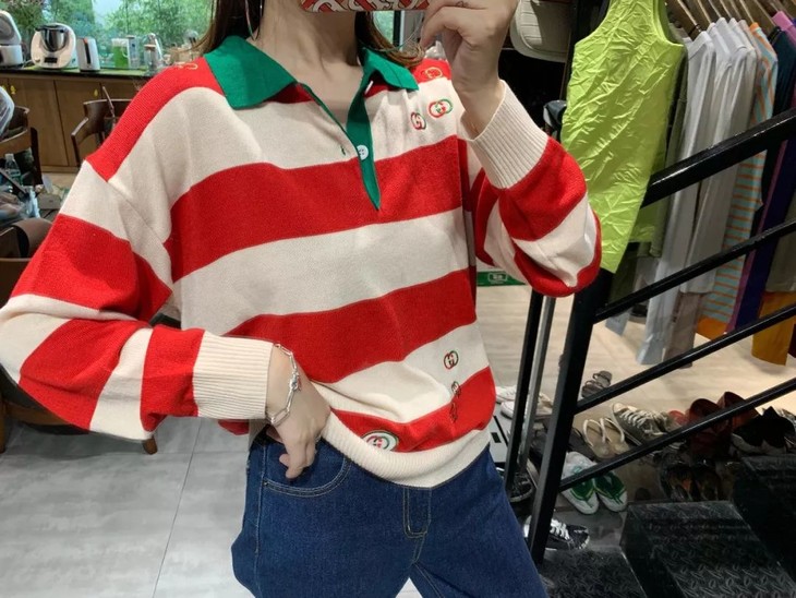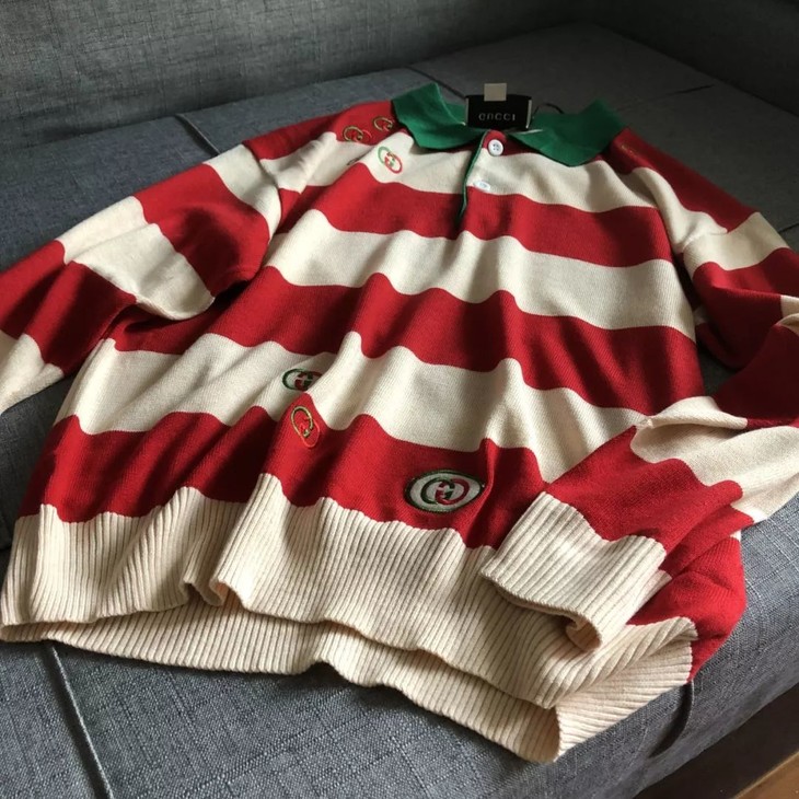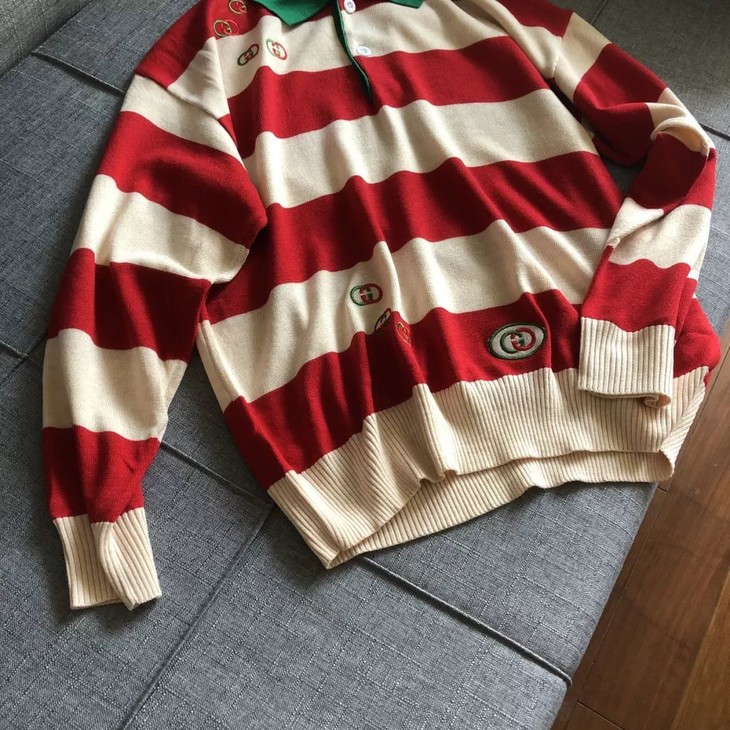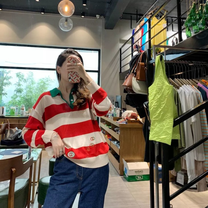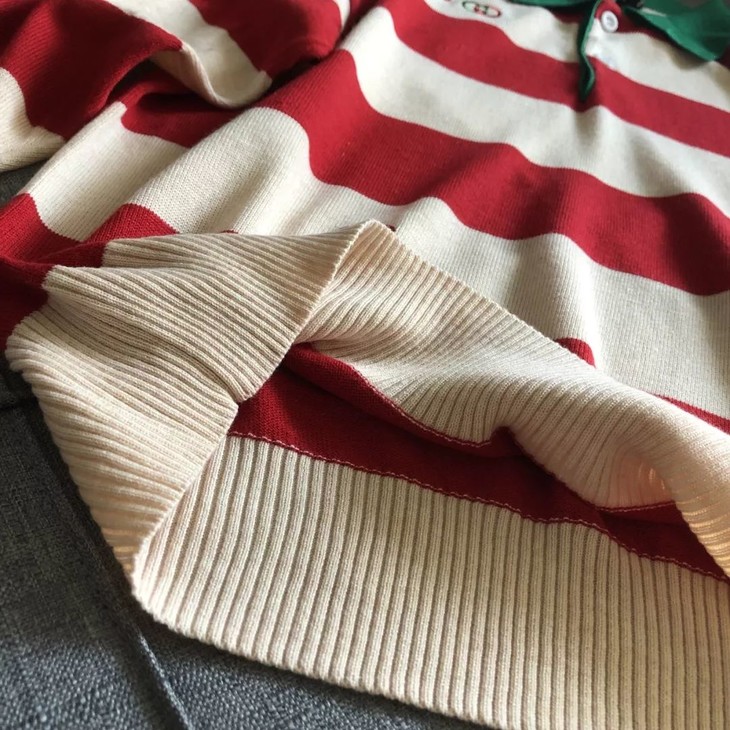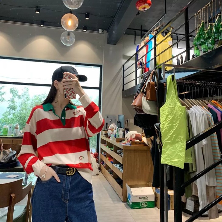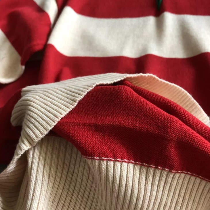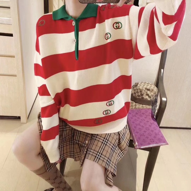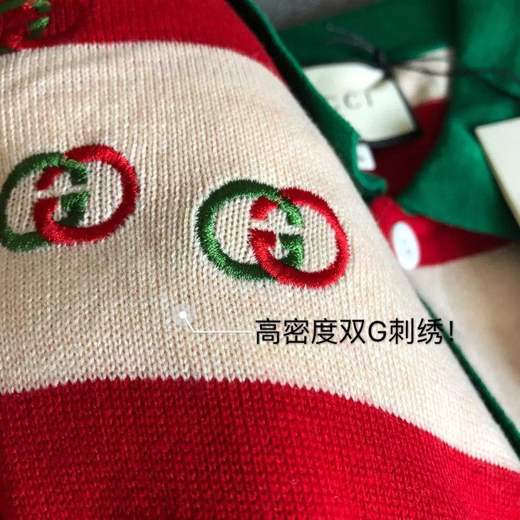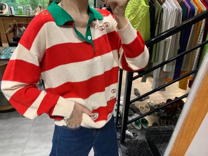 吸睛!宋妍霏机场同款!众多潮人、明星上身!G家撞色红色条纹绿领POLO针织衫毛衣!