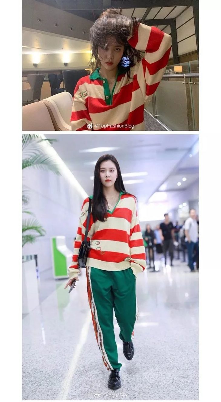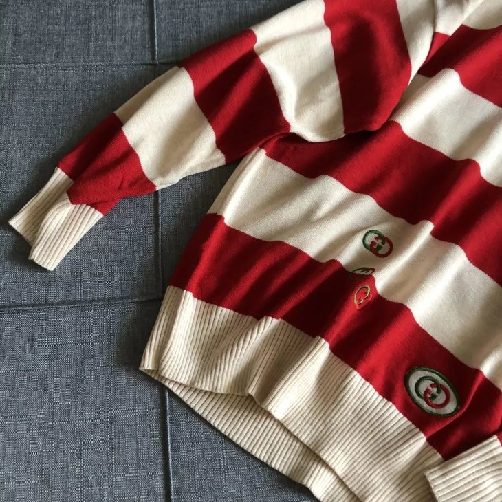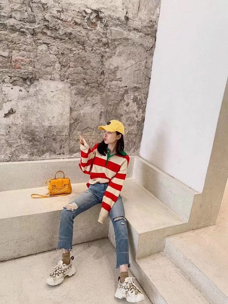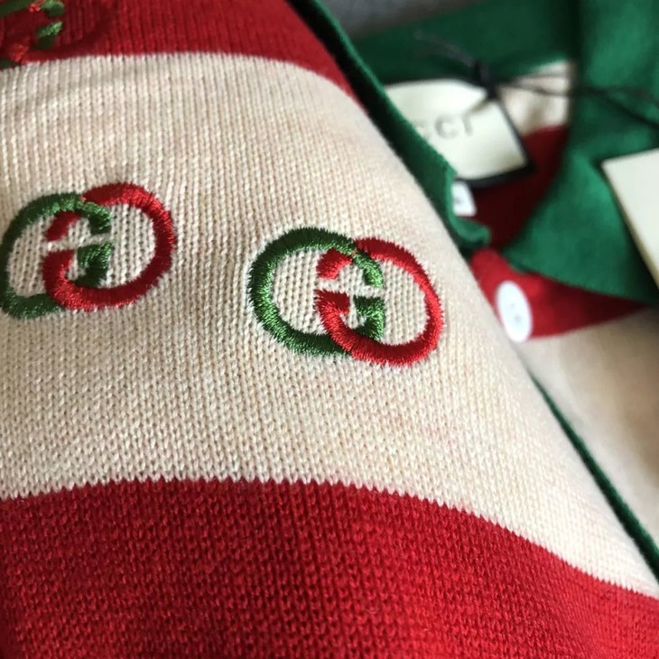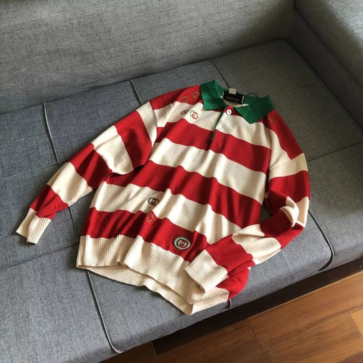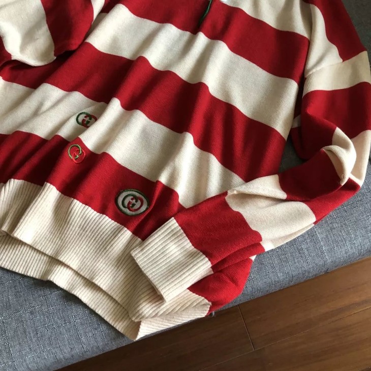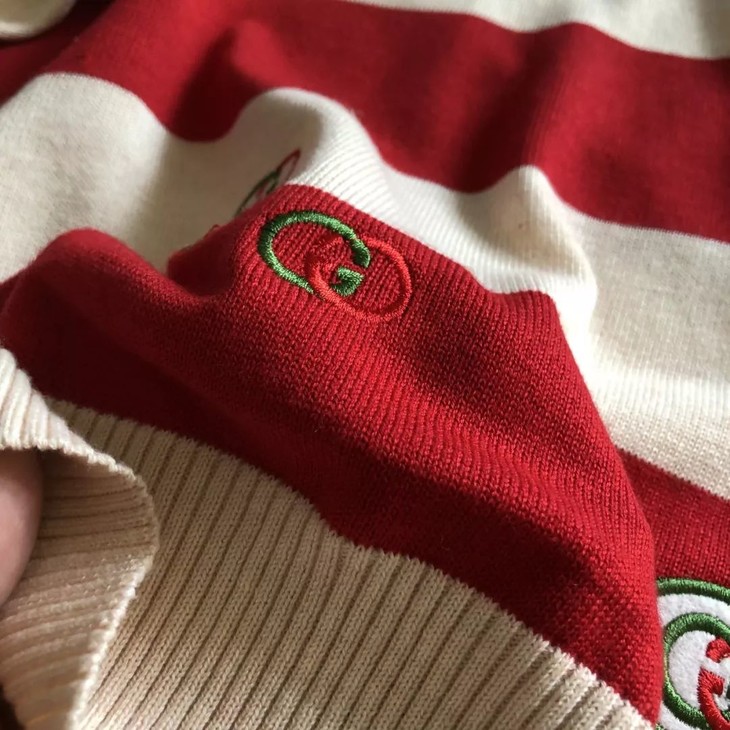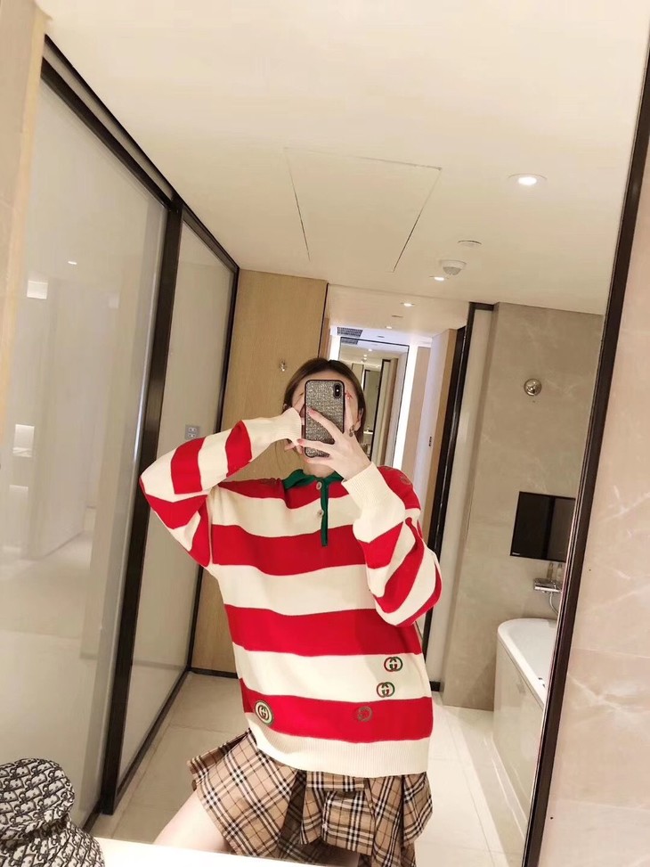 吸睛!宋妍霏机场同款!众多潮人、明星上身!G家撞色红色条纹绿领POLO针织衫毛衣!