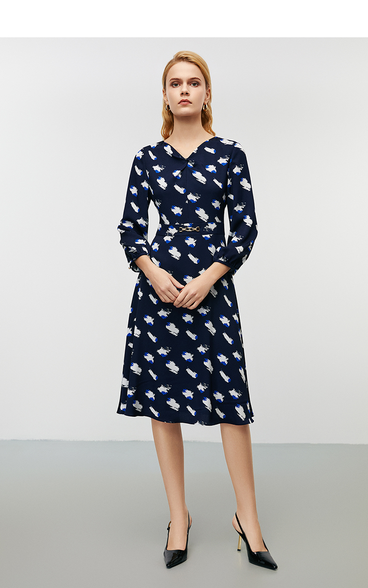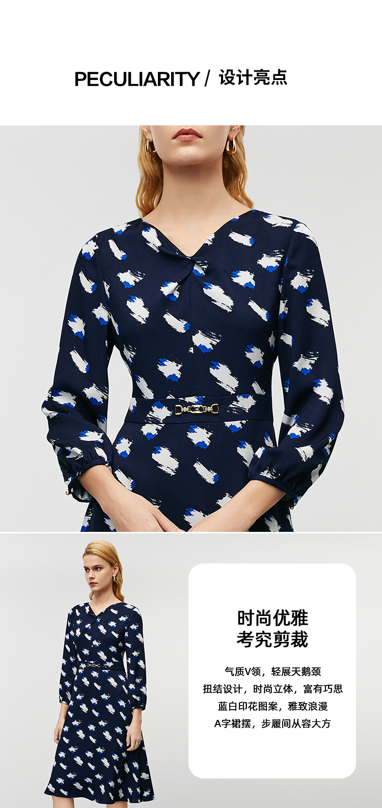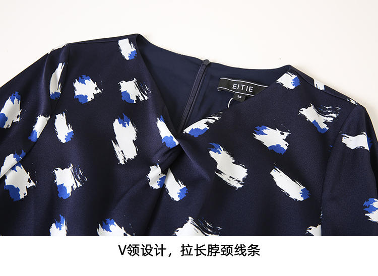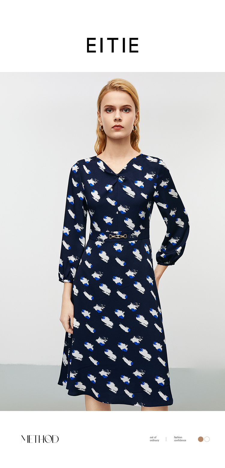 EITIE爱特爱收腰设计V领气质通勤印花连衣裙秋季新款7907629
