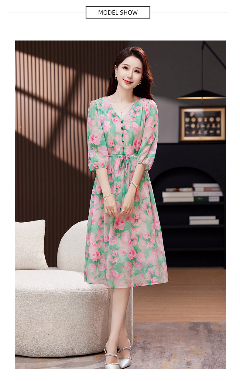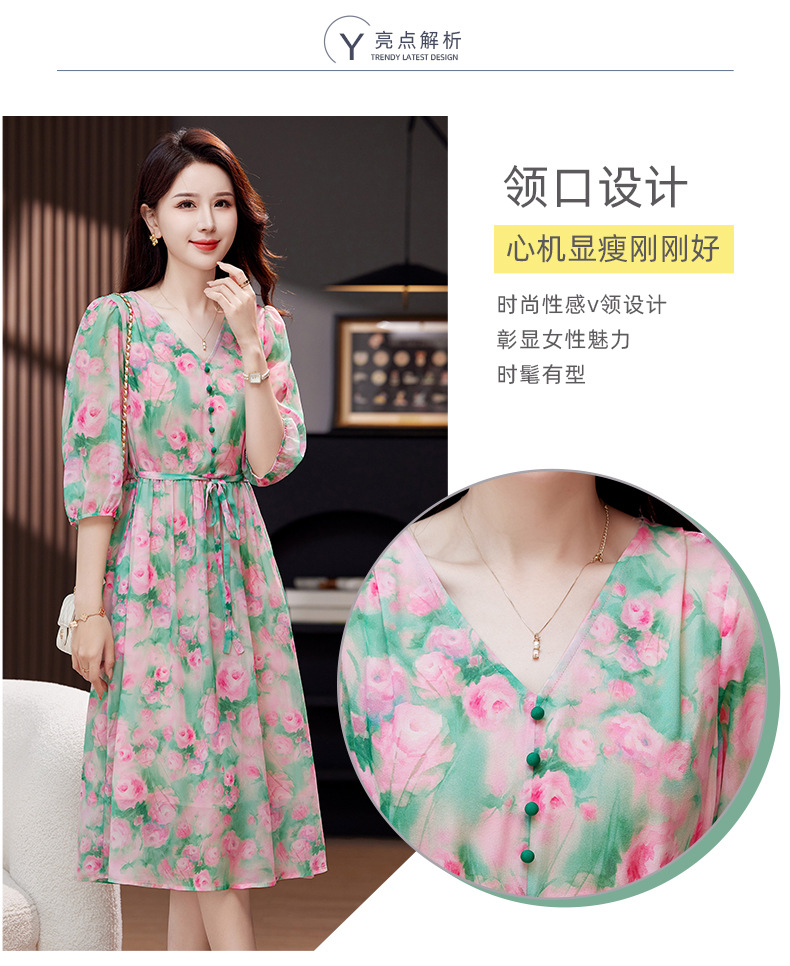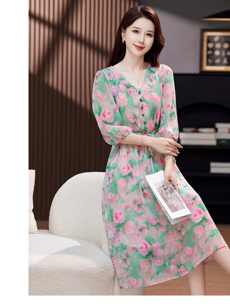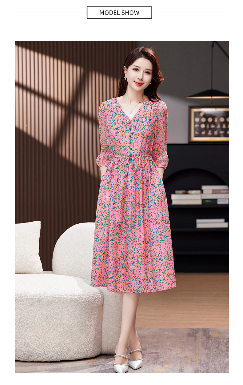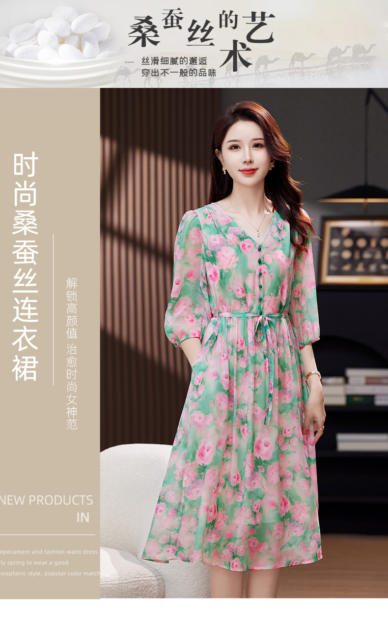 气质V领时尚印花,显瘦中长款桑蚕丝裙KQN- 9356