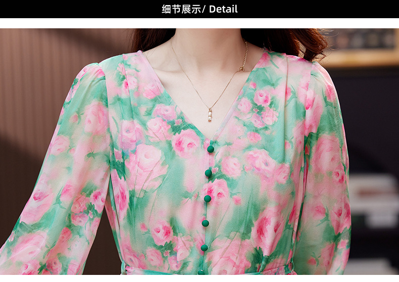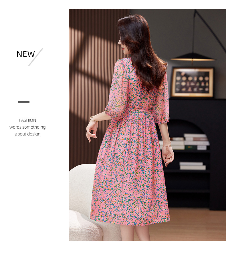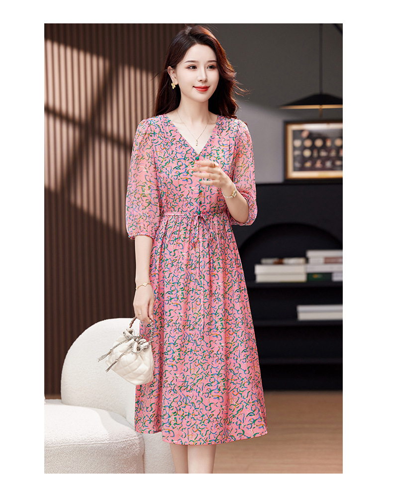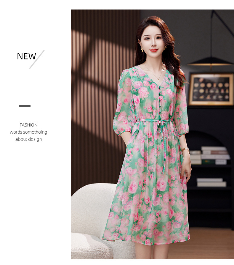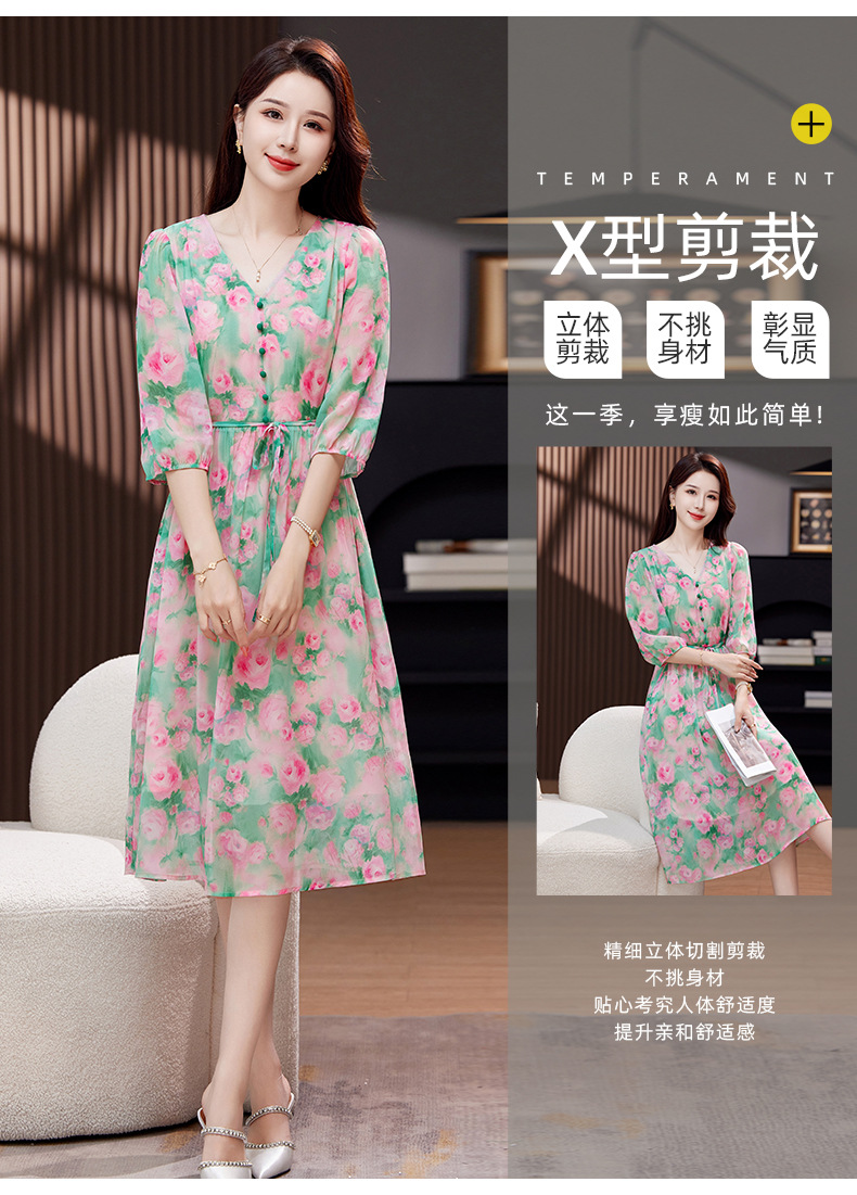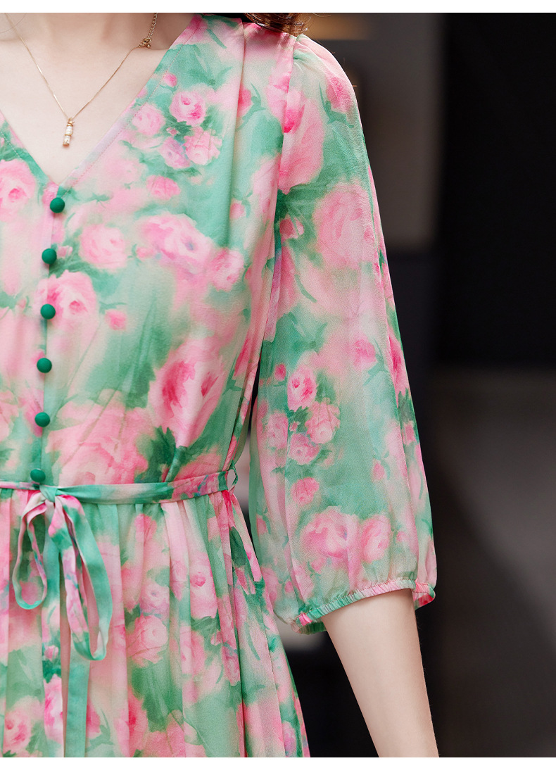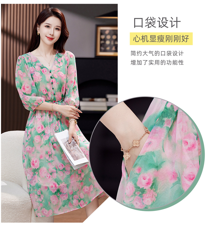 气质V领时尚印花,显瘦中长款桑蚕丝裙KQN- 9356